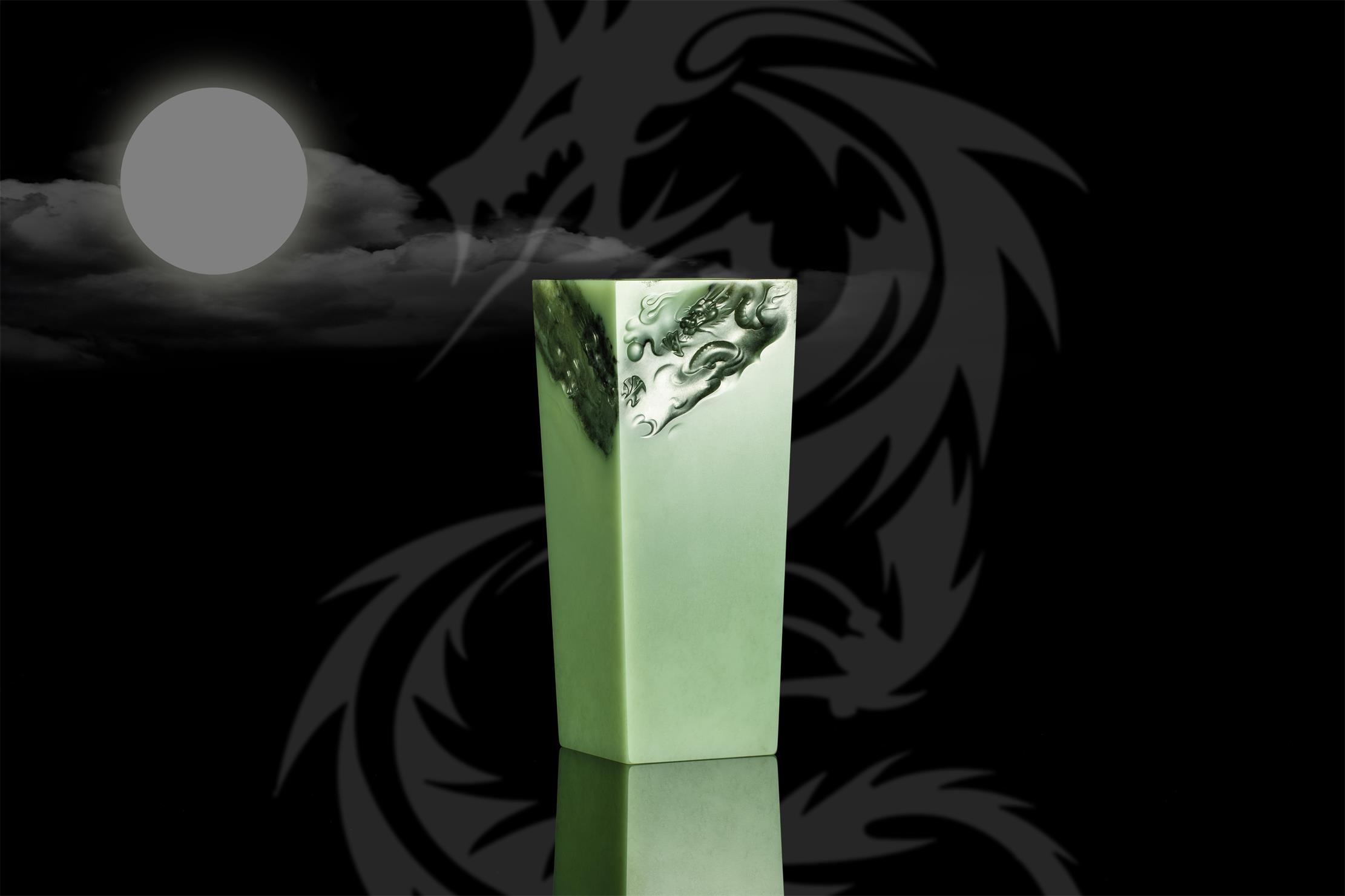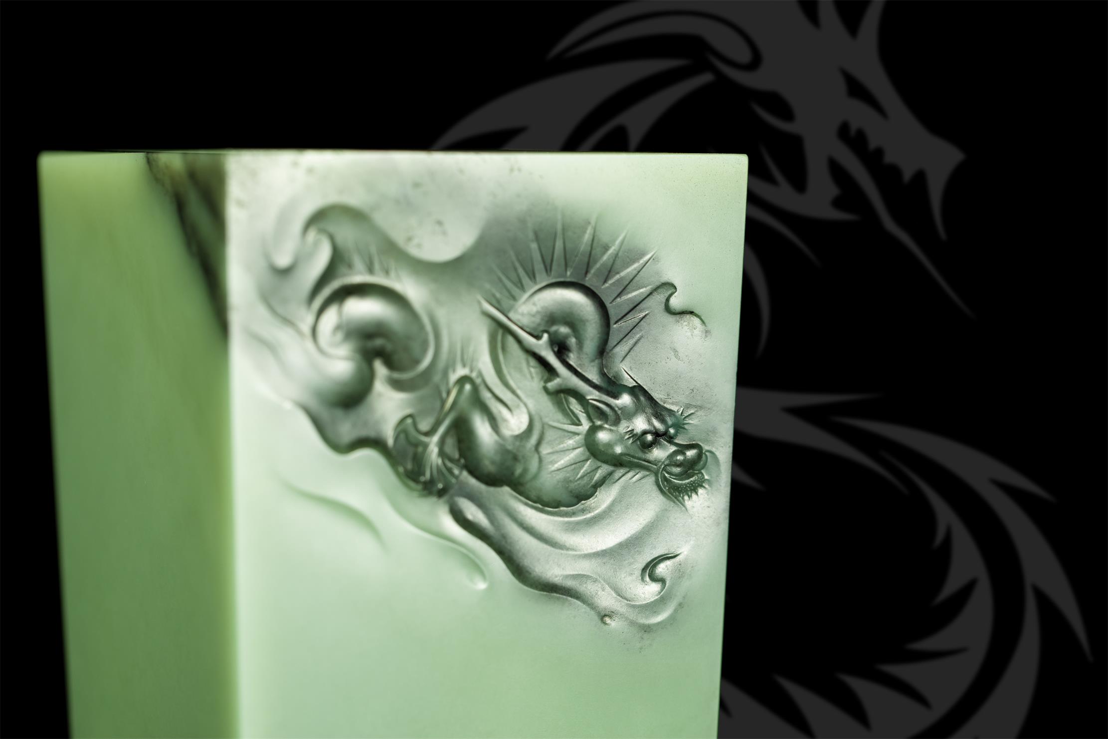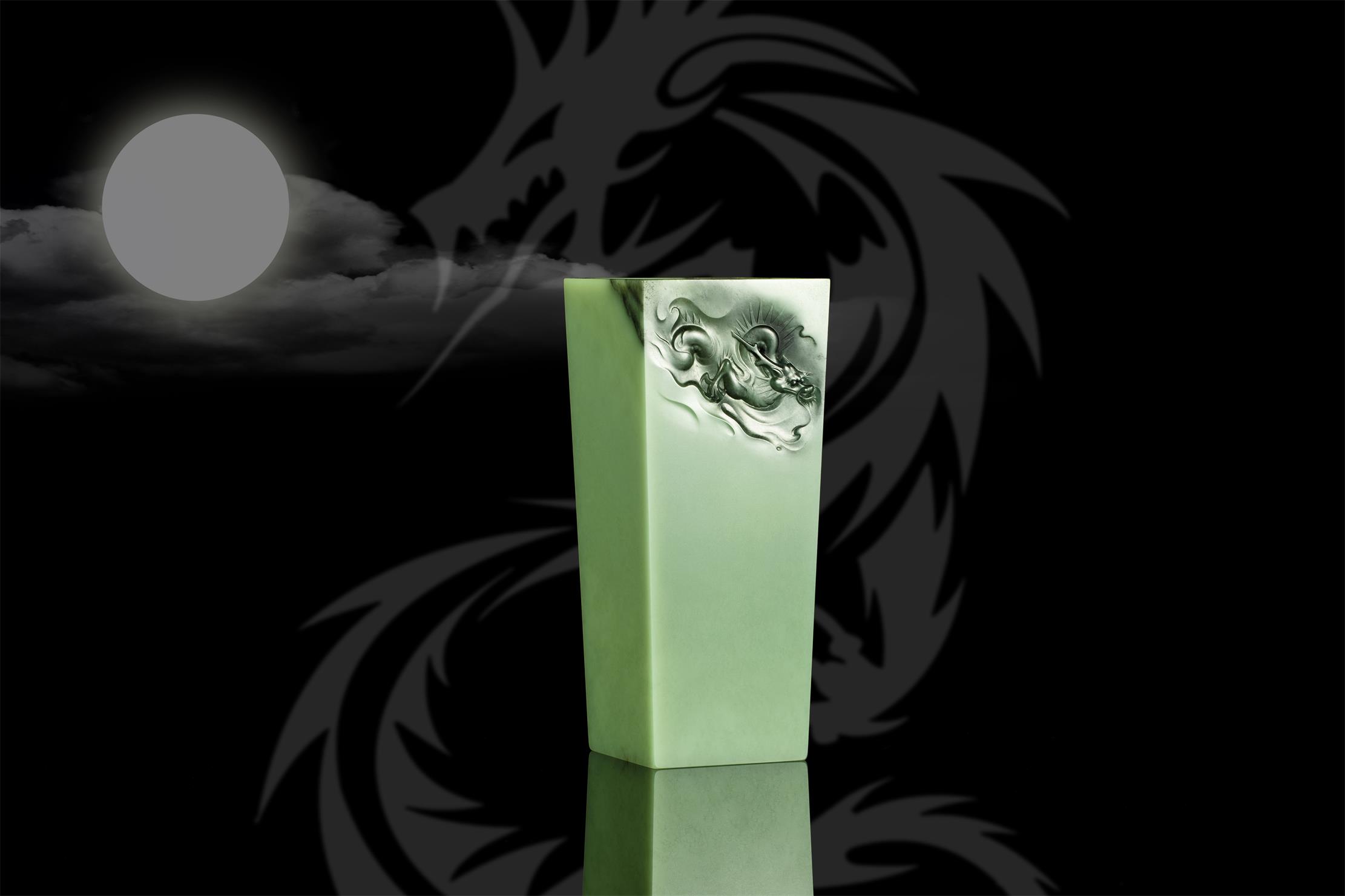 此长方形尊,乍看线条简单,四方笔直,干净的玉肉不做任何雕饰,只在尊口的两个斜角对称沁面上,雕刻两条在云端相对腾舞的巨龙,实则创作难度极大!