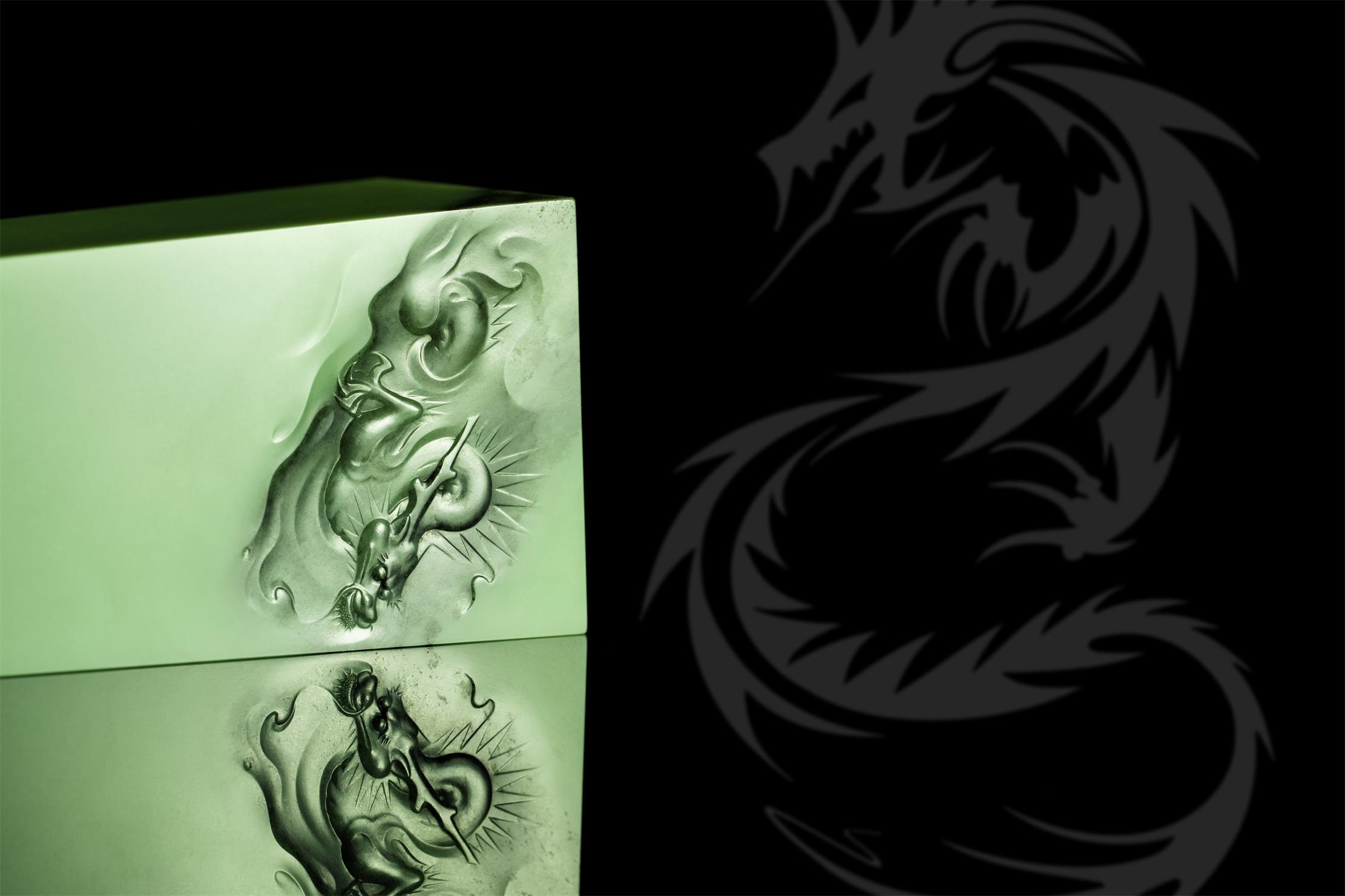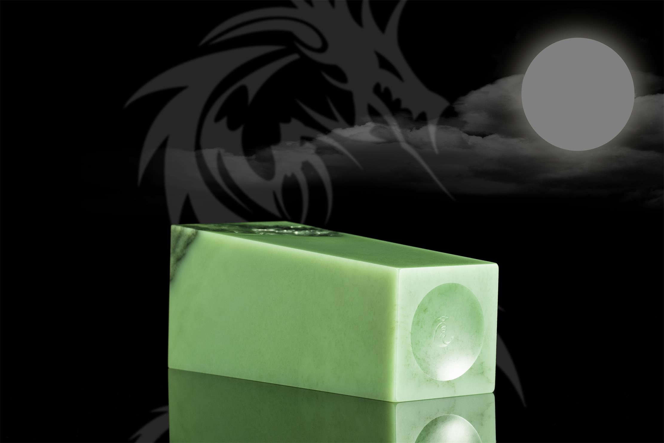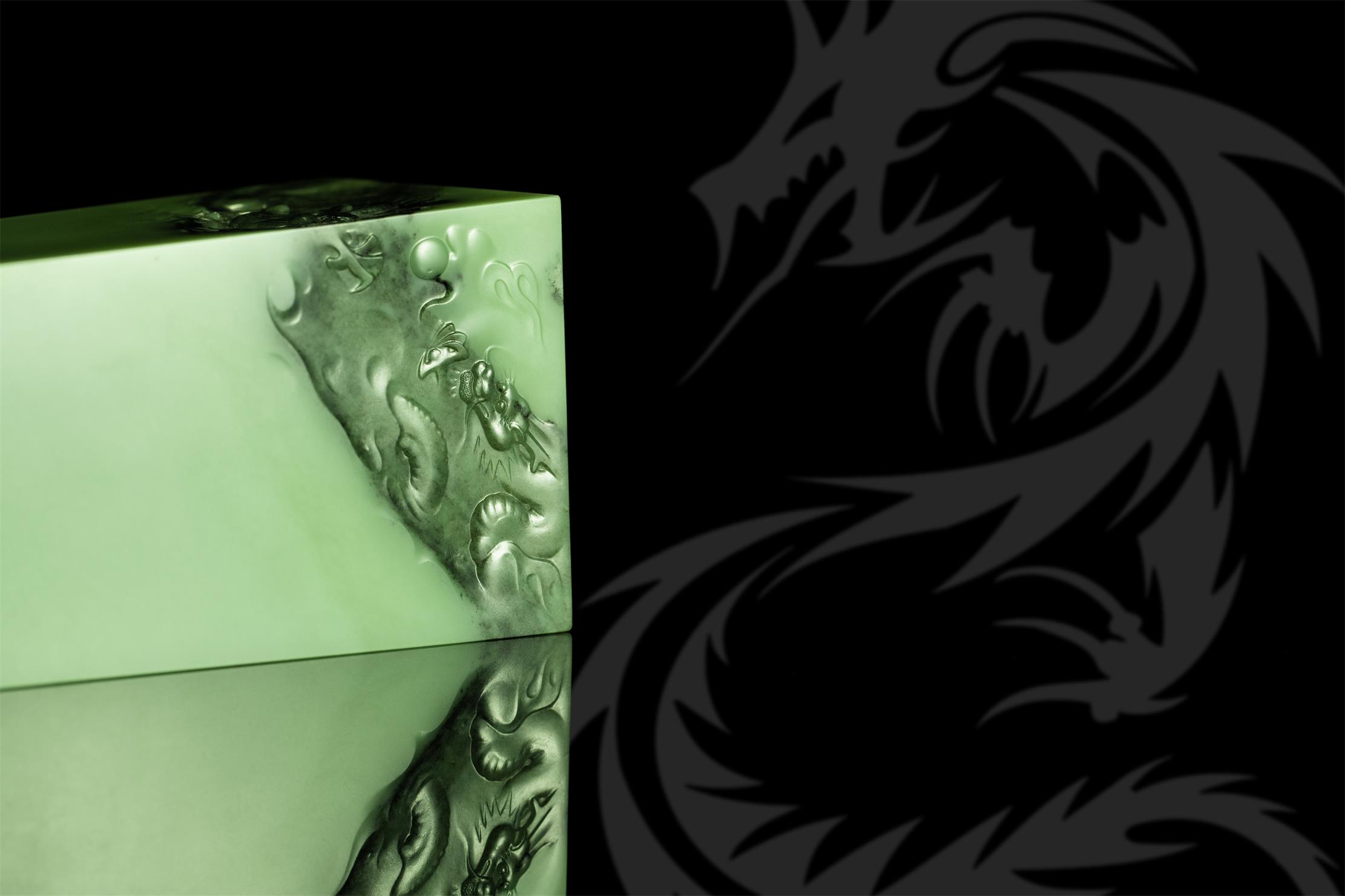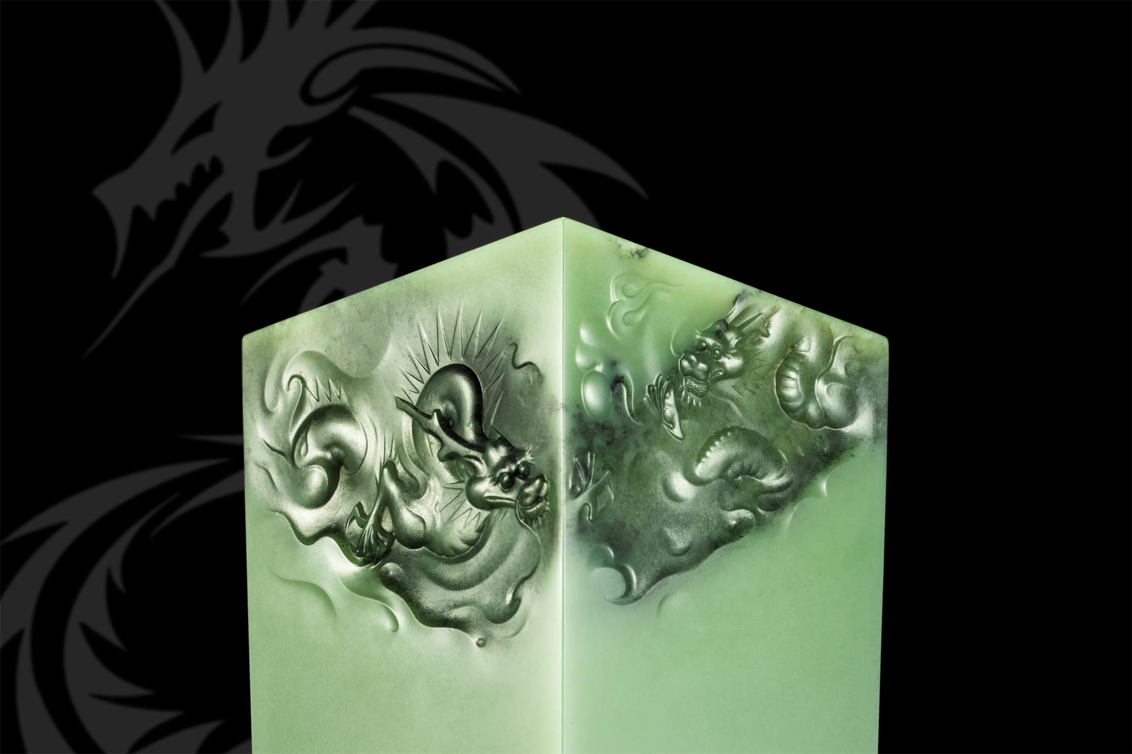 作品采用优质析木玉料,以古代祭祀用的大型盛酒器“泰尊”为创作载体,巧妙保留玉石上方的亿年天然黑沁,将其化为形神兼备的云雾飞龙,精饰于上宽下窄的长方形尊口处,并经掏膛、打磨等多道工序,呈现简洁而不简单、朴素而不单调的艺术佳品,令人回味无穷。
