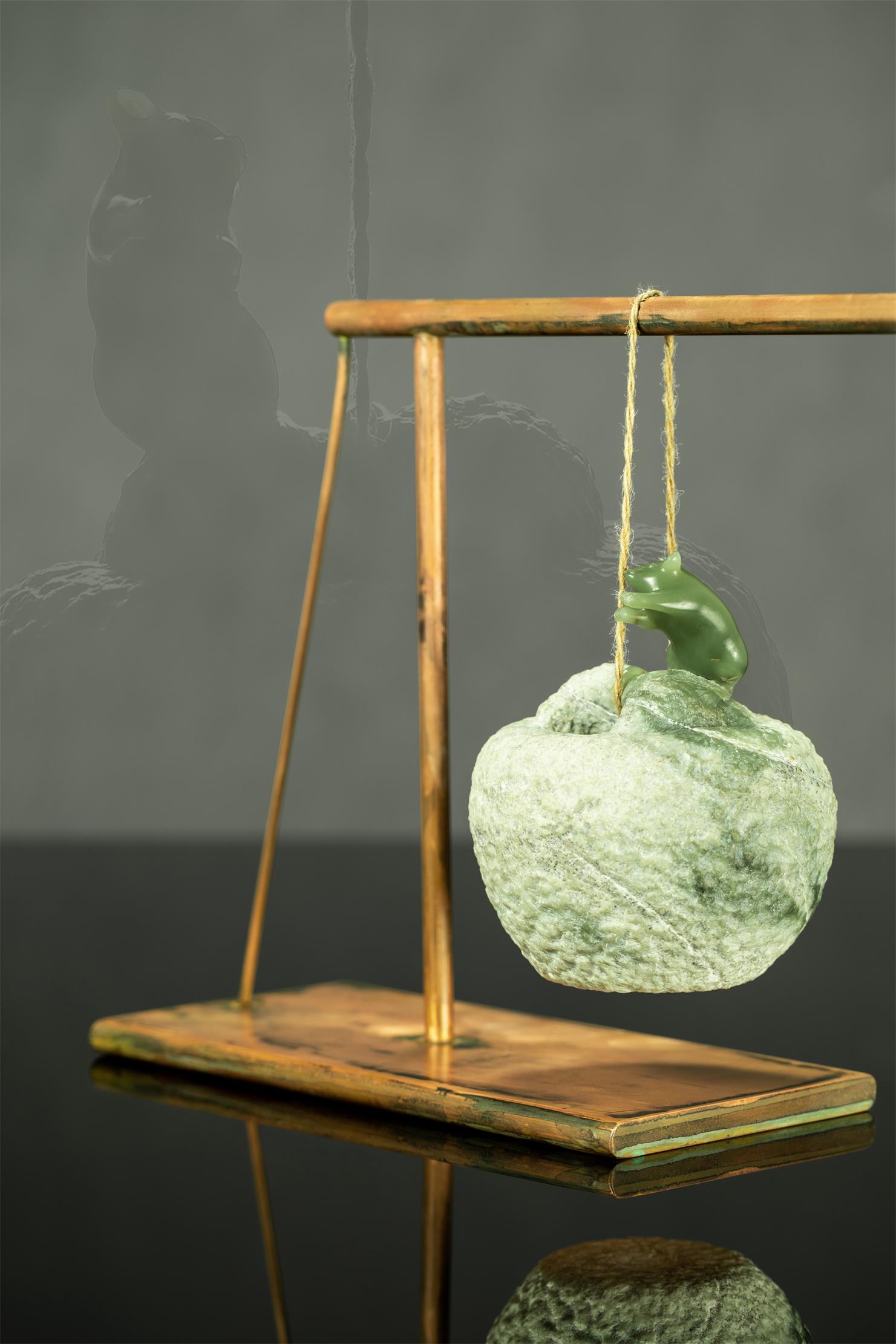 作品以紫铜做底座和秤杆。平直的秤杆,寓意太平盛世,称心如意。秤杆上刻有准星。