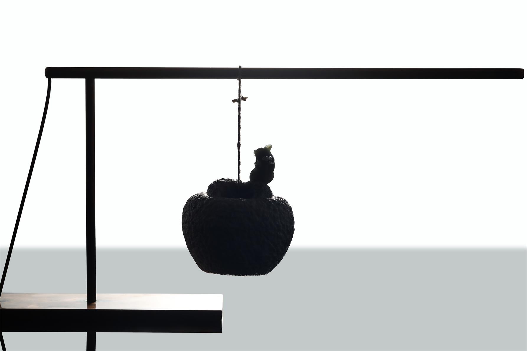 秤砣是包白浆的析木玉石,隐透清润的绿色玉肉,苹果造型,颇为夸张,上面跳跃一只灵巧可爱的小老鼠。