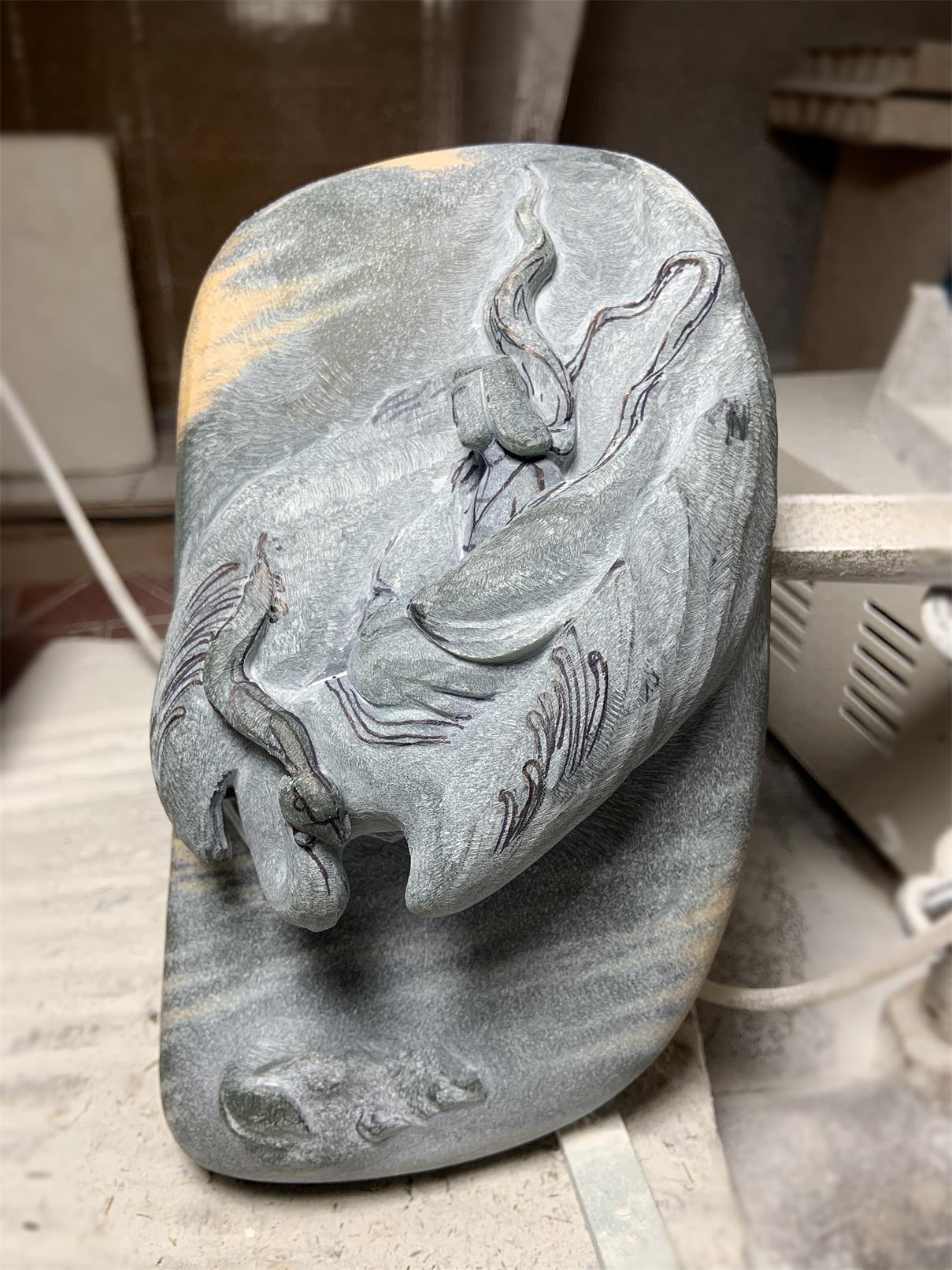 他刻凤鸟,刀法利落洒脱、空起空收,无论盘旋展翼、曲颈挺头,还是恫目飞羽,都力健生动。