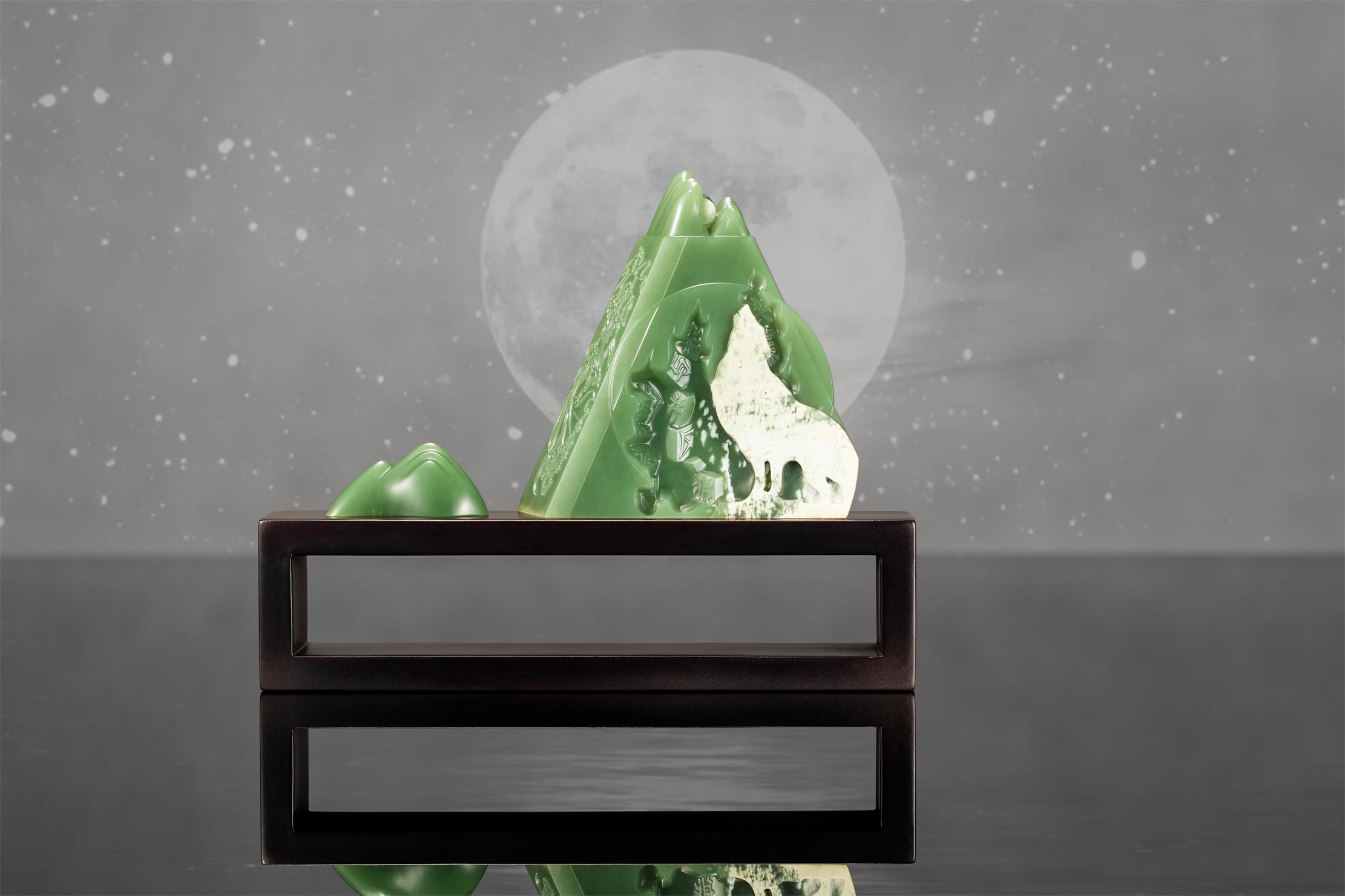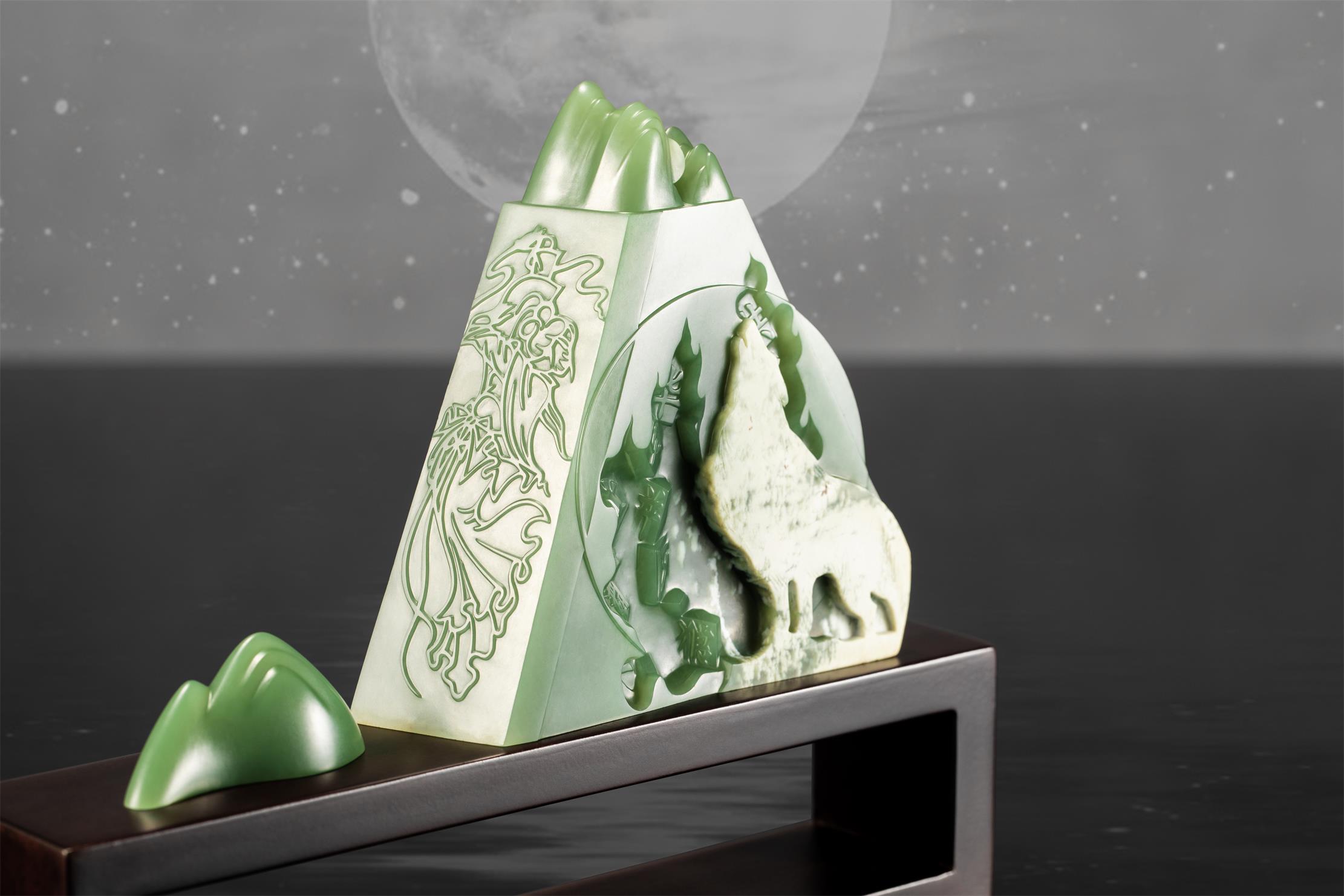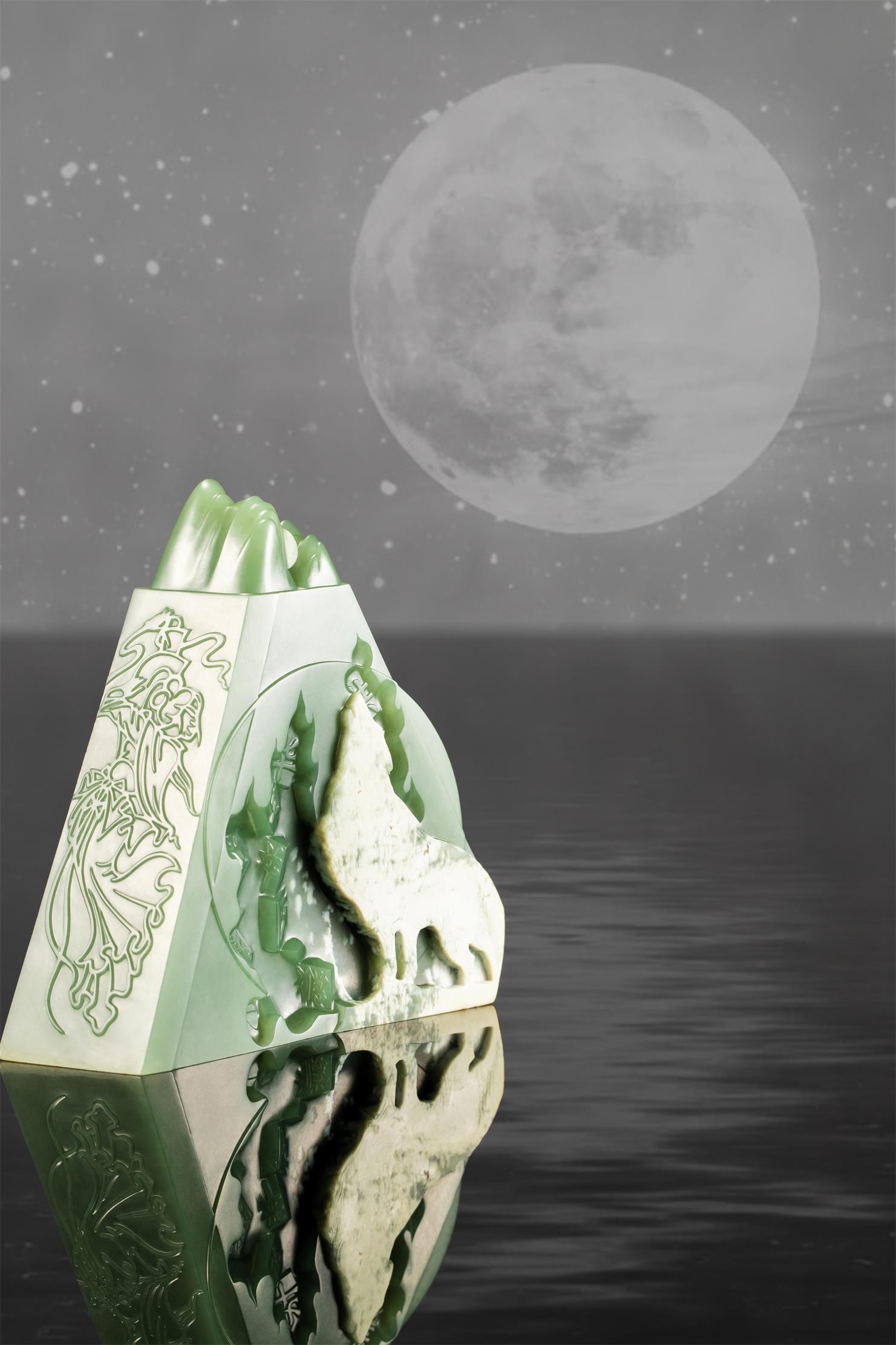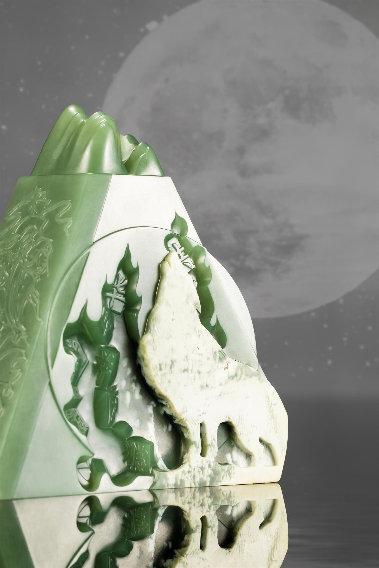转过青峰,看玉料背面,同样一轮化解了三角形料生硬感的浮雕满月上,飘散着洁白的雪花,原来这个三角形的白绿相间的玉,竟是一座雪山。