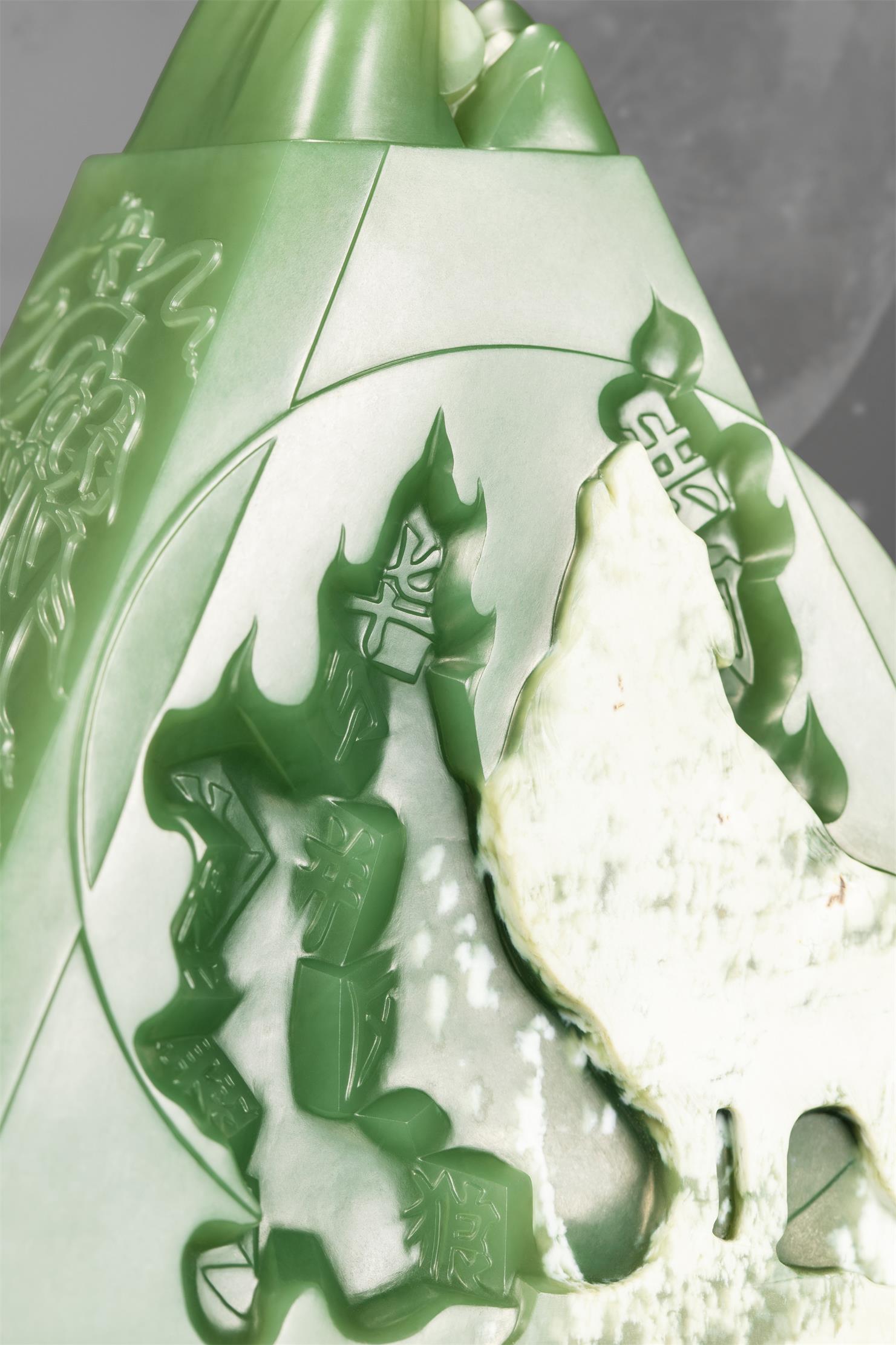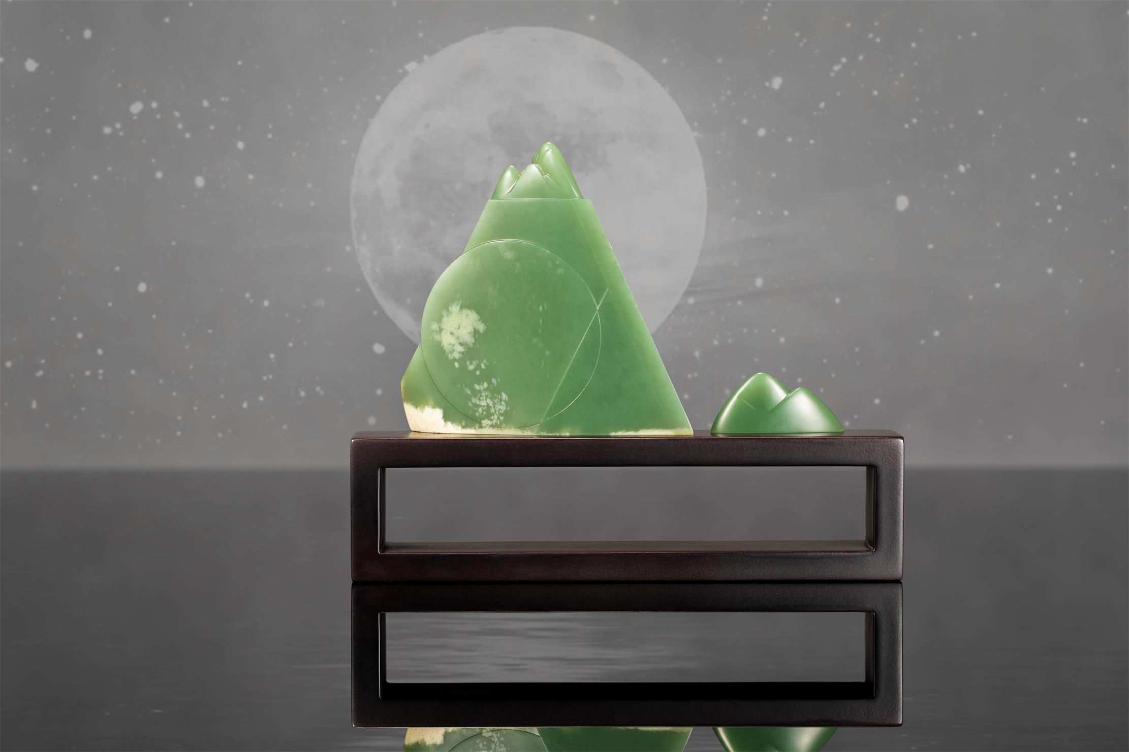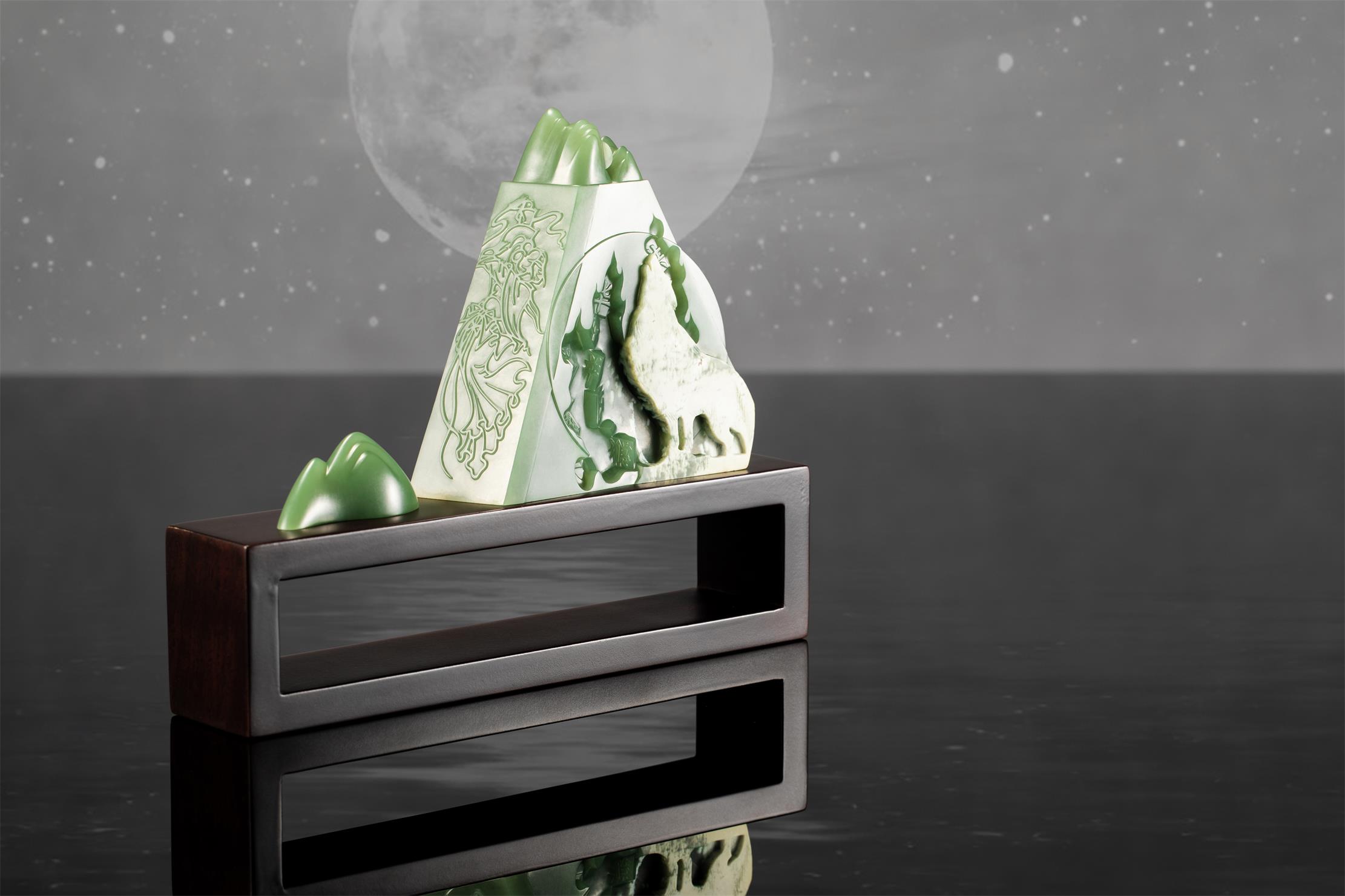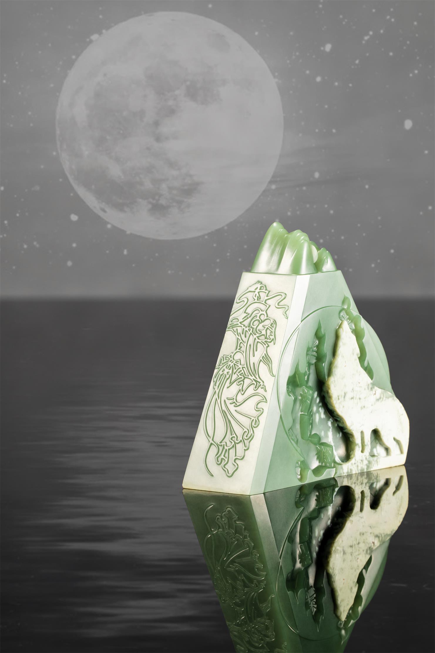转过青峰,看玉料背面,同样一轮化解了三角形料生硬感的浮雕满月上,飘散着洁白的雪花,原来这个三角形的白绿相间的玉,竟是一座雪山。
