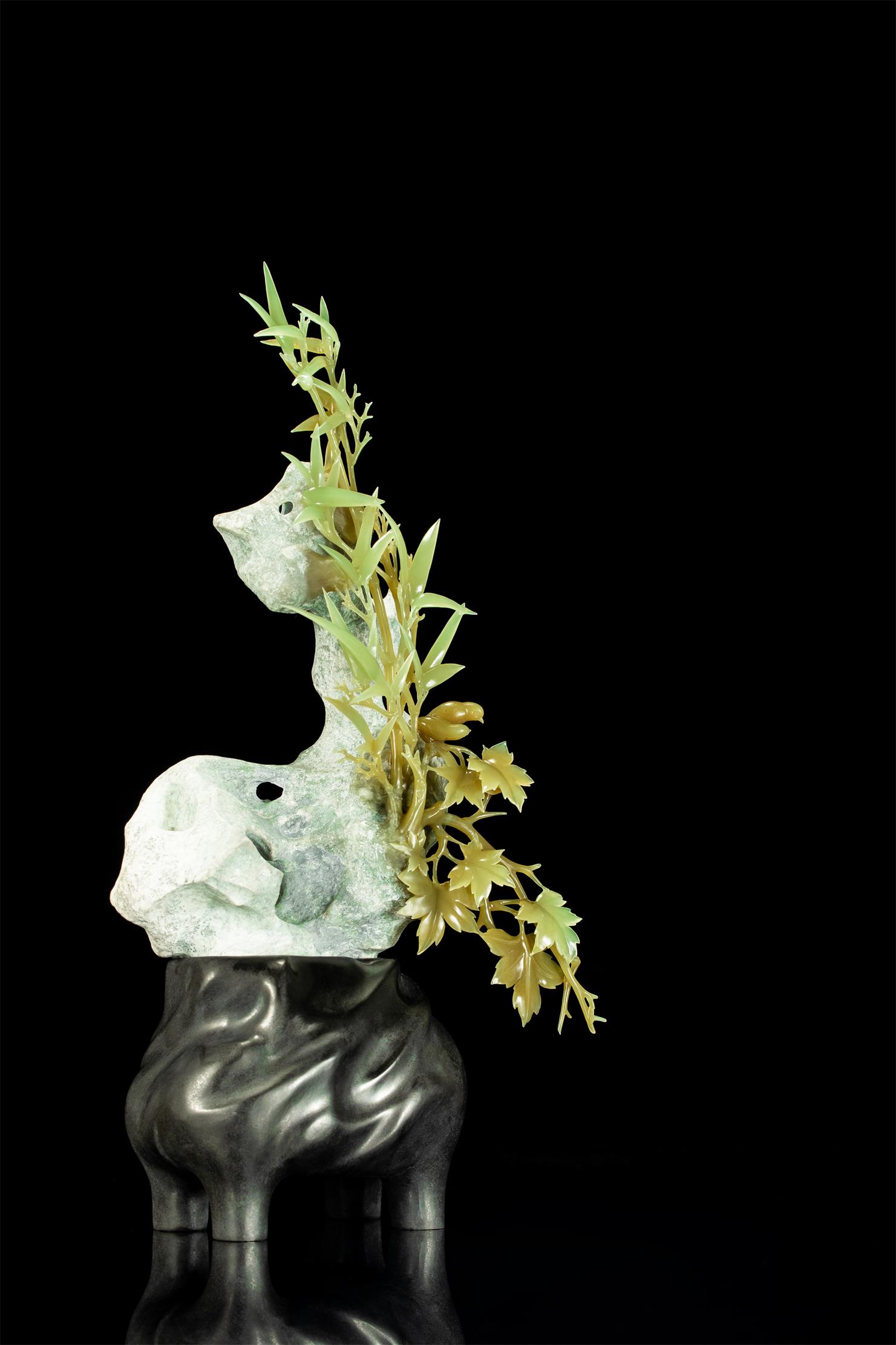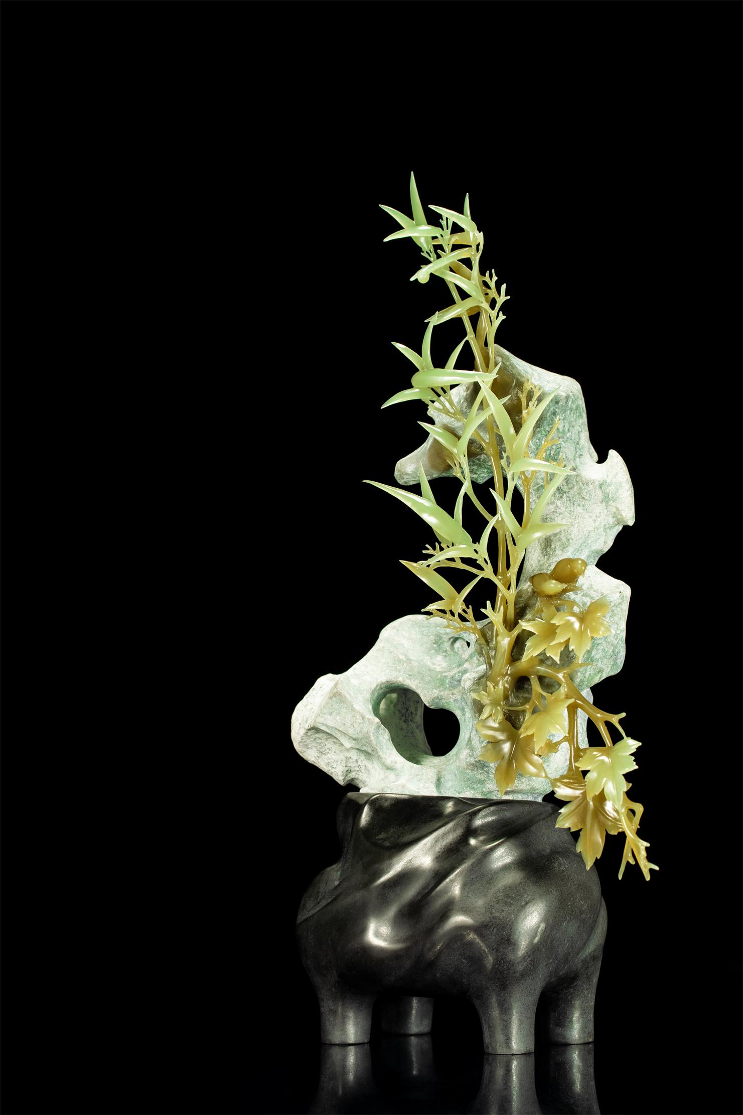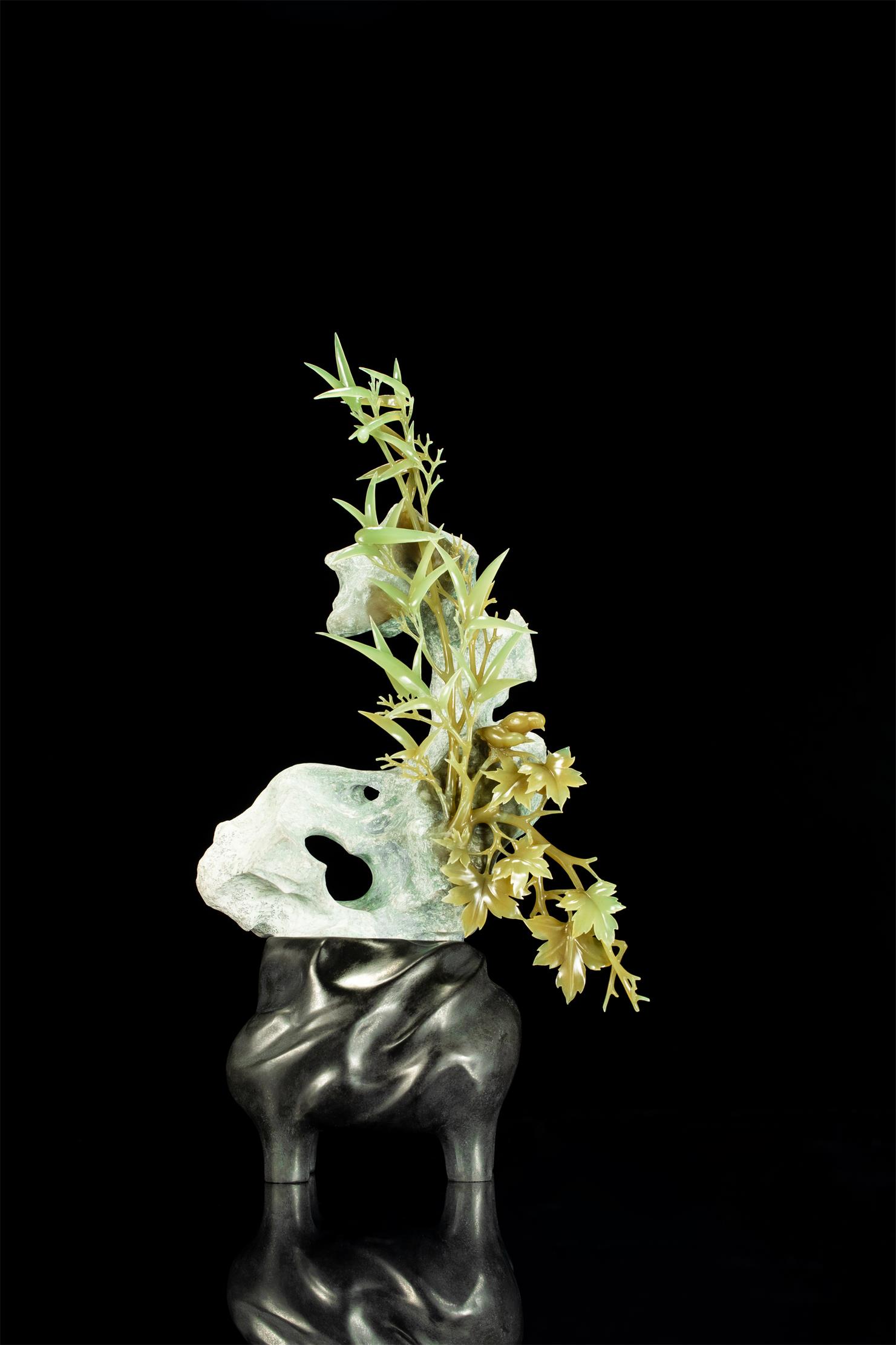 作者取析木玉山料,以白皮、糖色、净肉,塑造富有自然生趣与灵气的秋色一角,配以简雕的黑色大理石底座,使作品添增文人盆景艺术的欣赏性和精神内涵。