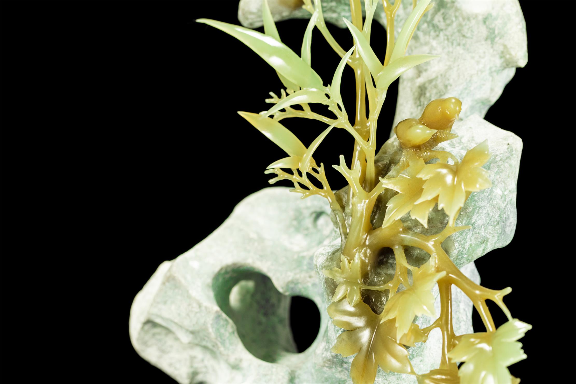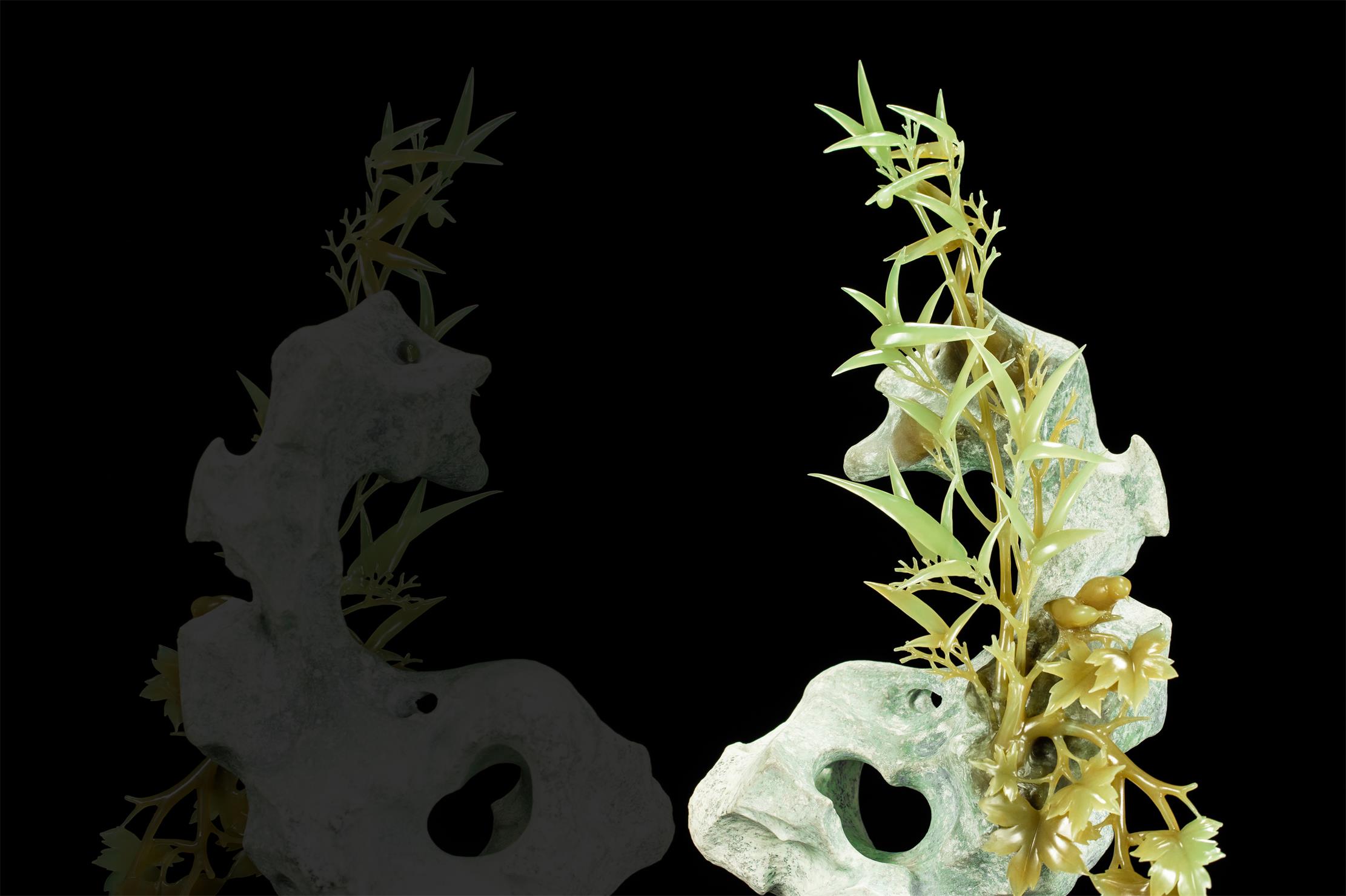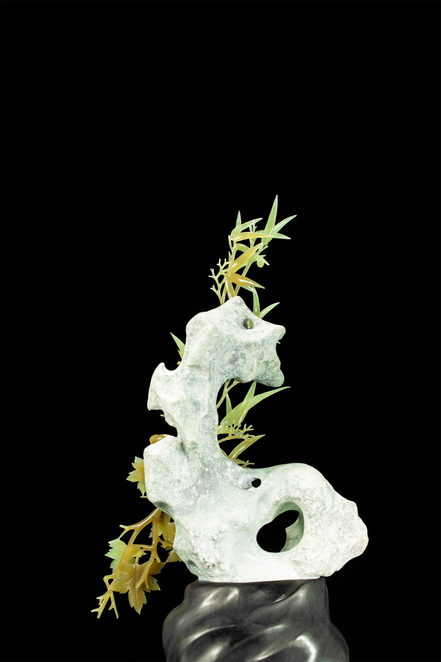 贴着太湖石,打开另一部分玉肉,将清新素雅的黄绿玉肉雕成顶天立地的竹子。