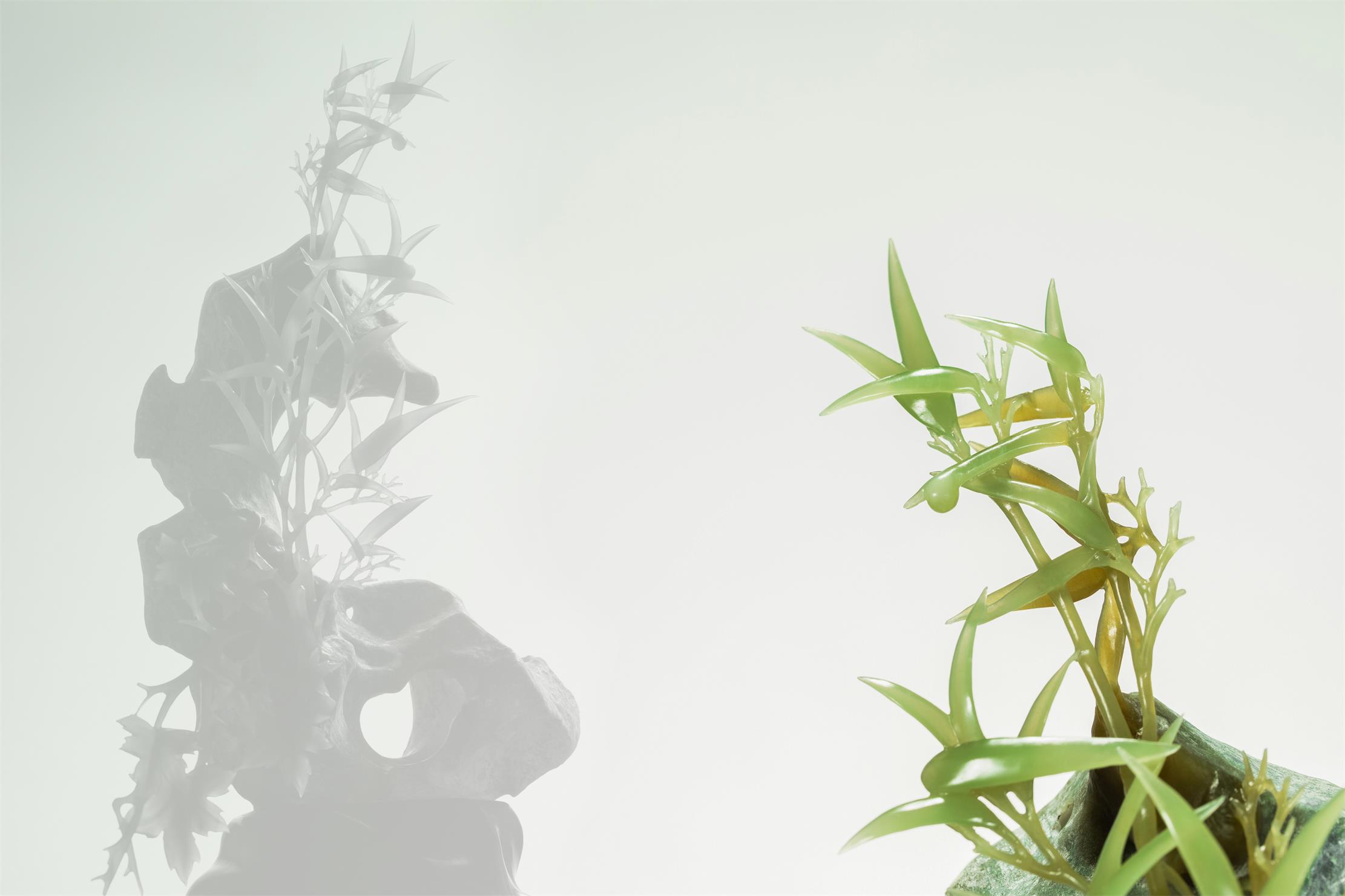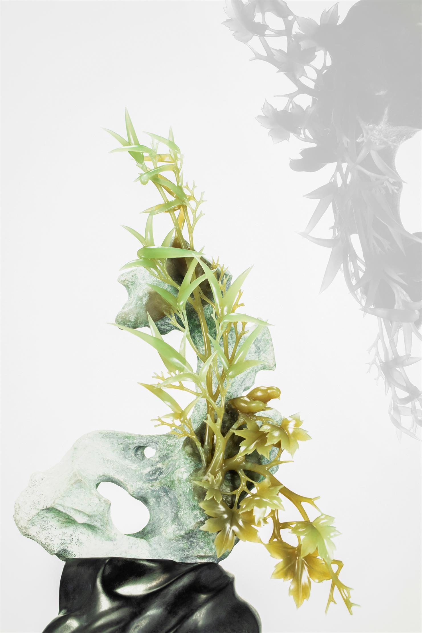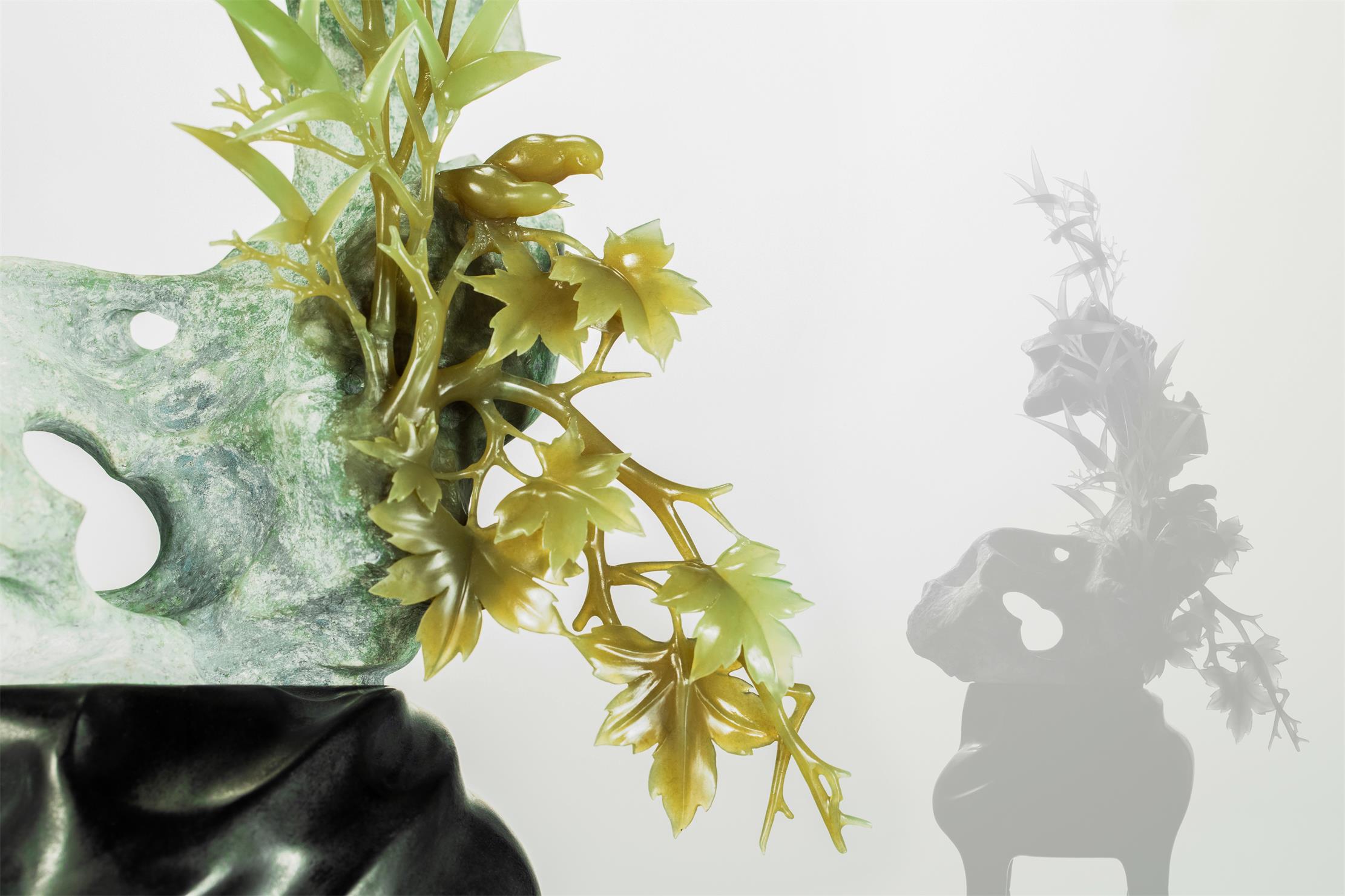 贴着太湖石,打开另一部分玉肉,将清新素雅的黄绿玉肉雕成顶天立地的竹子。