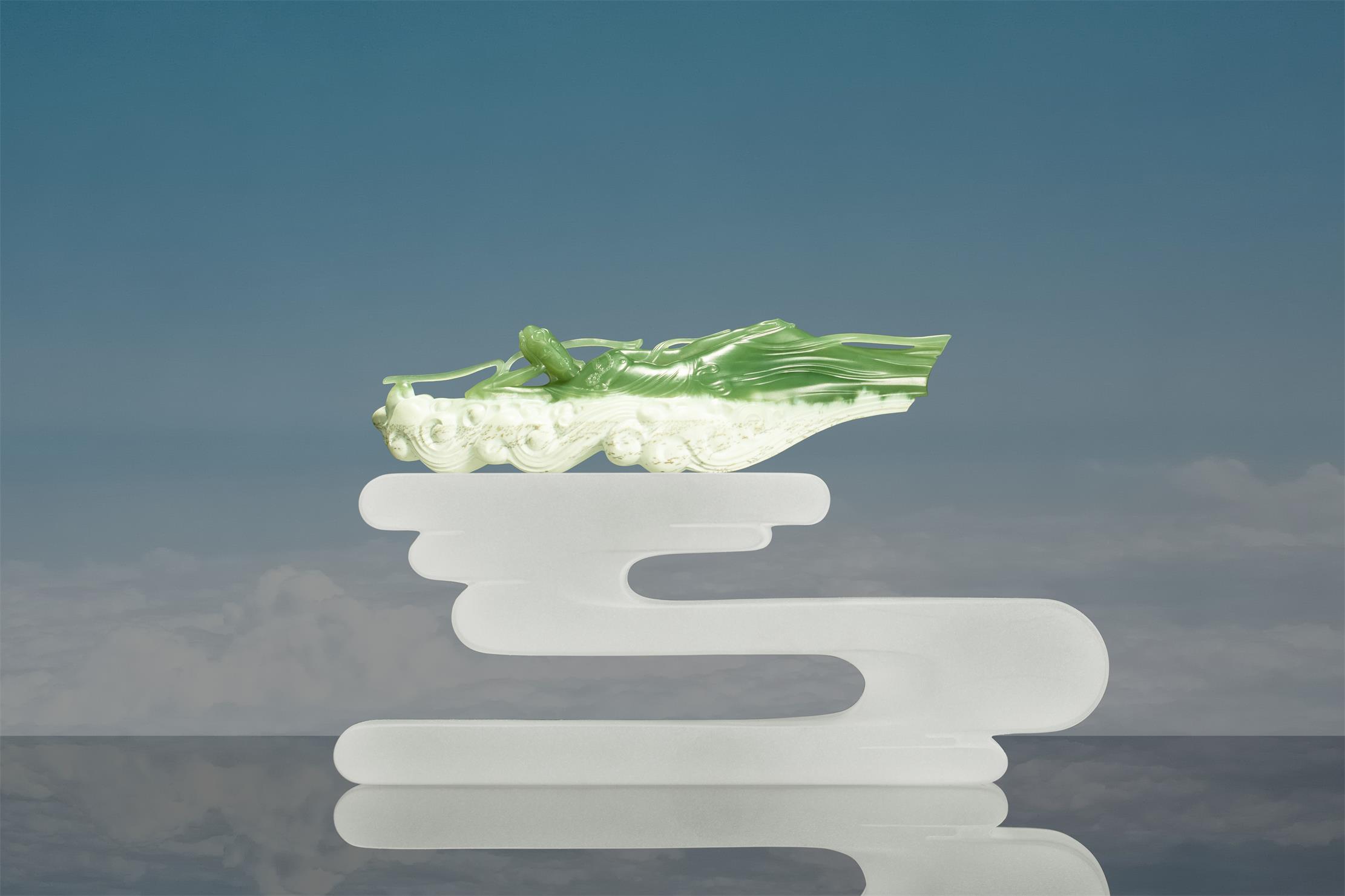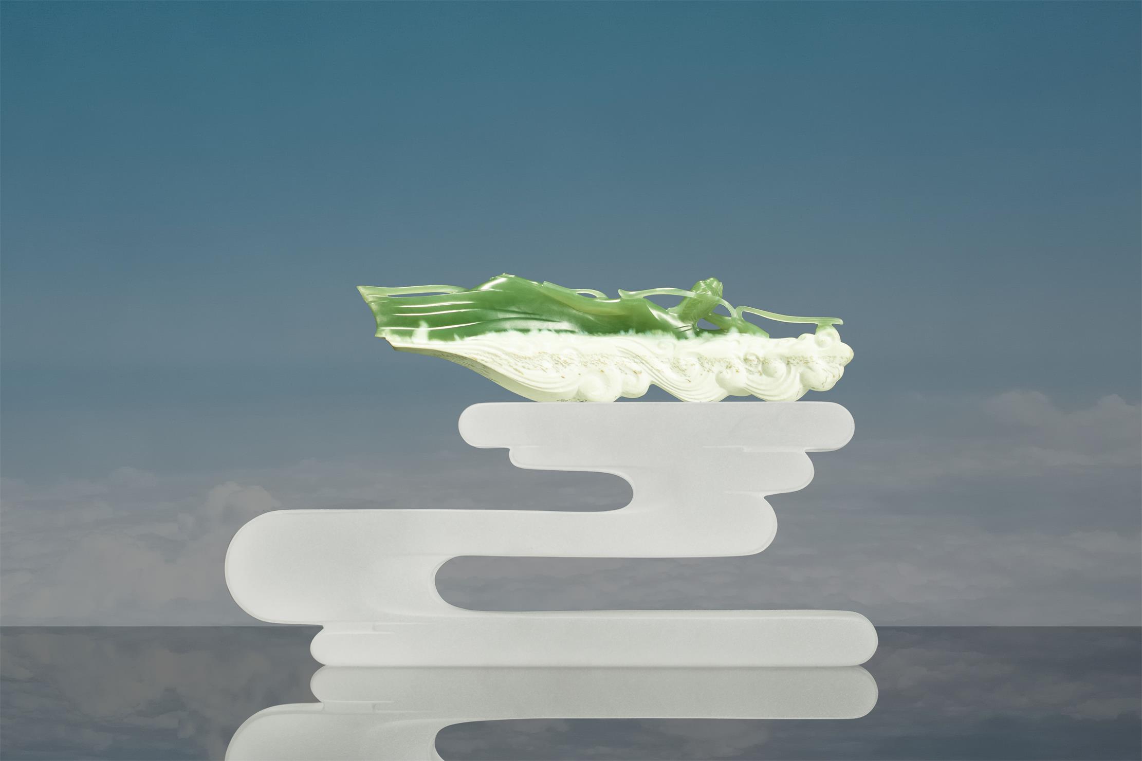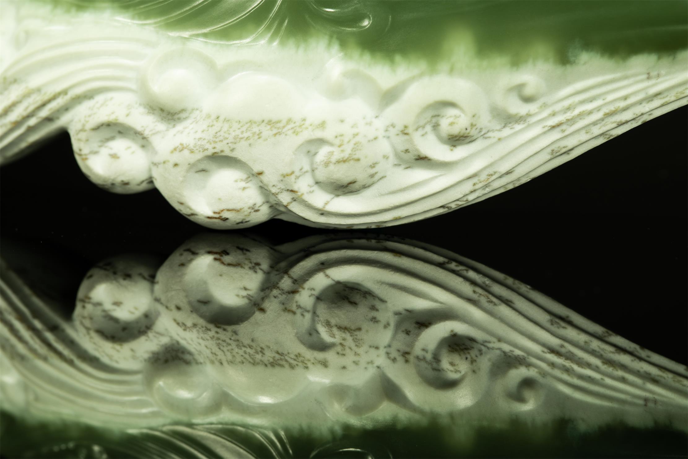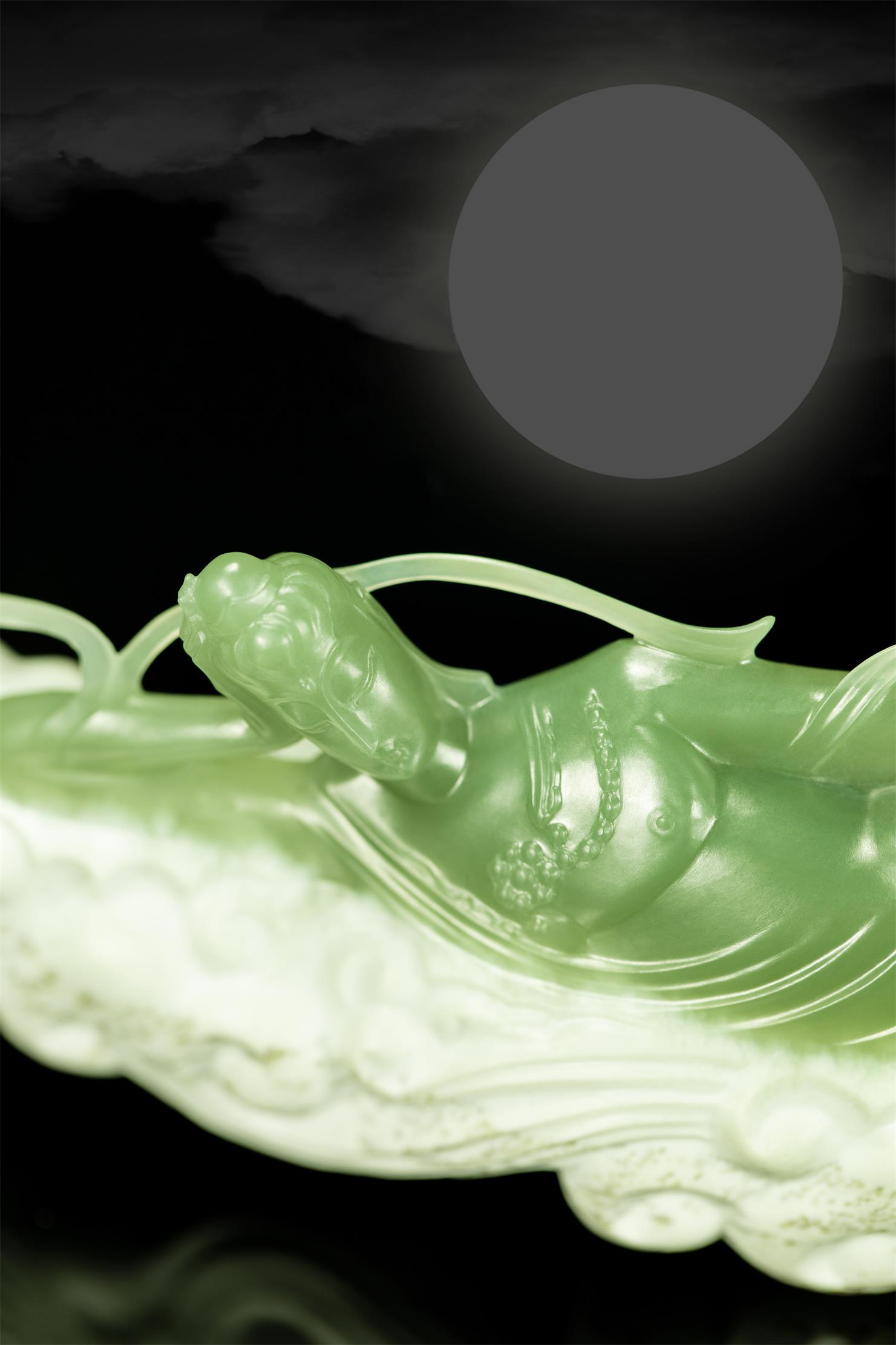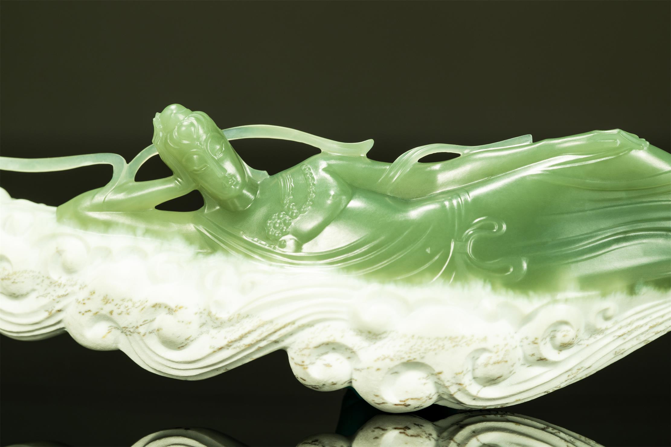厚厚的白皮就是朵朵白云,云上净润的玉肉就是横卧的观音,再将衣纹用水平线表示,可求漂浮的空灵感,彰显无拘无束、自由自在的状态。