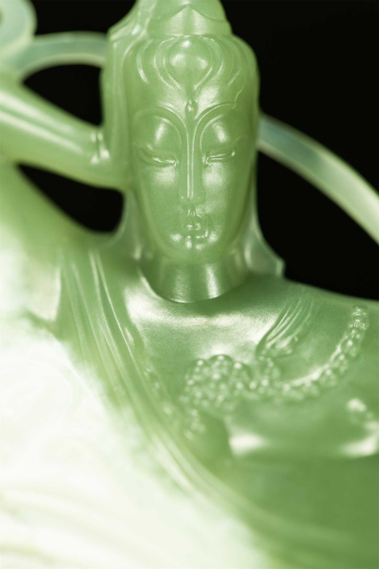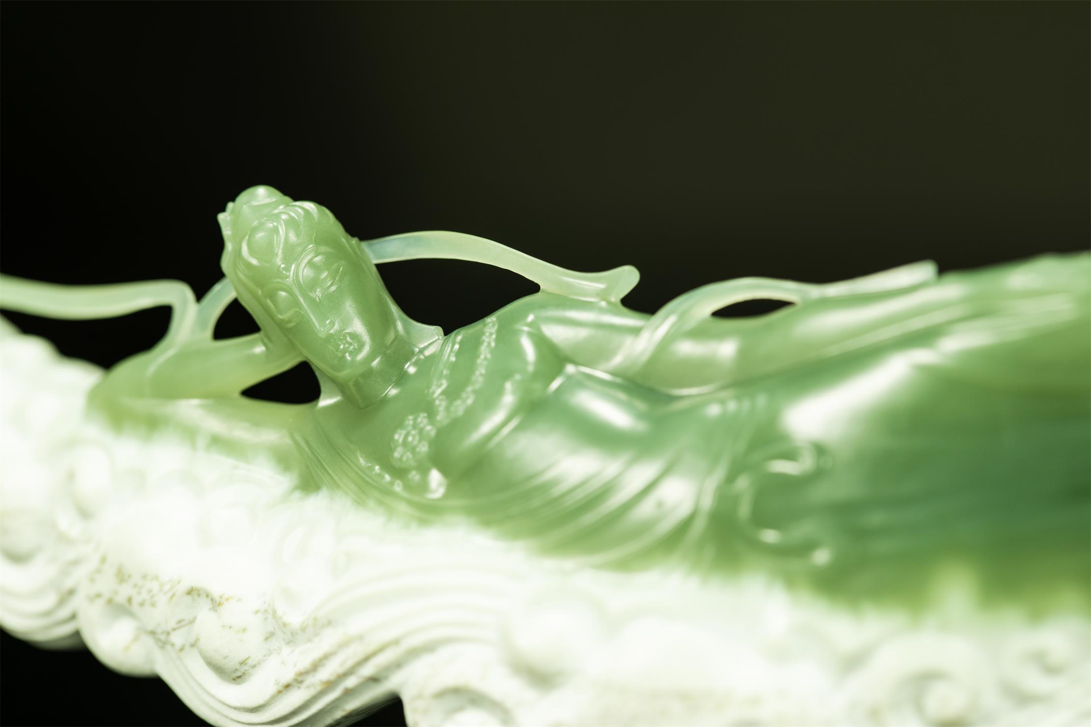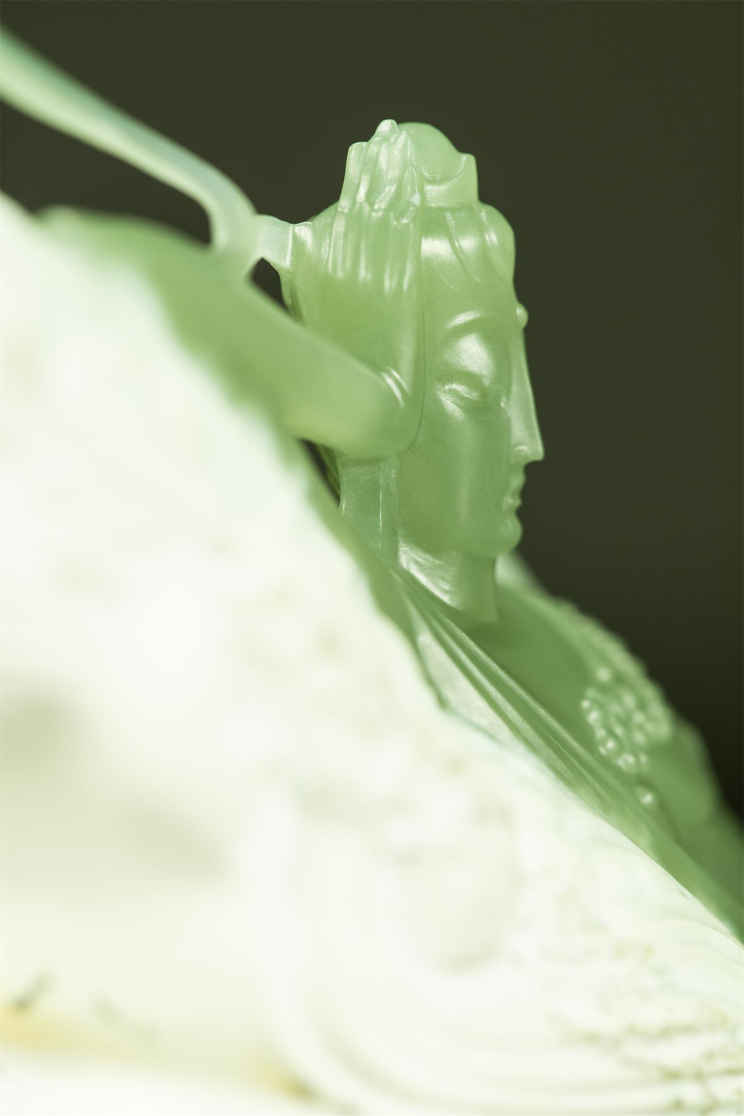 修饰了华美头部,再精细展现柳眉樱口、挺鼻垂睑,这是作品灵魂所在,当然,析木玉细腻有韧的质地,功不可没。