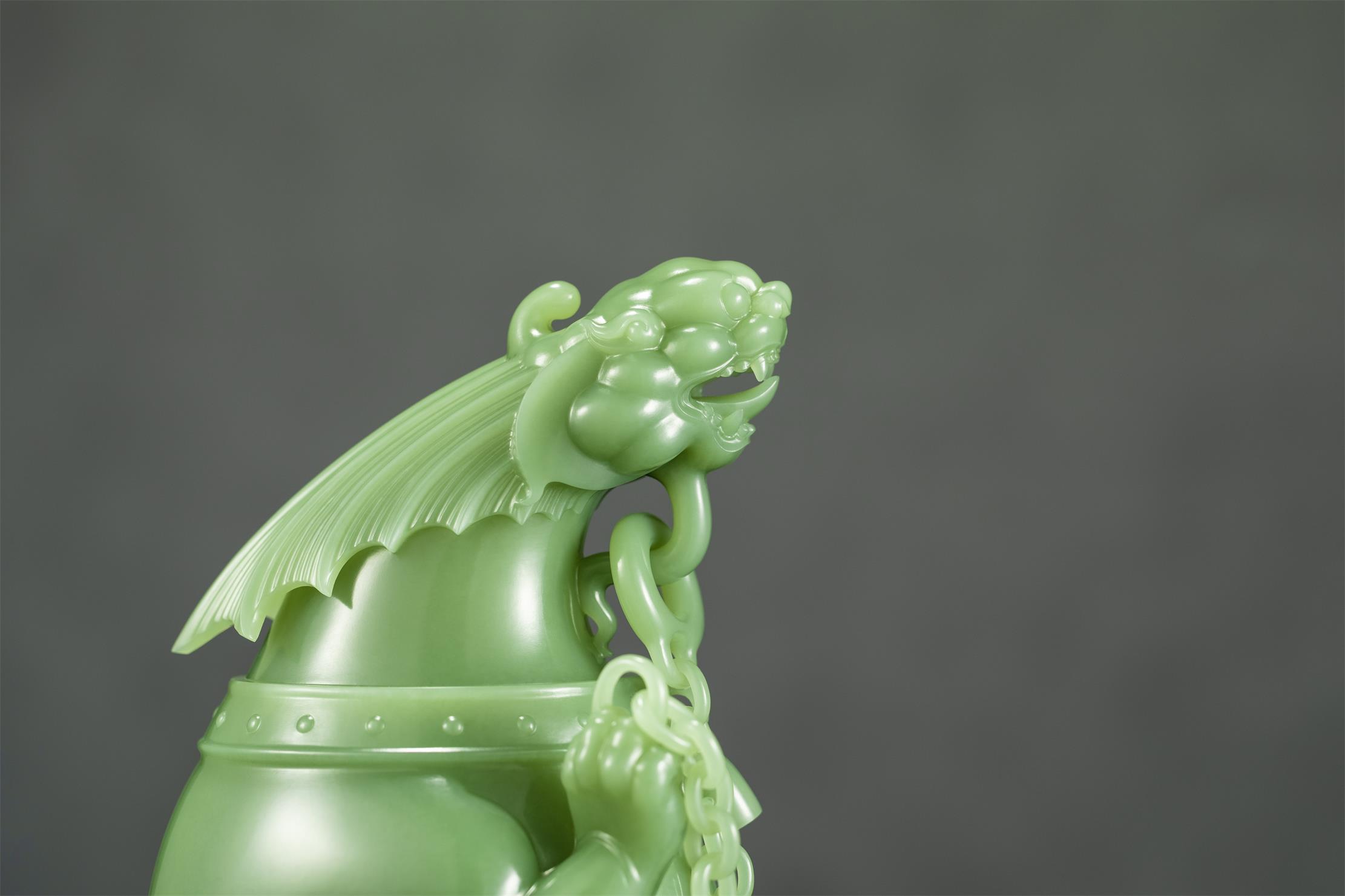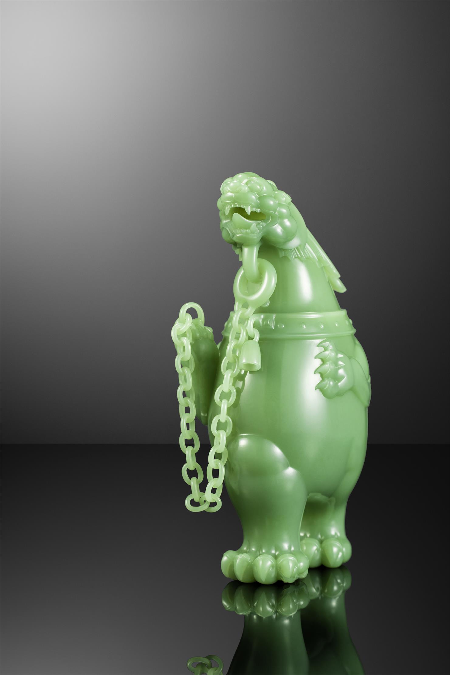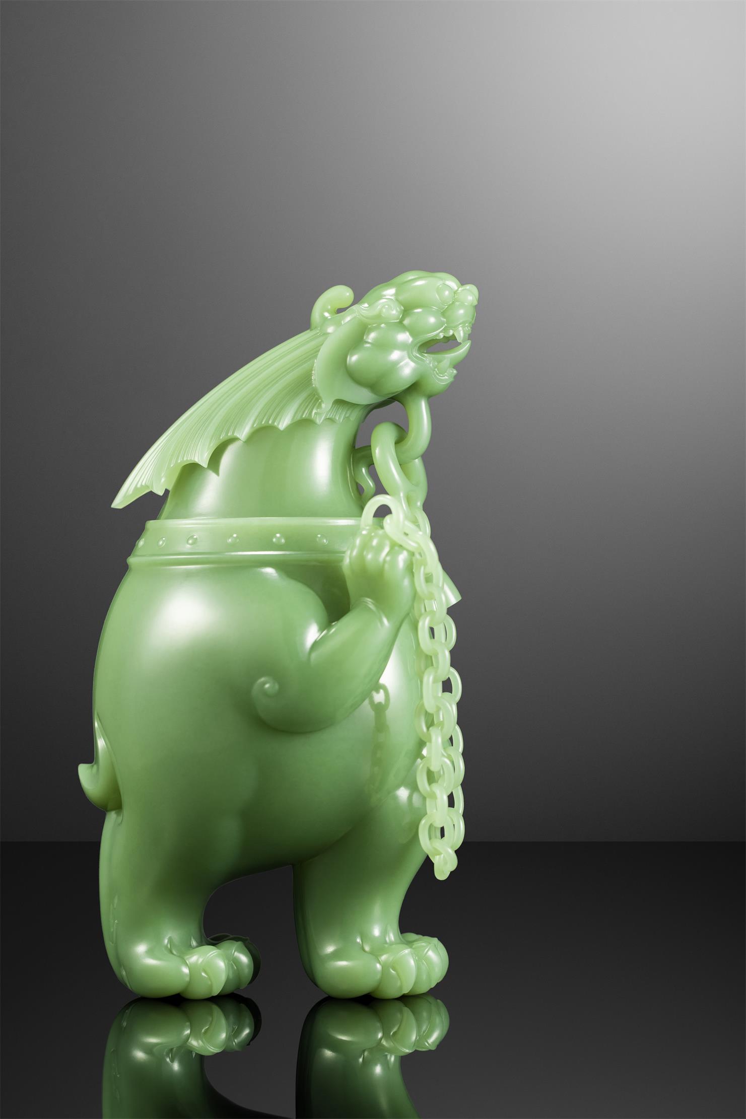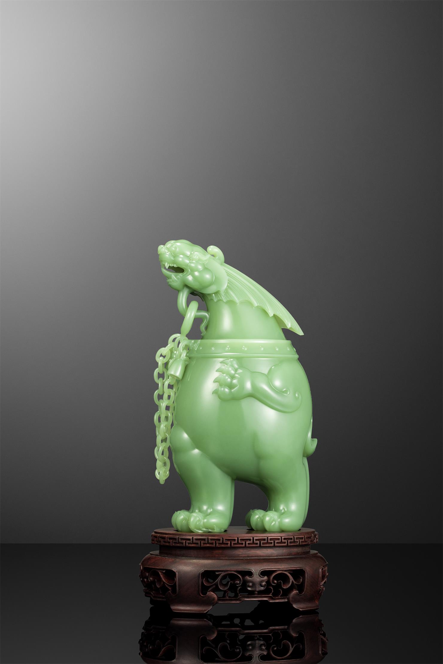 这猛兽叫“瑞兽尊”,是取整块析木玉雕就,玉质温润净雅,色泽如春叶般娇嫩鲜绿,确为薄胎器皿和活环链雕的首选。