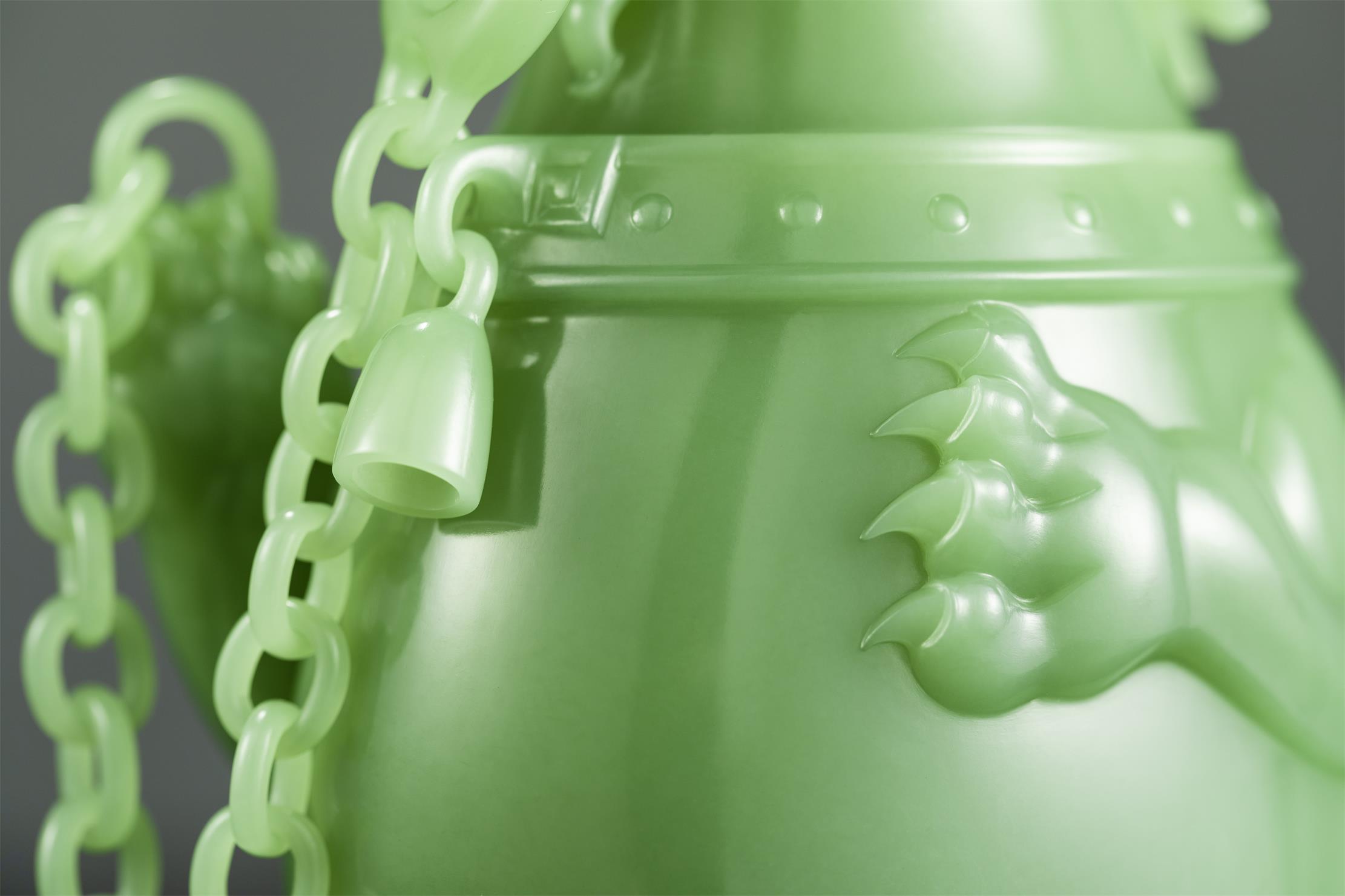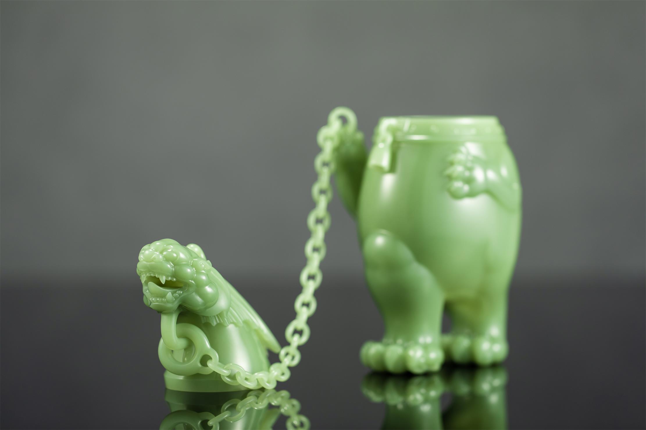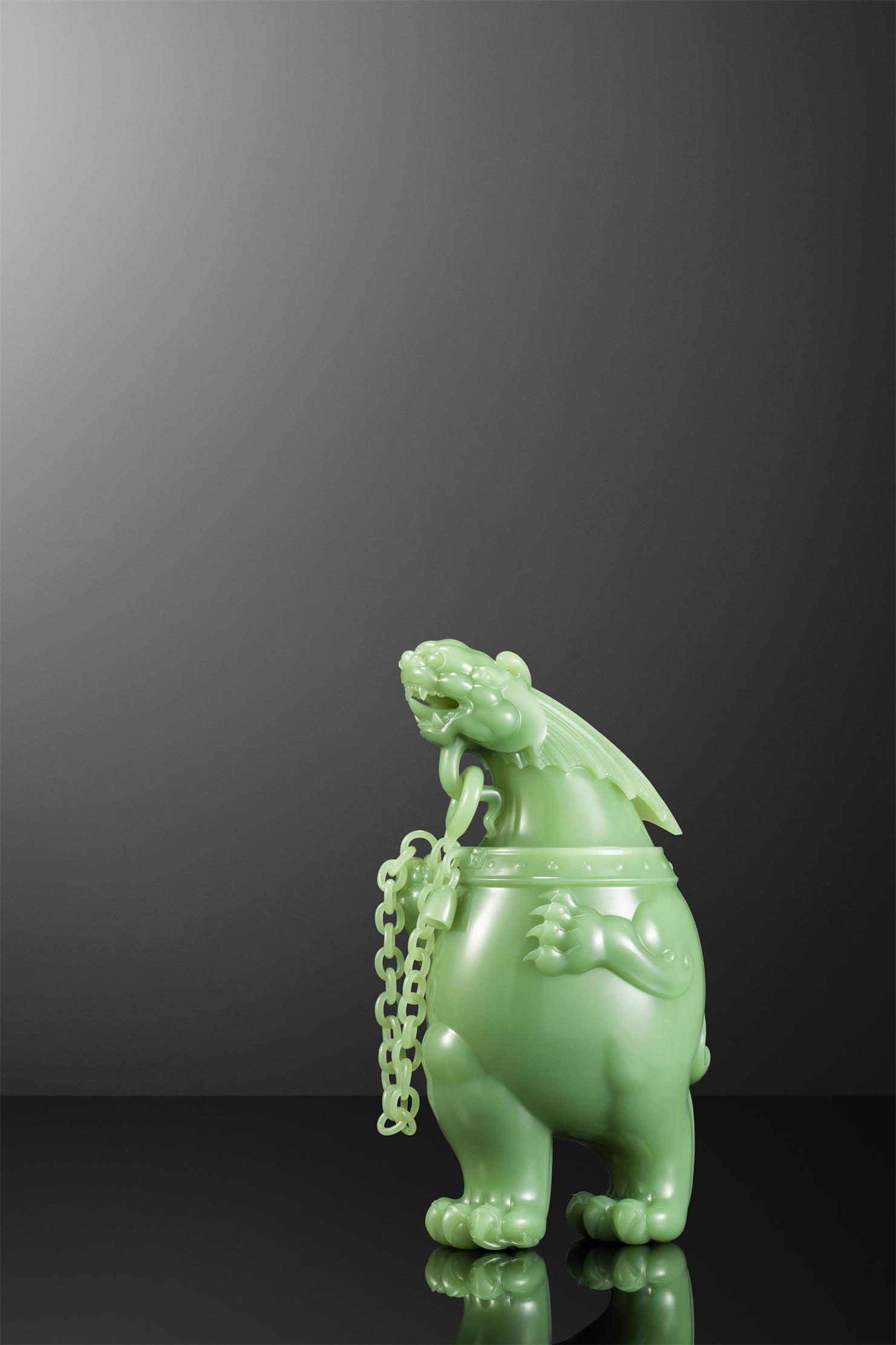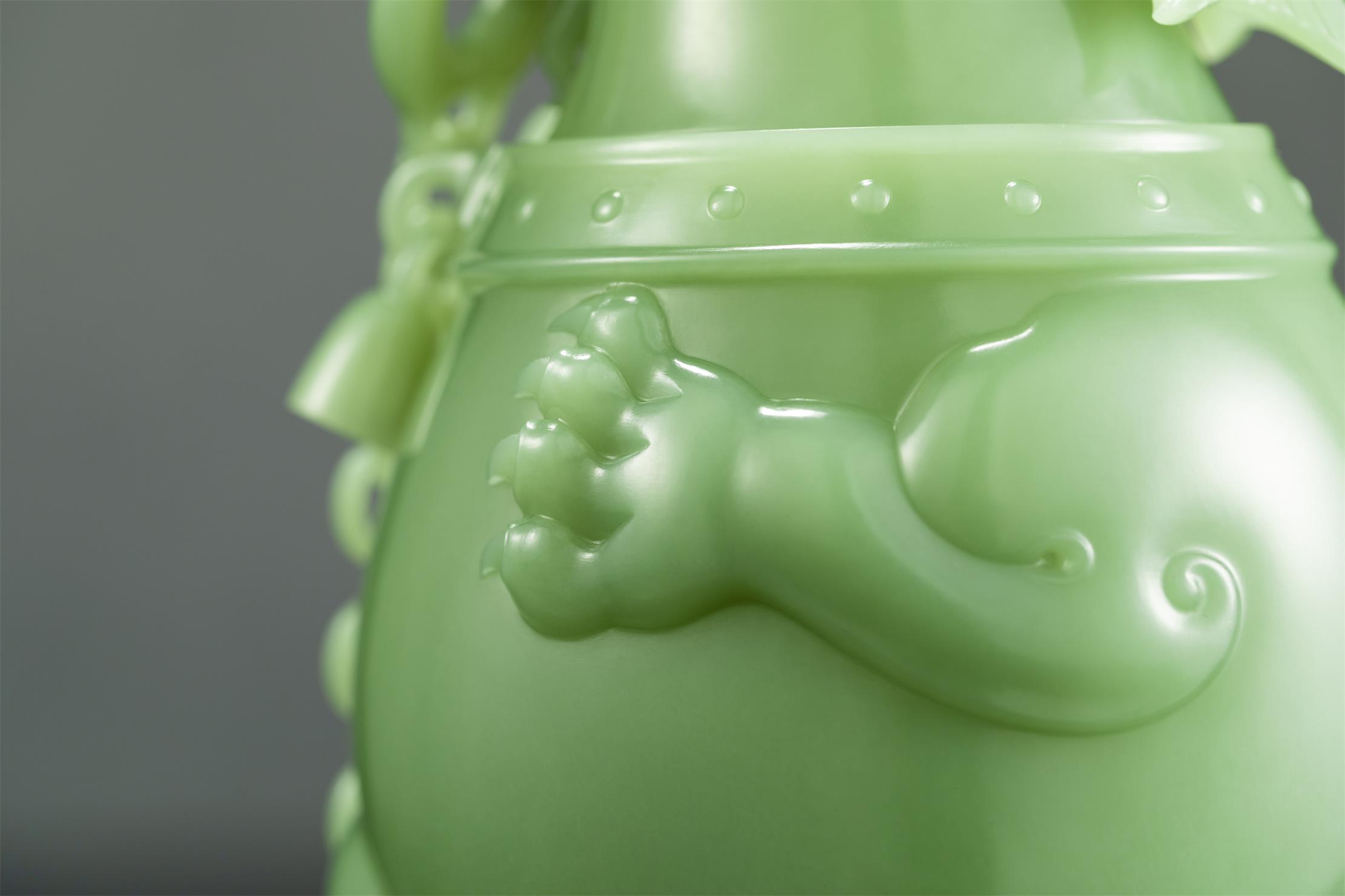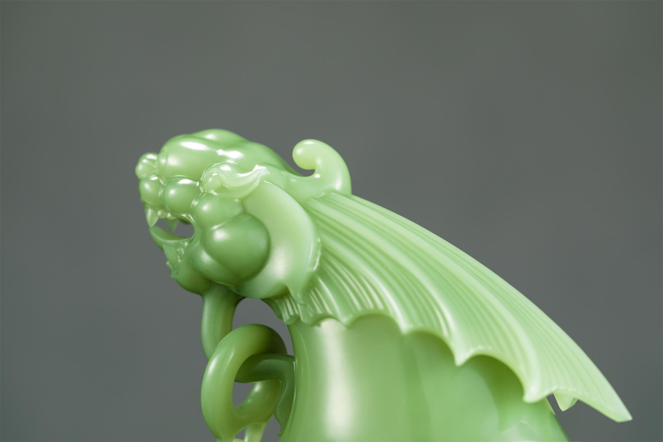 这猛兽叫“瑞兽尊”,是取整块析木玉雕就,玉质温润净雅,色泽如春叶般娇嫩鲜绿,确为薄胎器皿和活环链雕的首选。