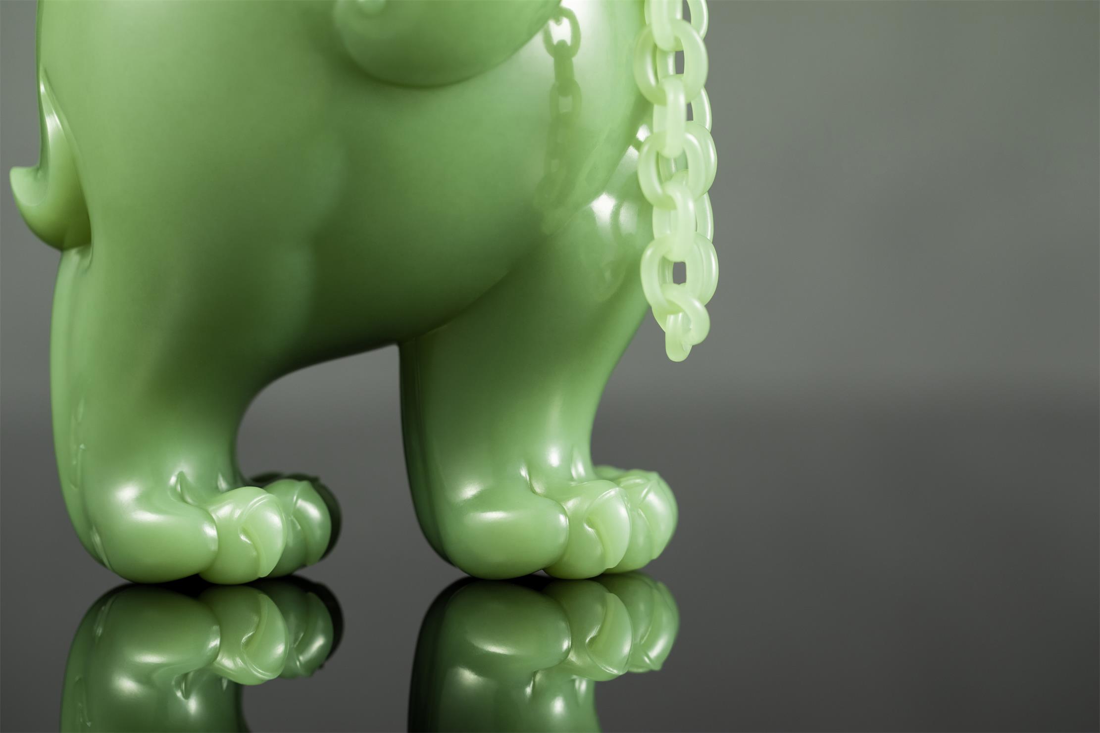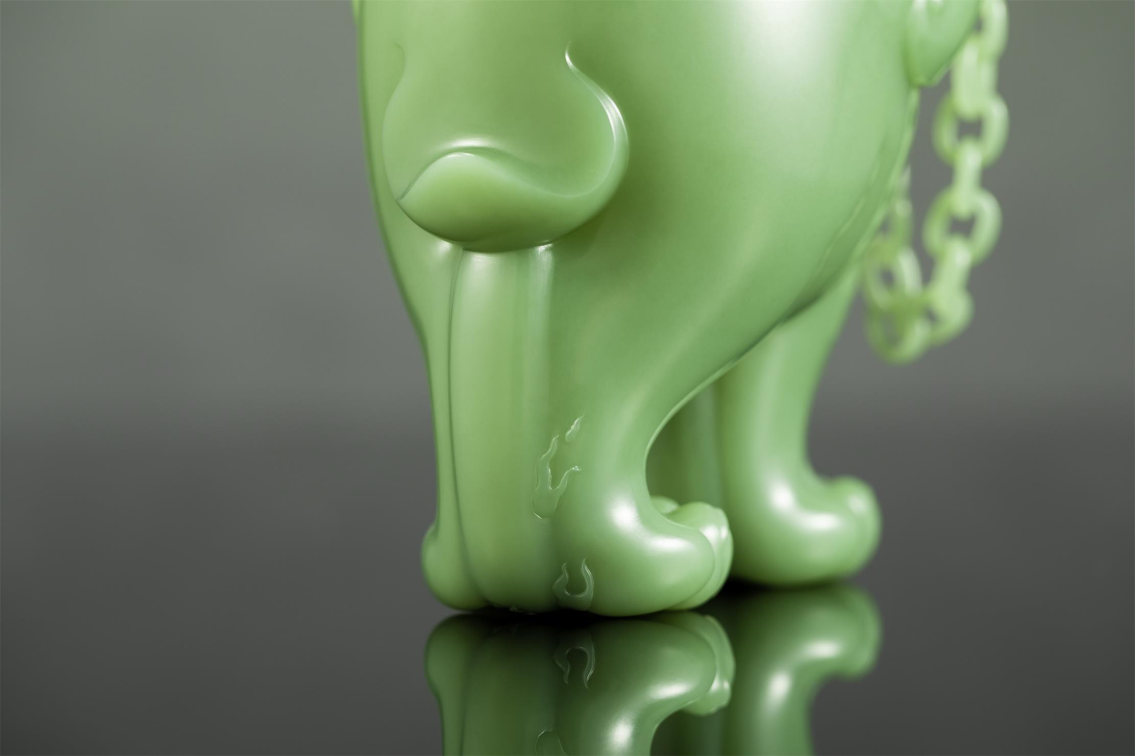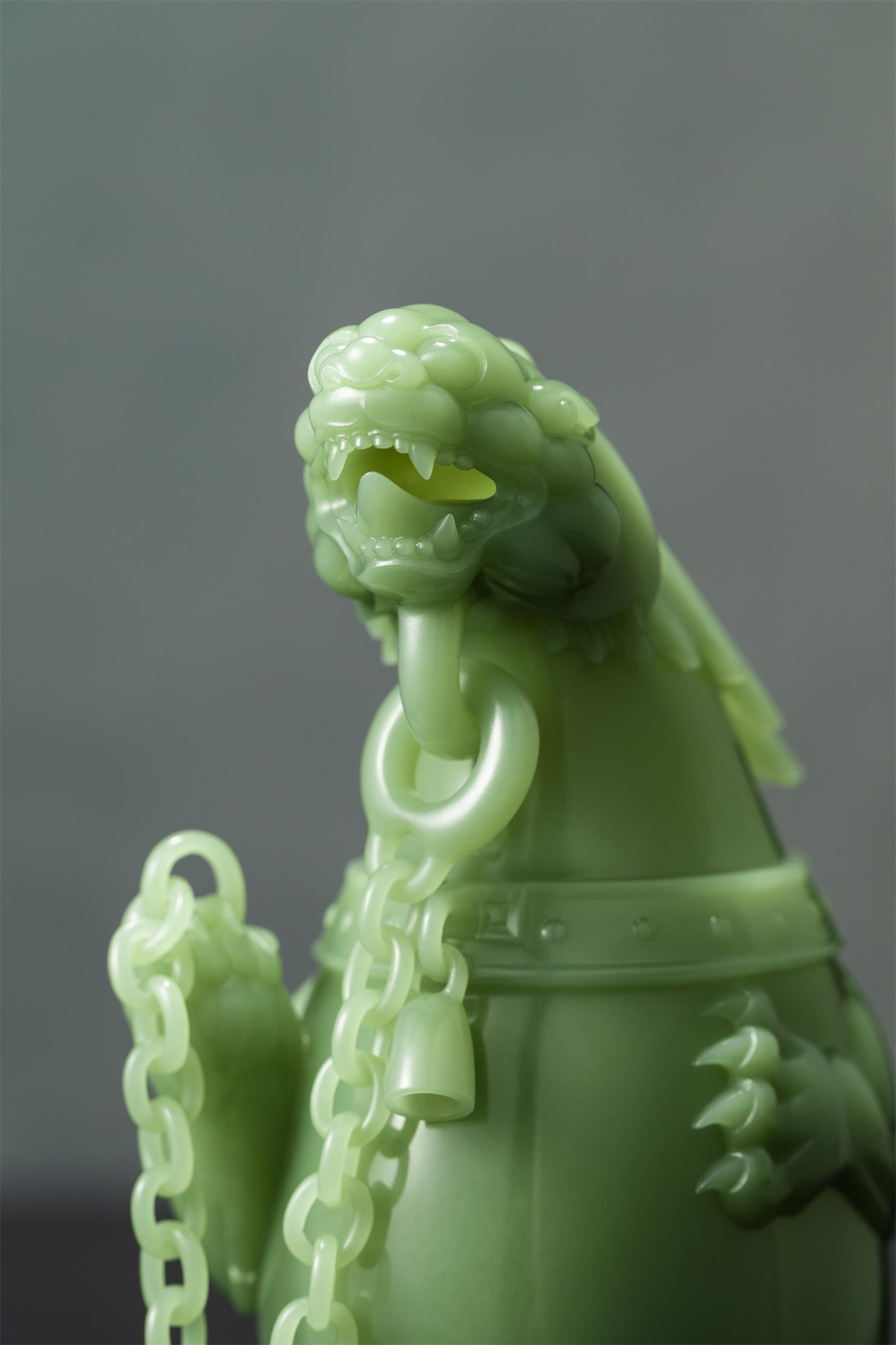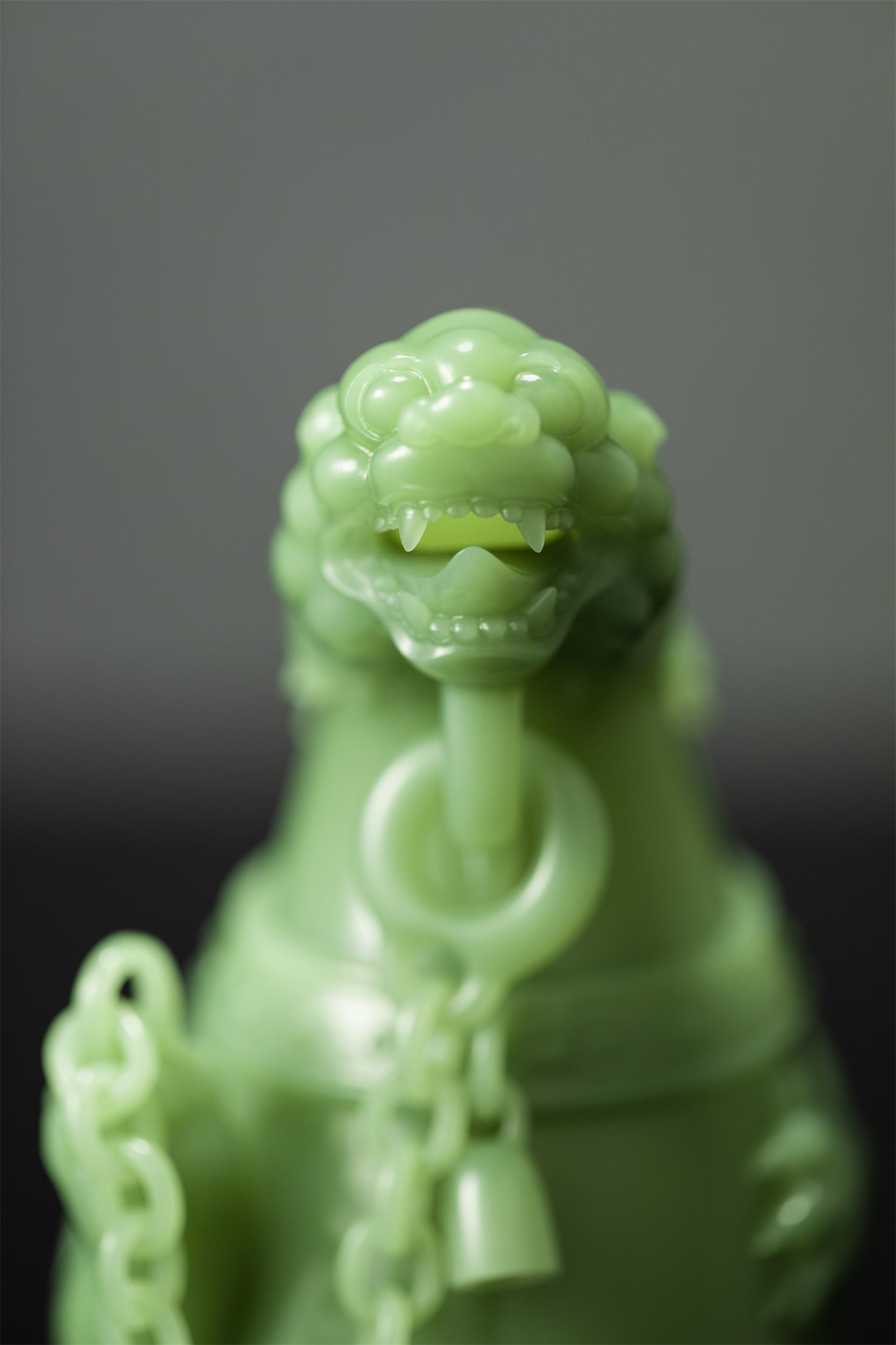 这猛兽叫“瑞兽尊”,是取整块析木玉雕就,玉质温润净雅,色泽如春叶般娇嫩鲜绿,确为薄胎器皿和活环链雕的首选。