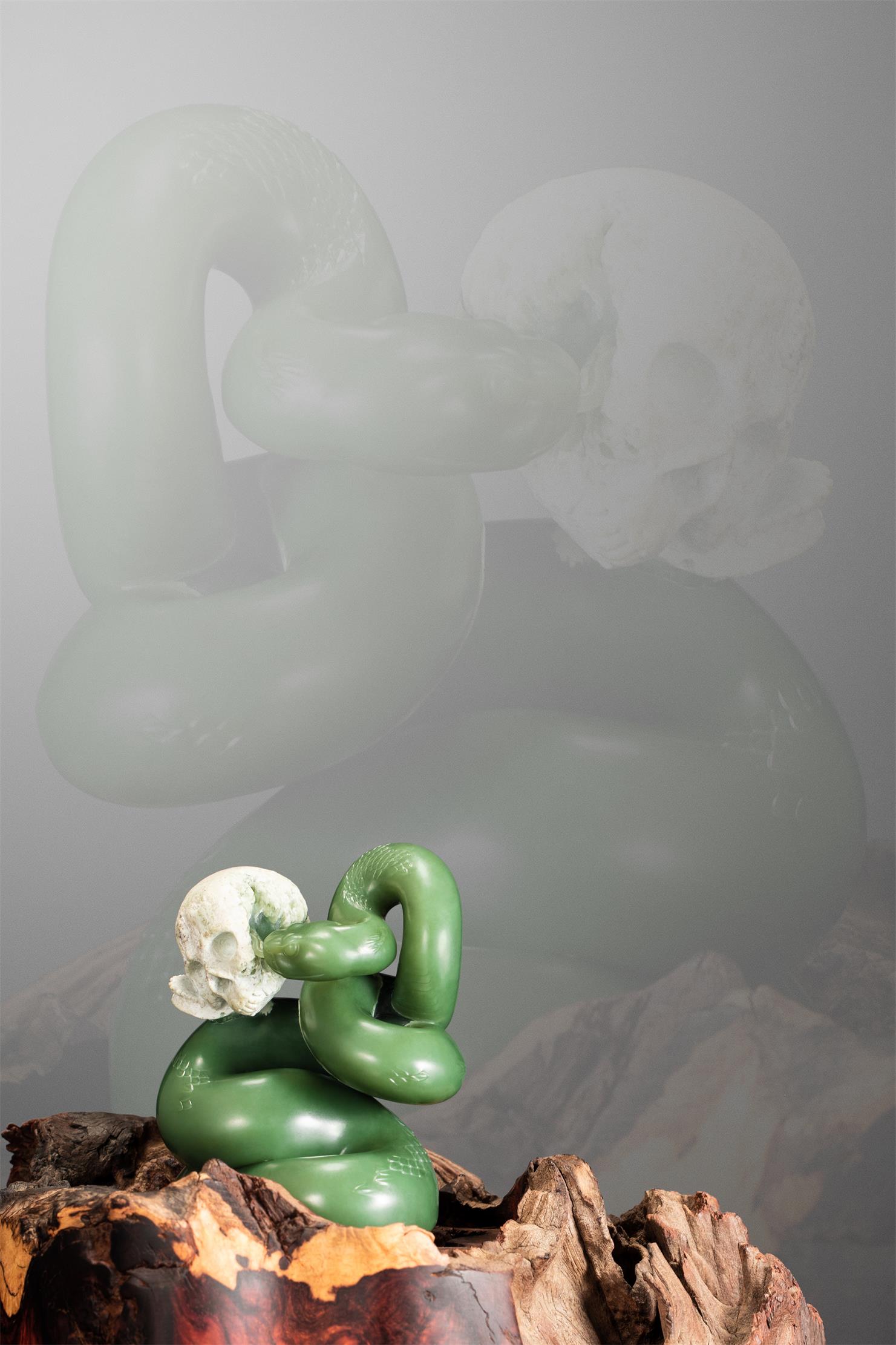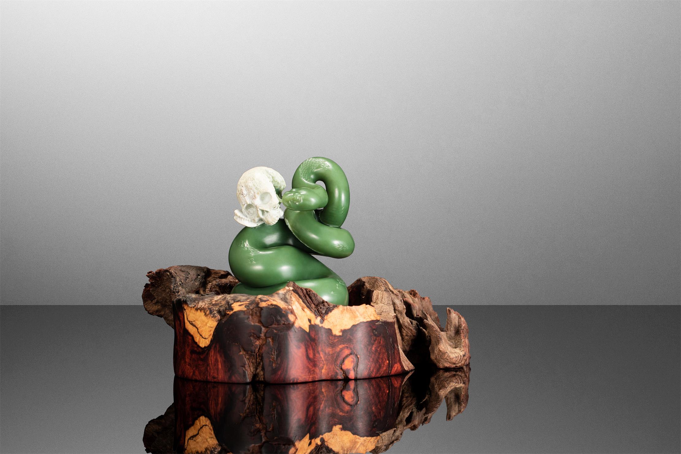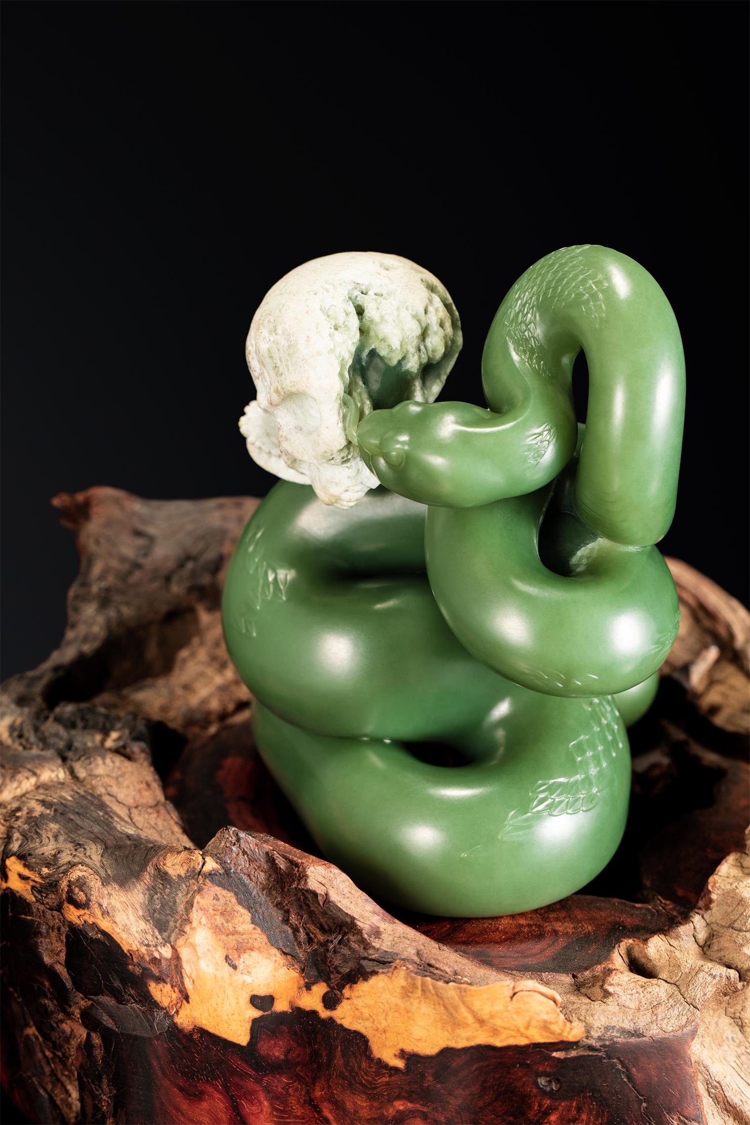 作品以清新润泽的绿肉塑造主角“蛇”,以白皮为辅镂雕“骷髅头”。