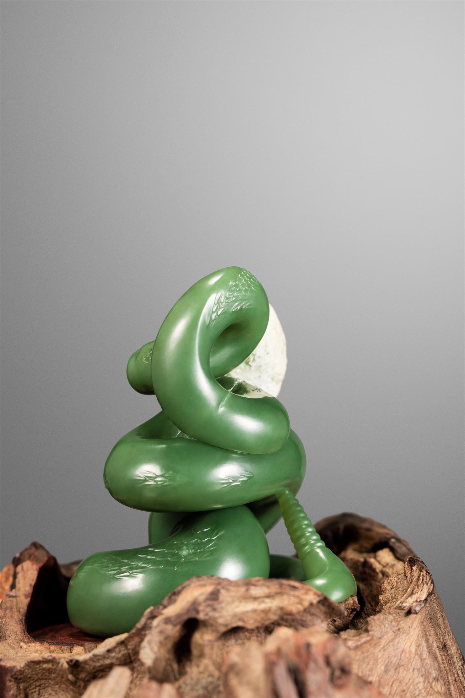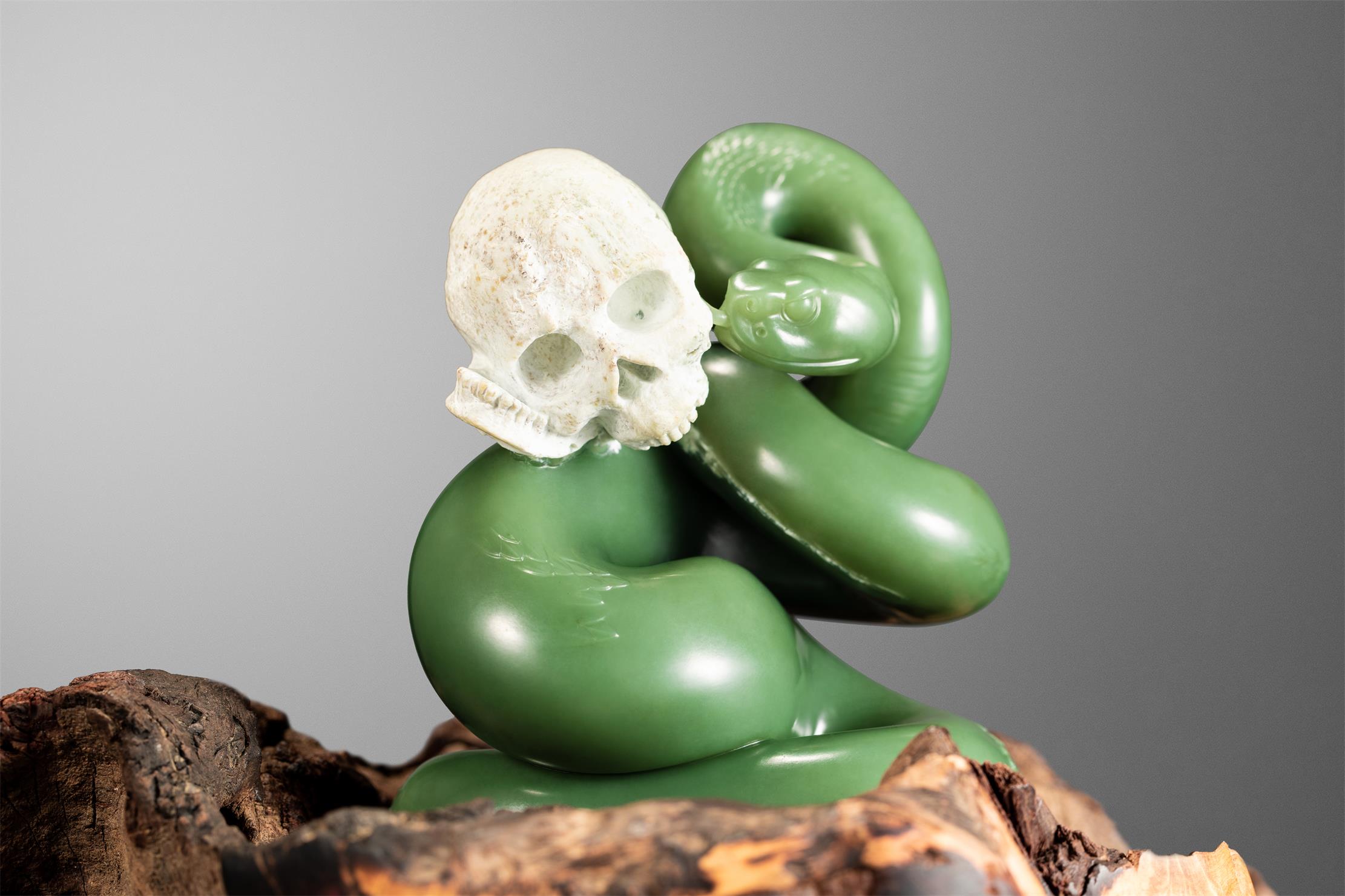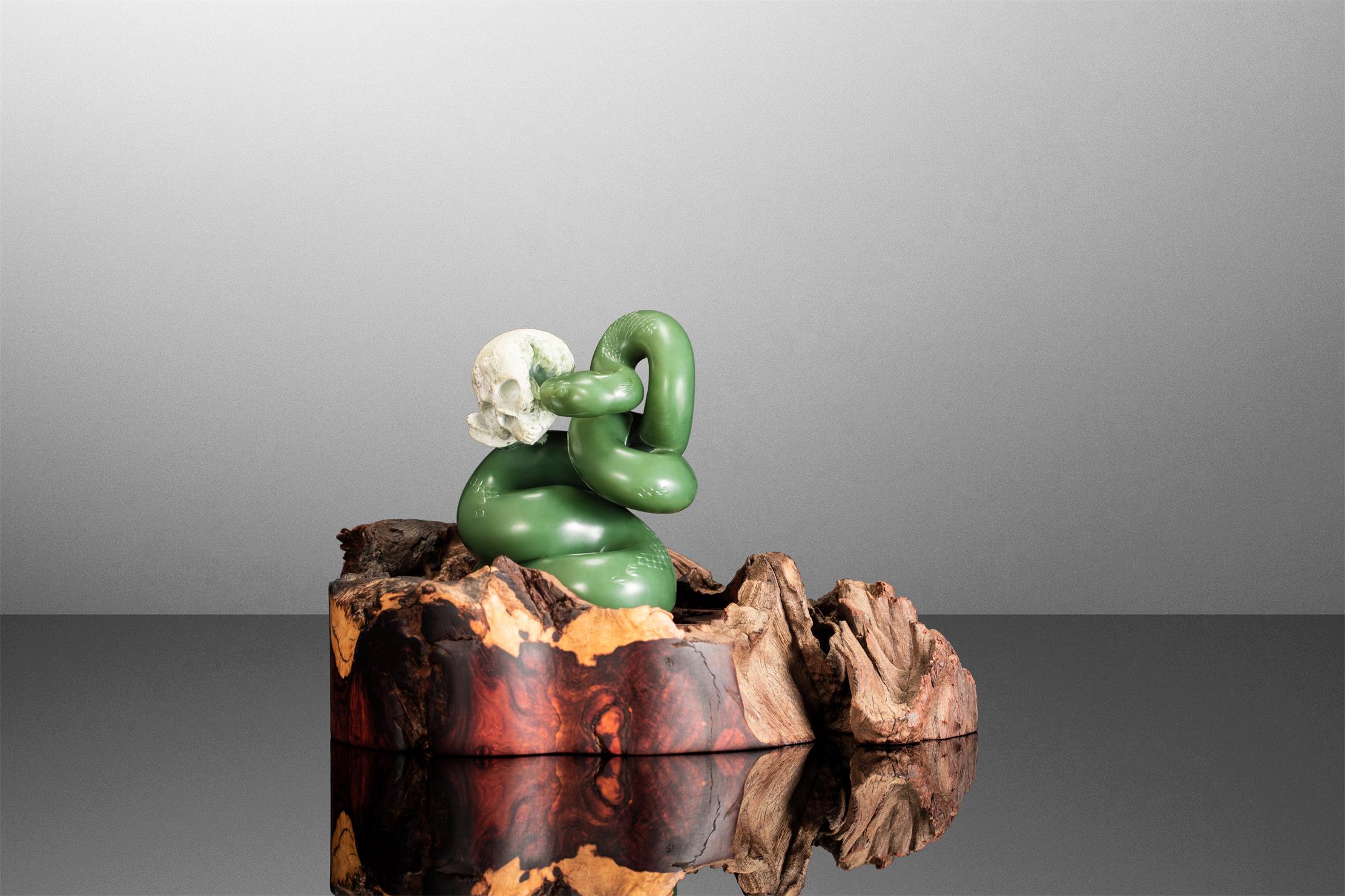 作品以清新润泽的绿肉塑造主角“蛇”,以白皮为辅镂雕“骷髅头”。