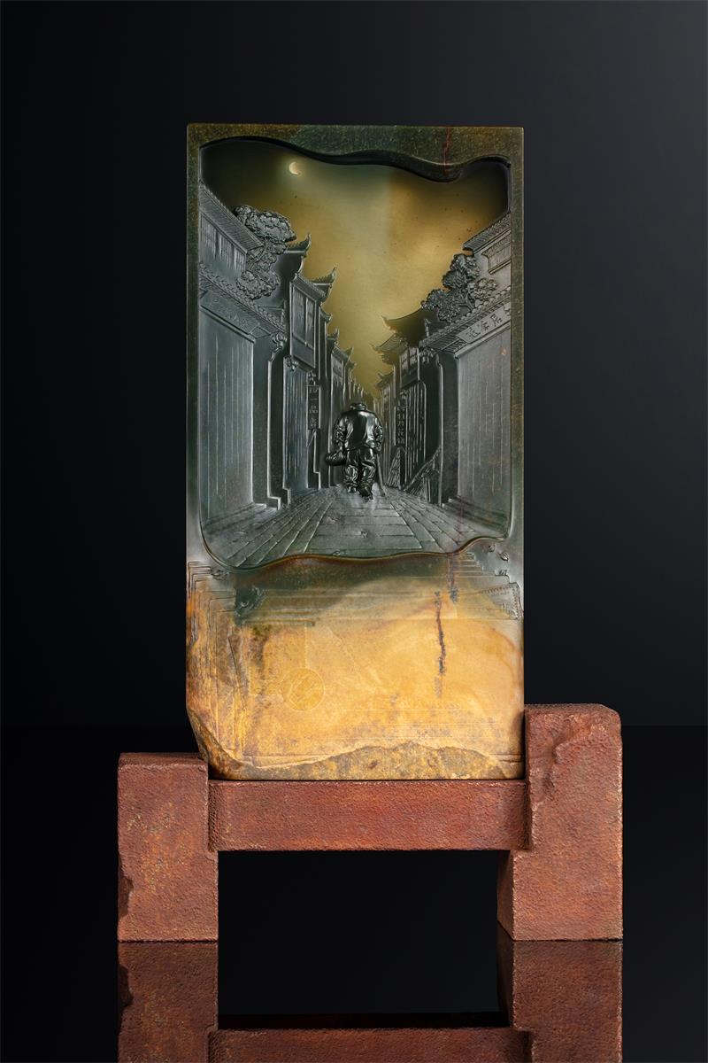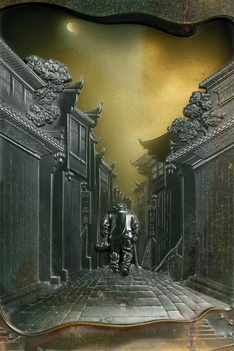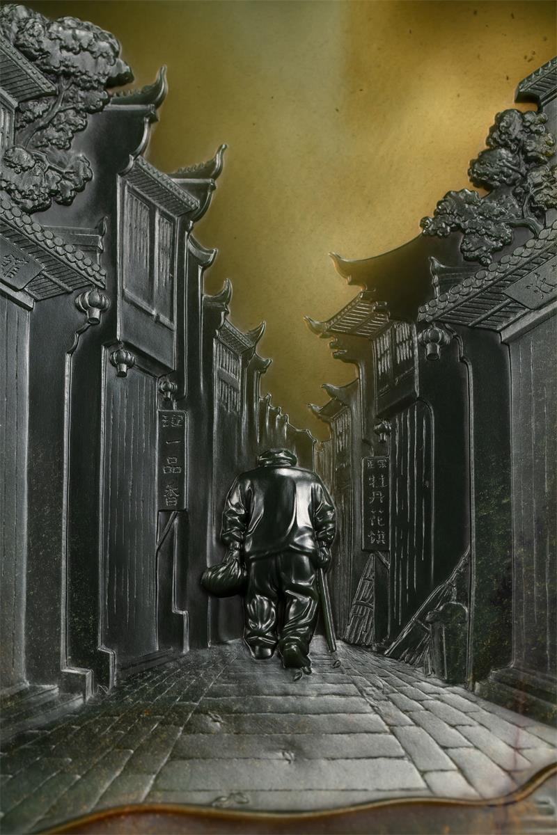 我问赵大师:“玉雕是人文与自然的结合,您是怎么想到以《背影》为主题,巧妙利用料性,呈现相得益彰的美?”