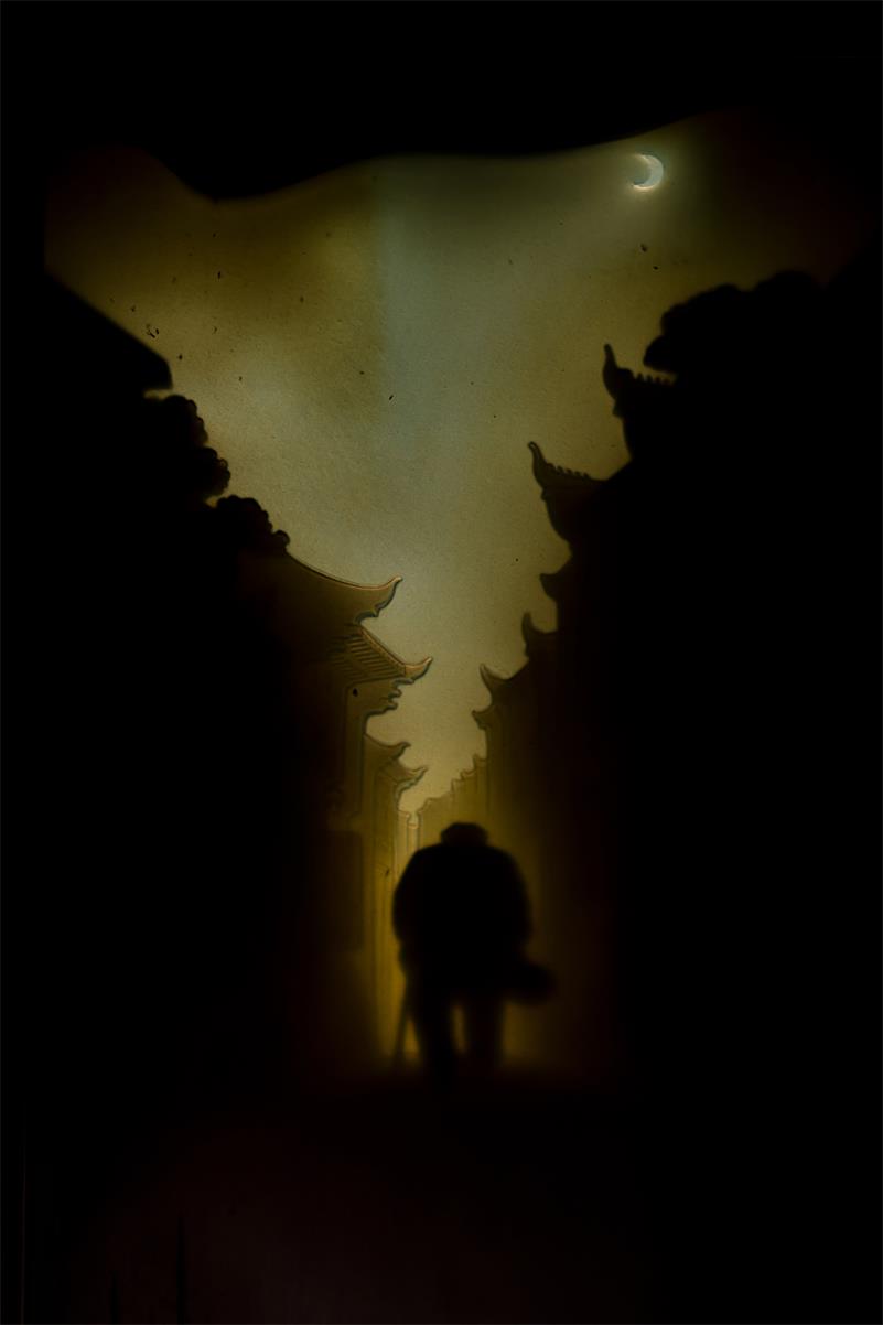 画面上,残月当空,两排檐角挺翘的古宅,被清冷的光晕拉伸得极为幽深与寒凉。