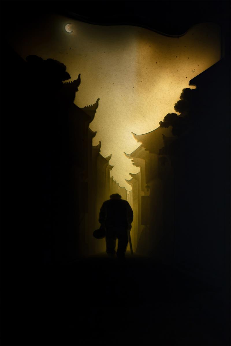 巷口尽头,一个佝偻的老者,一手紧抓个包裹,一手拄着拐杖,蹒跚在夜幕归途。