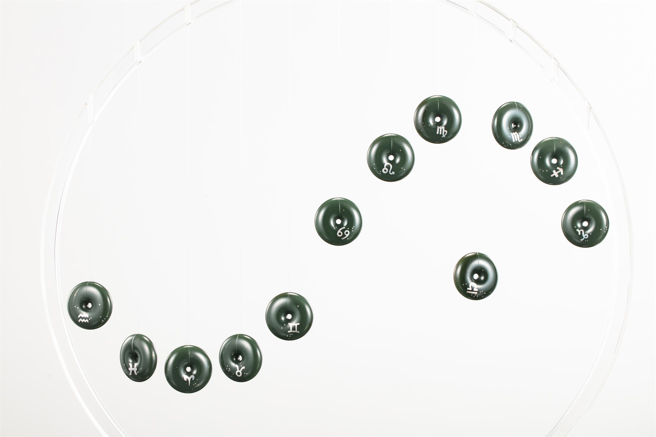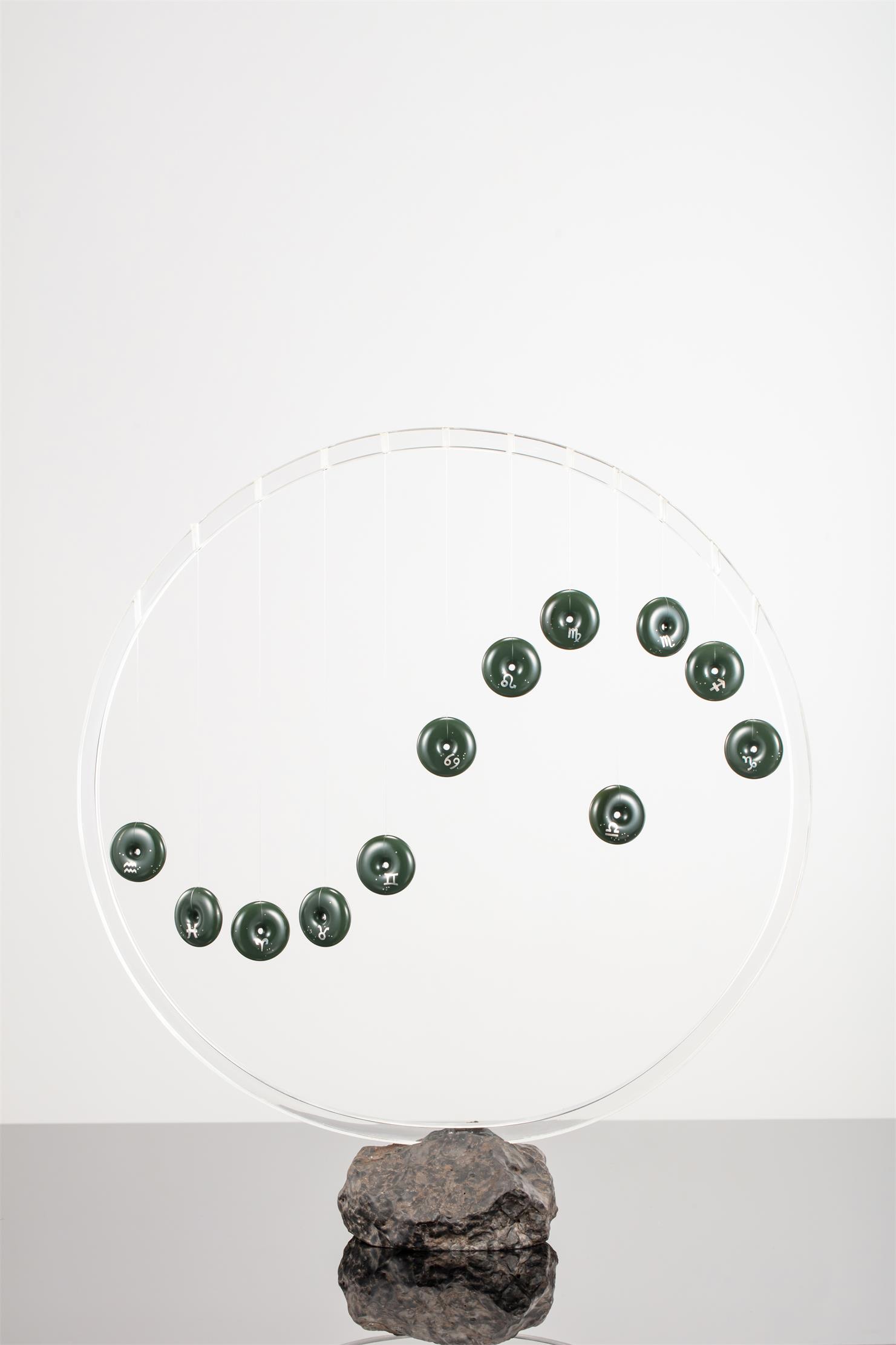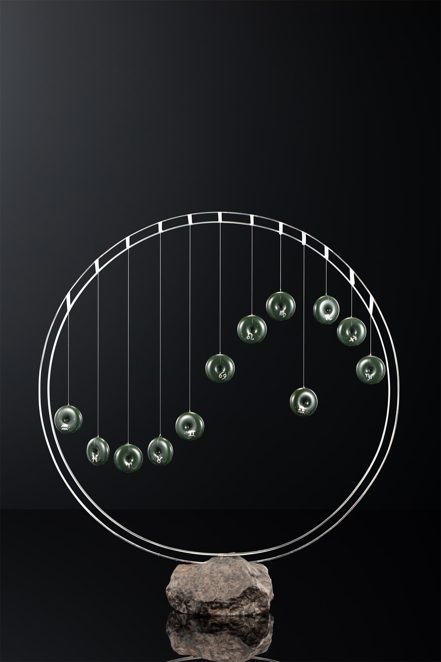 作品中象征“天”的透明圆形环,吊起错落有致的十二个平安扣,扣形圆融小巧,排列顺序与透明环组成一个形似“太极”的图案,太极即“道”也。