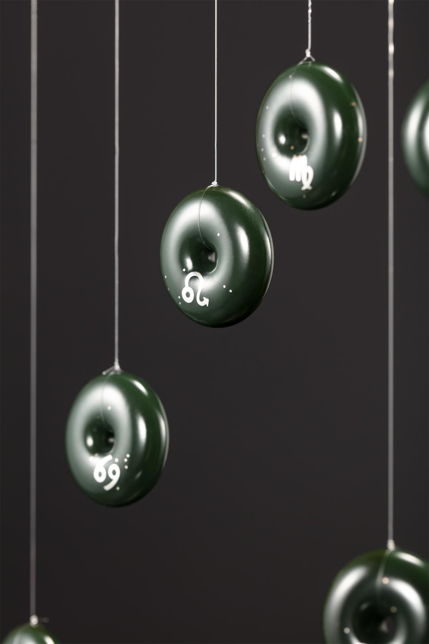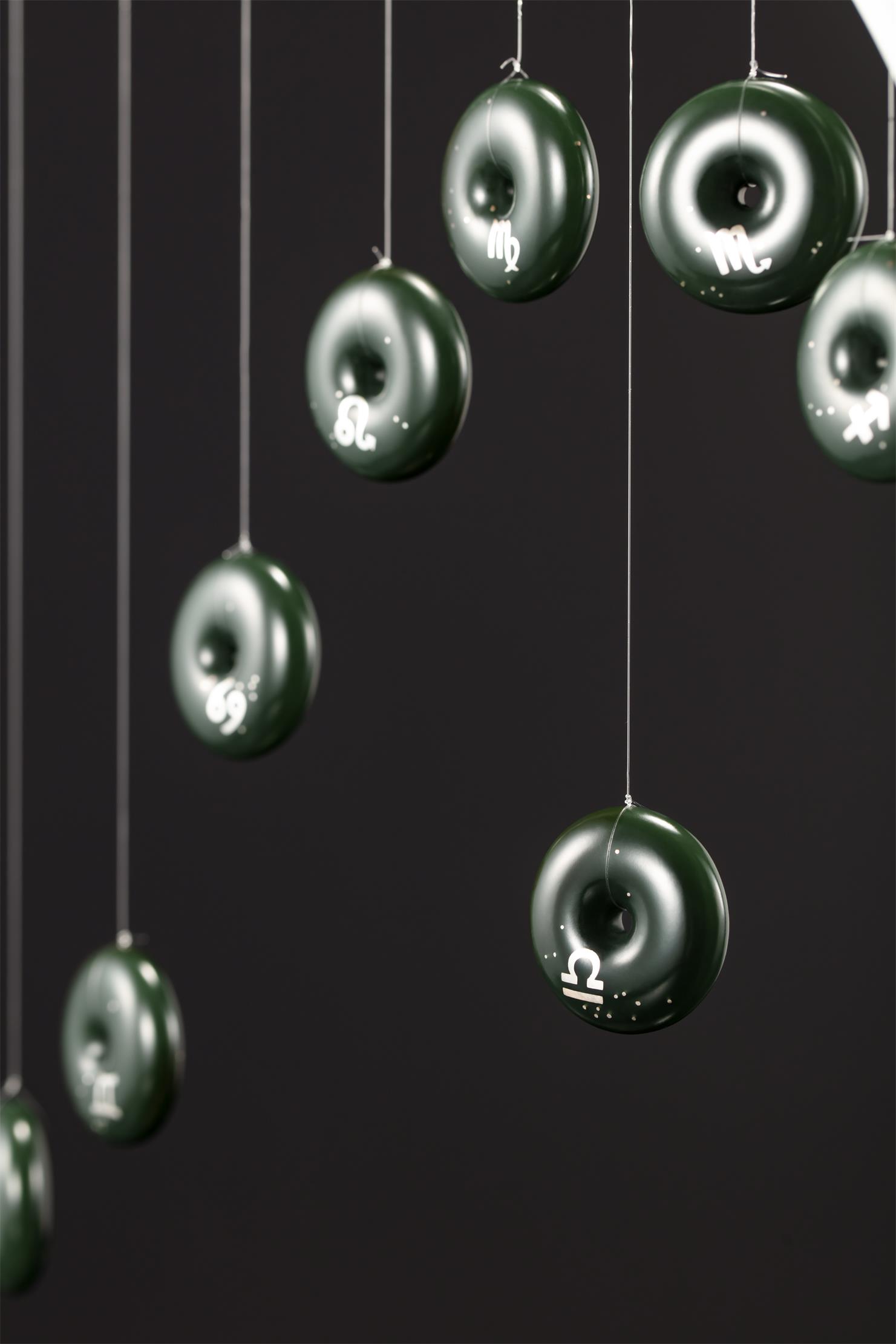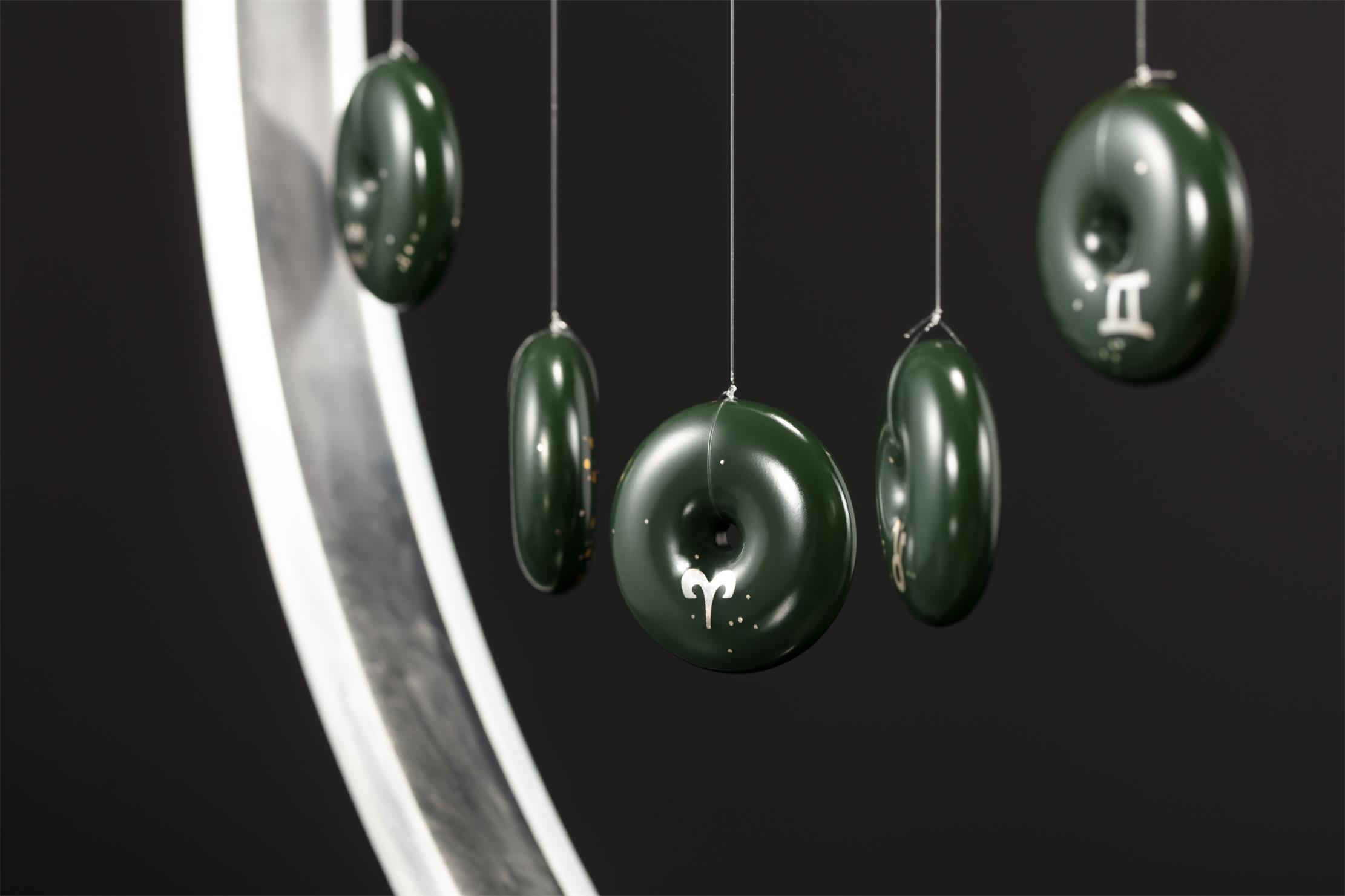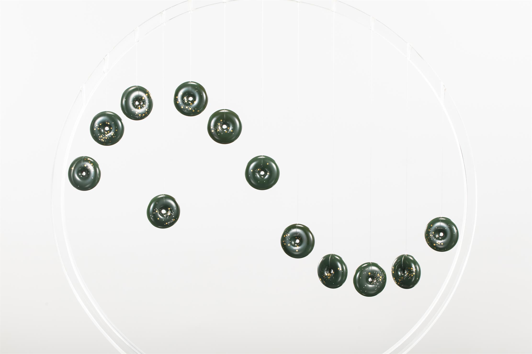 作品中象征“天”的透明圆形环,吊起错落有致的十二个平安扣,扣形圆融小巧,排列顺序与透明环组成一个形似“太极”的图案,太极即“道”也。