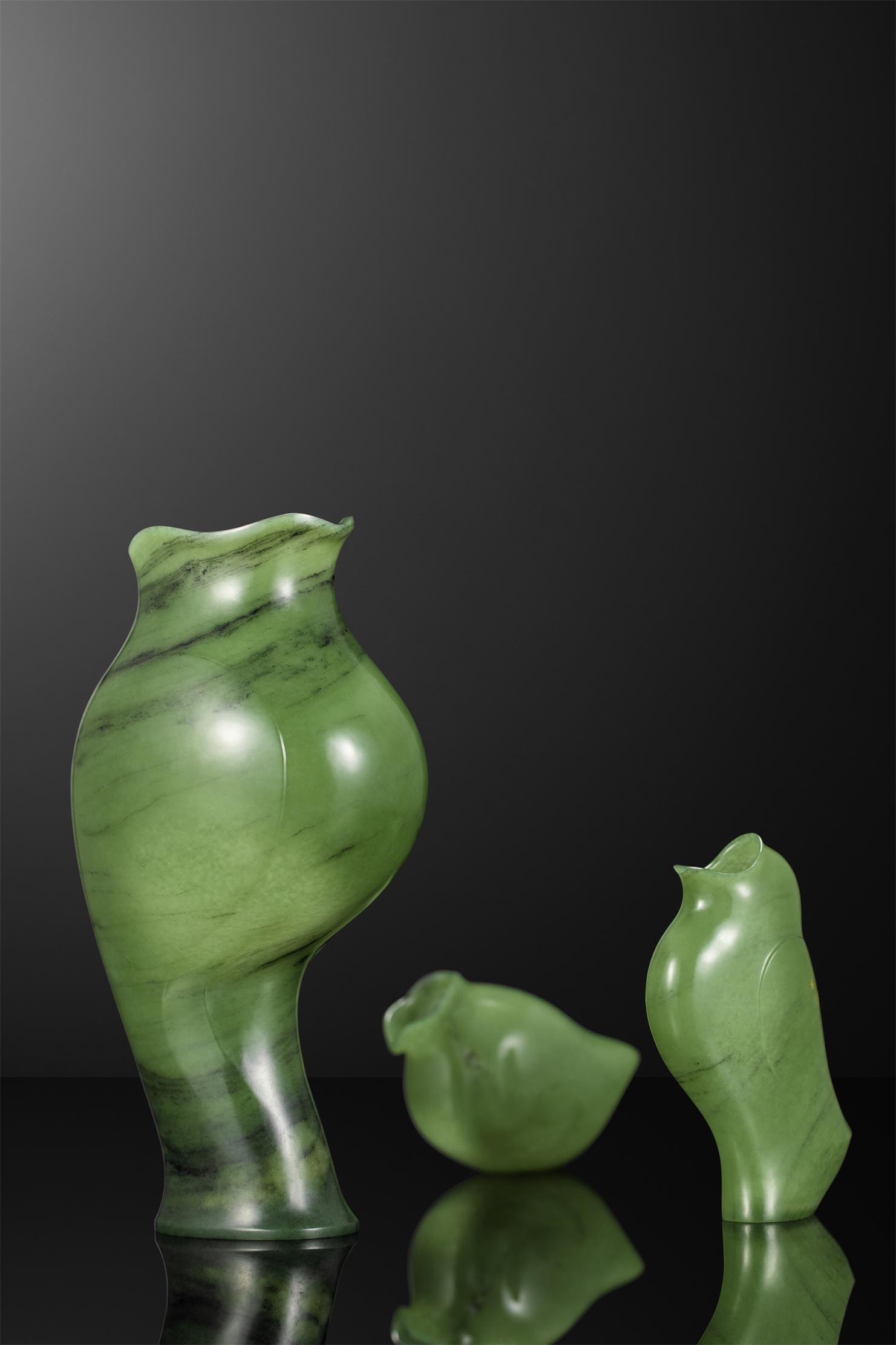 两小瓶是大瓶的边角料。大瓶挺拔伟岸,代表像雄鹰一样守护子女的父亲。其简约硕大的身体,很有鸟型的抽象概括感,寓意有容乃大。向上开敞的器口,呈现正在哺食的状态。