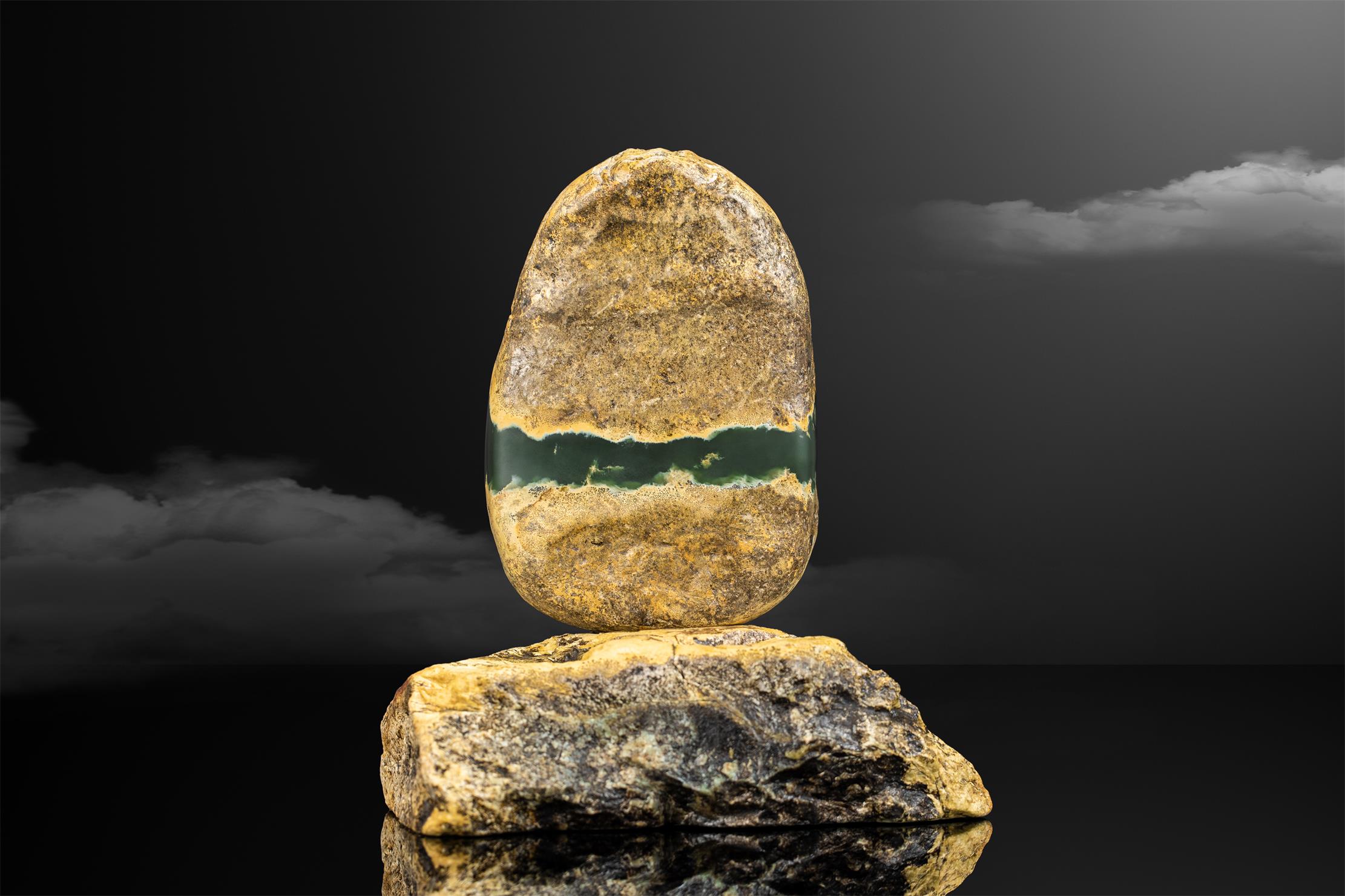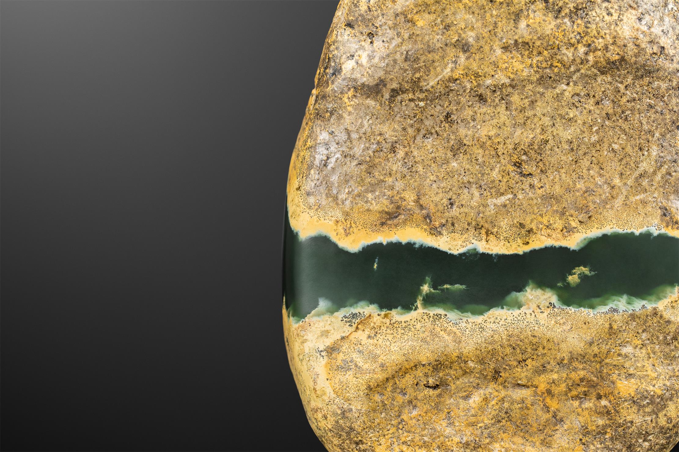 “蛋”的中间露出一窄条色泽沉静的绿色玉肉,里面缥缈丝丝缕缕的云朵,看得出金黄浆皮下裹了一层洁白的原皮。