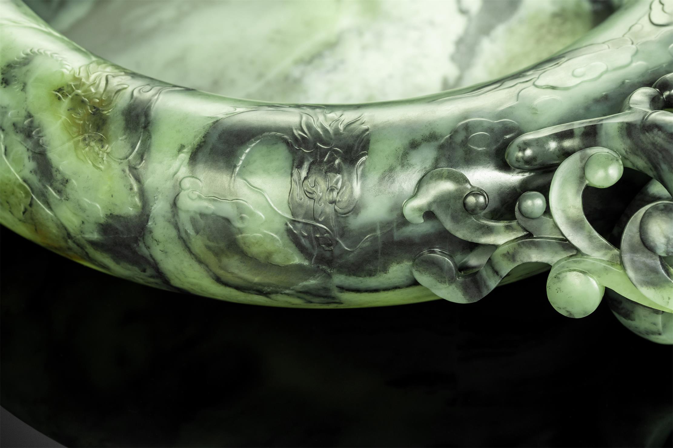 千璞滙旗下玉雕师李旭,最近就以析木玉的青花料,雕刻了一个与龙有关的笔洗,名为《九龙洗》。