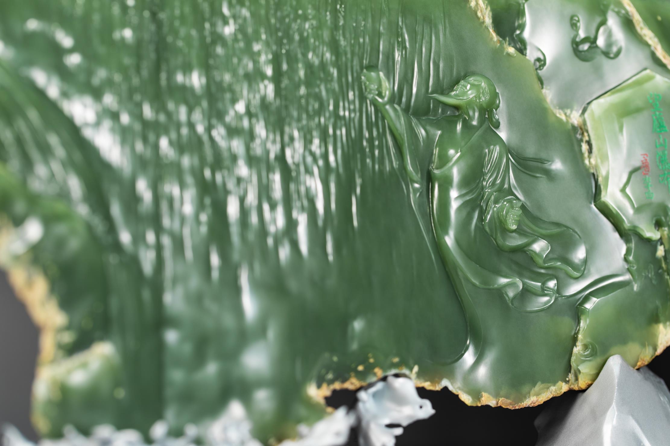 细润清新的绿色玉肉,右上端有三两处皲裂和色沁,作者对这一细节精心处理成层层堆叠的山壁、岩峰与溶洞。