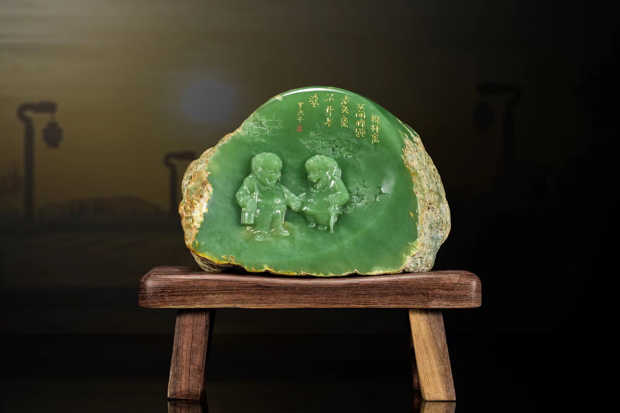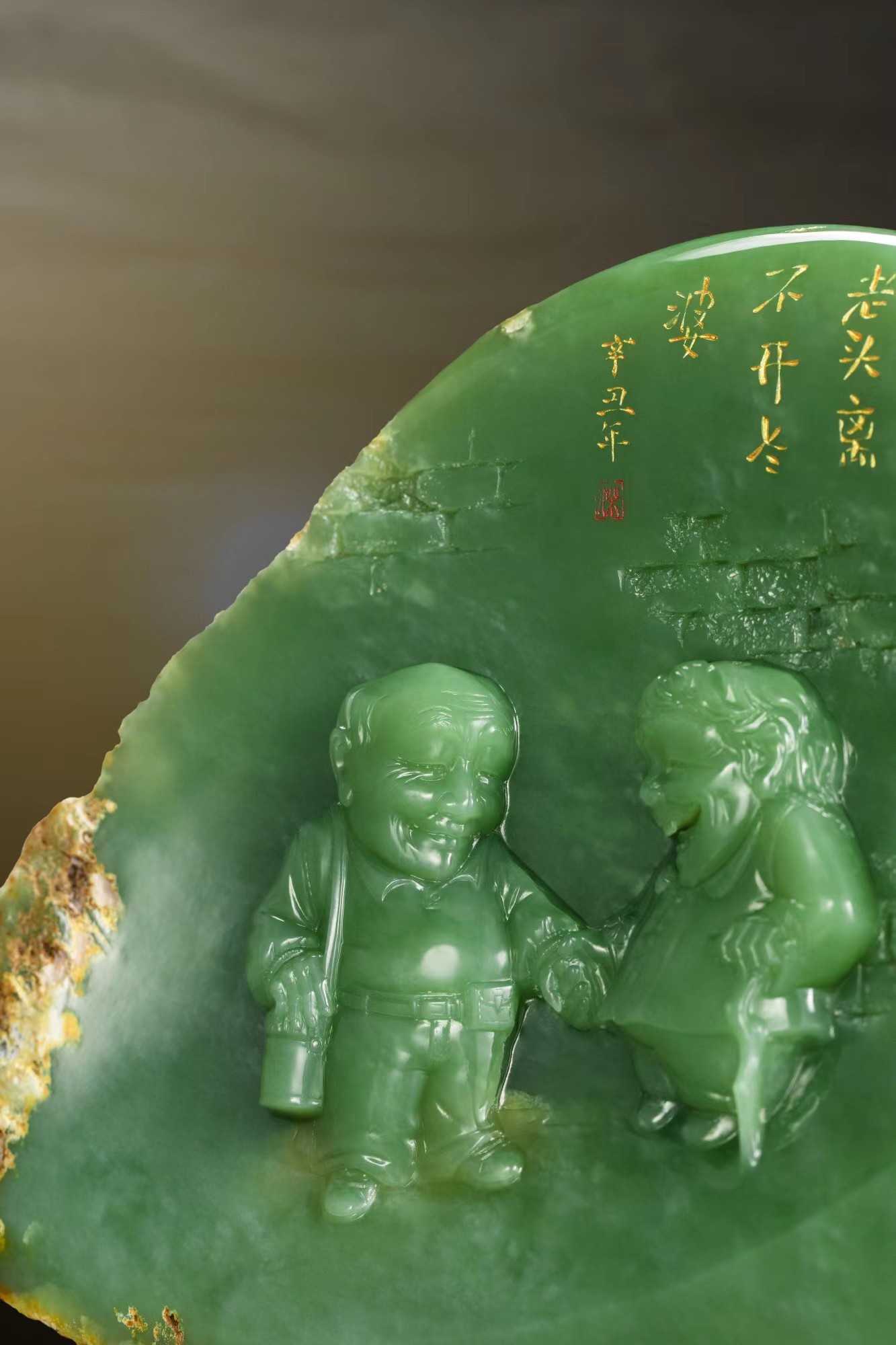 玉料上方镌刻金色字体“称杆离不开称砣,老头离不开老婆”,彰显出相濡以沫、相互搀扶的烟火爱情。