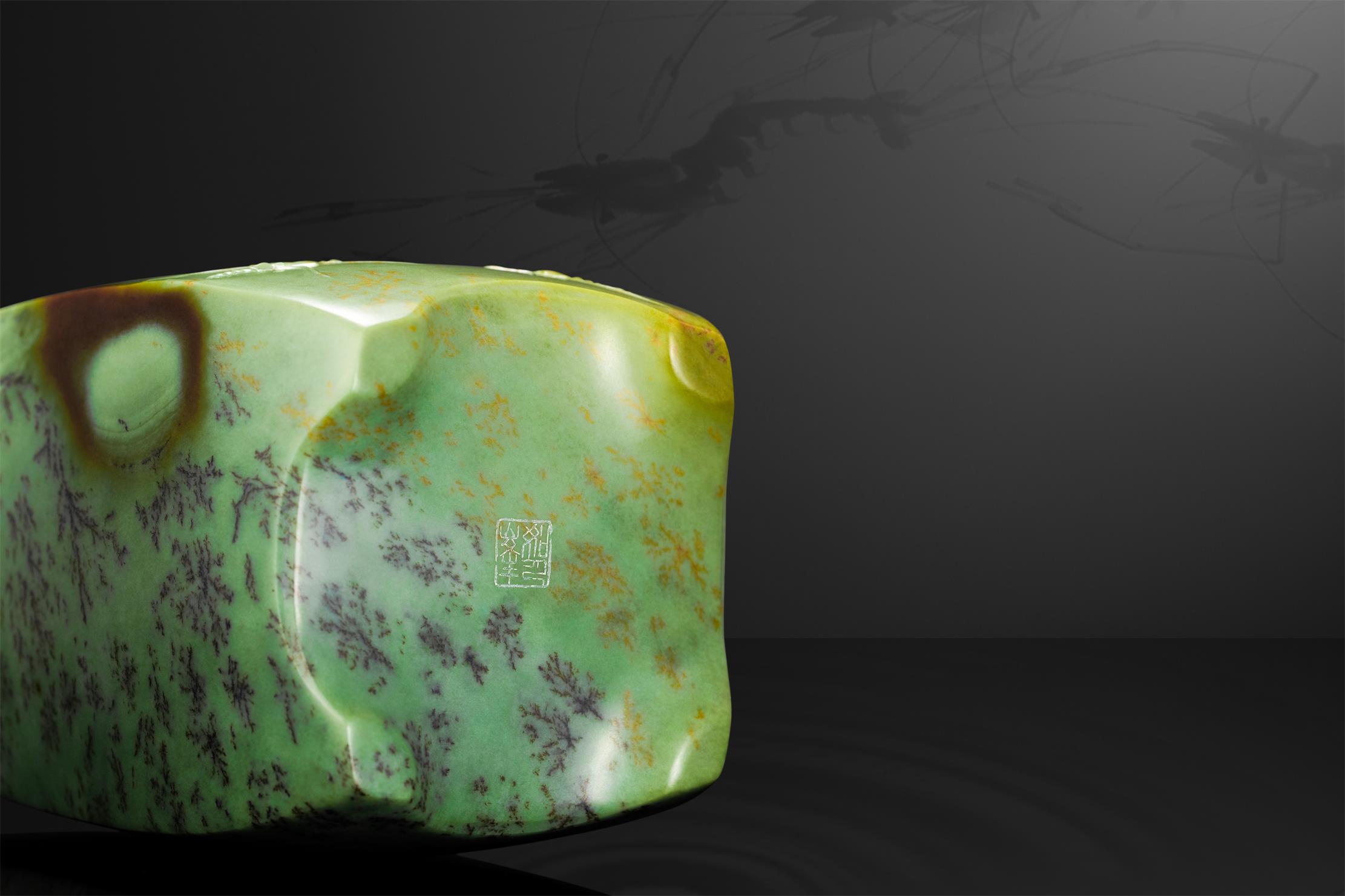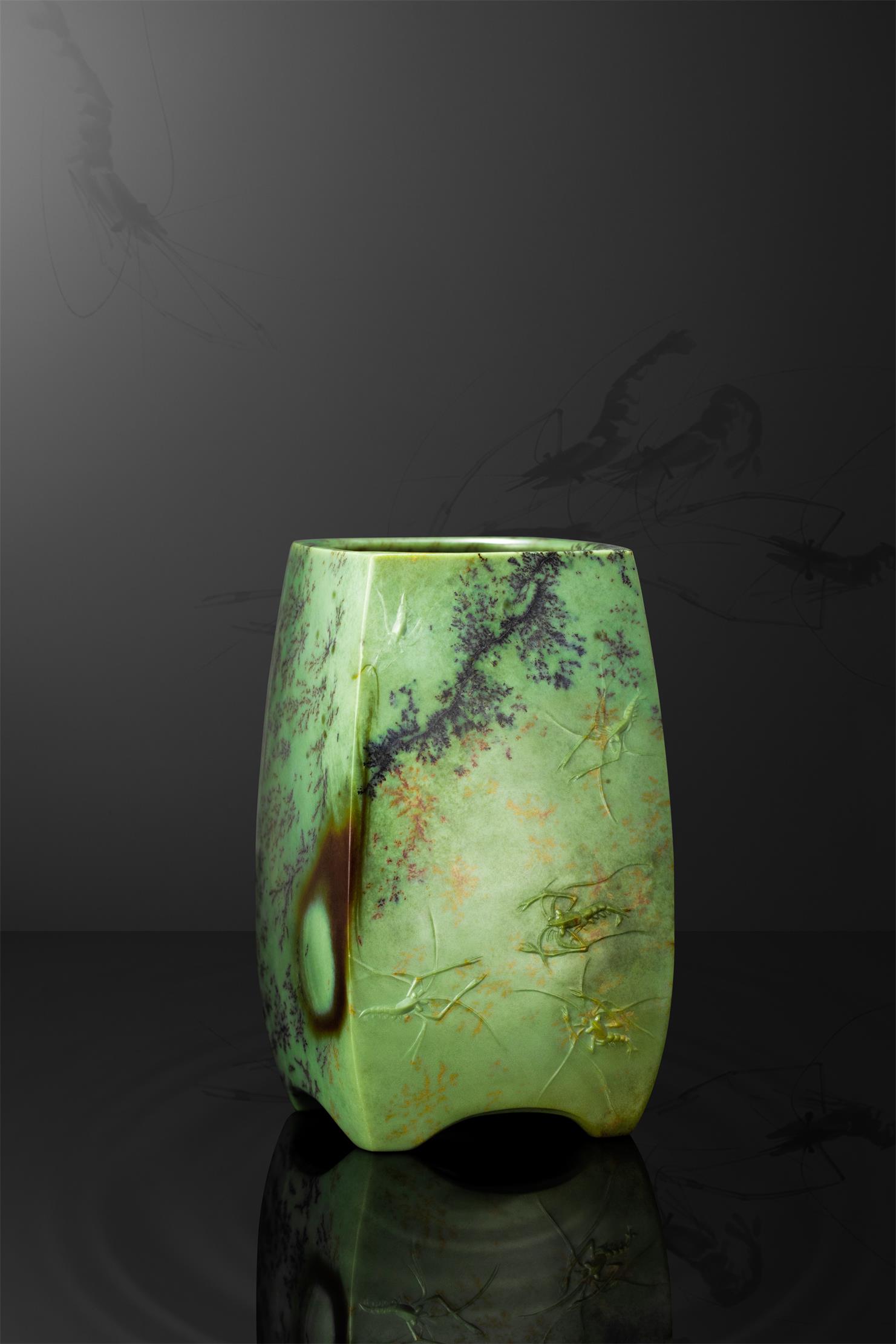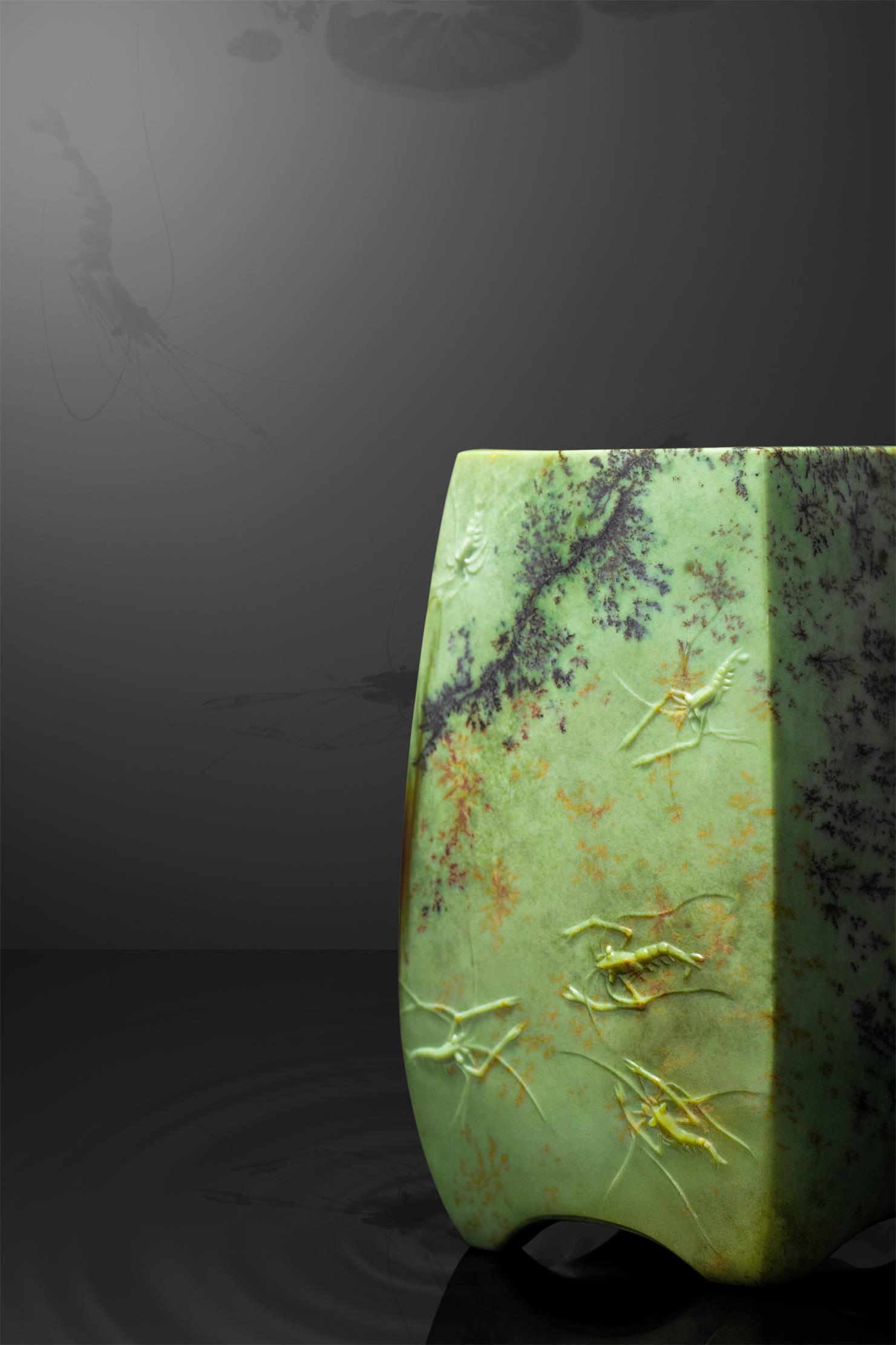 中国玉石雕刻大师、有 “薄胎阿四” 美誉的茹月峰,会意于有天然水草纹的稀有析木玉原石所呈现的水墨画境,以浮雕的方式在薄胎玉器上,刻绘下自己对生活的热爱,彰显其寄情于《虾趣》的独特审美意识与快乐闲适心境。