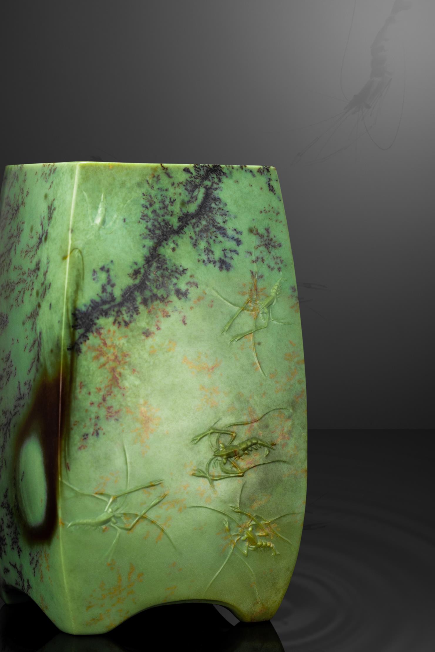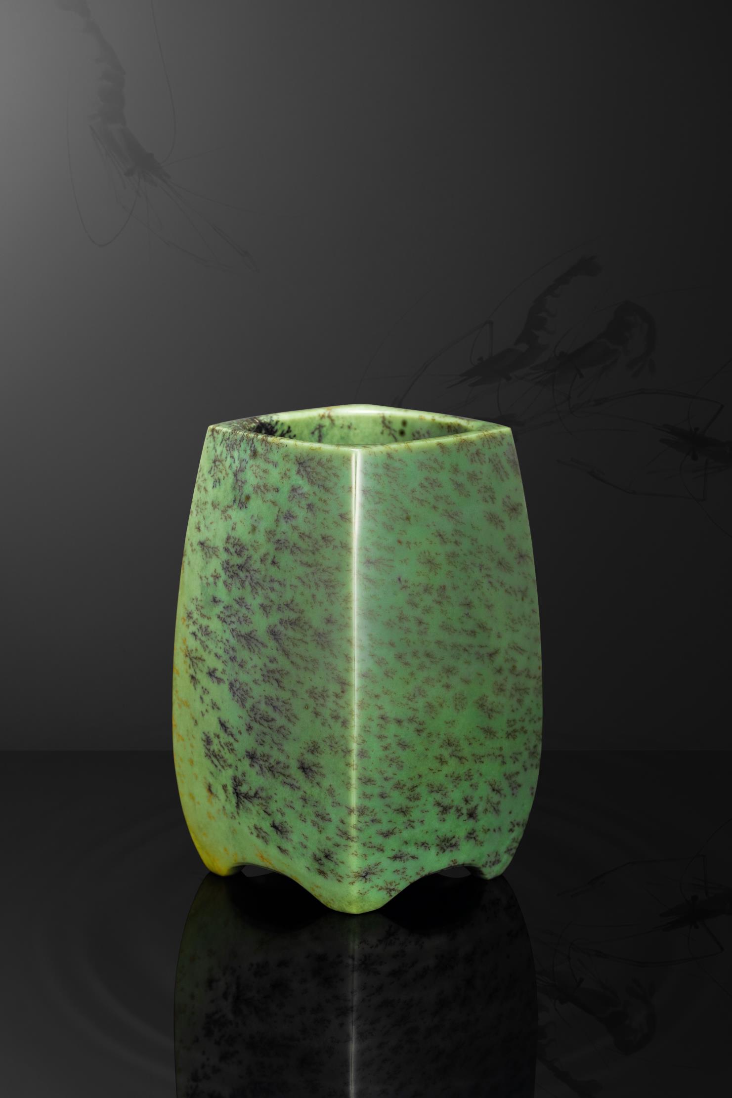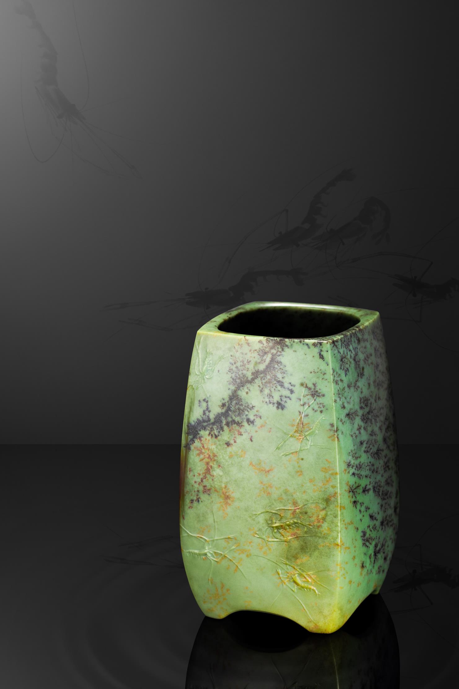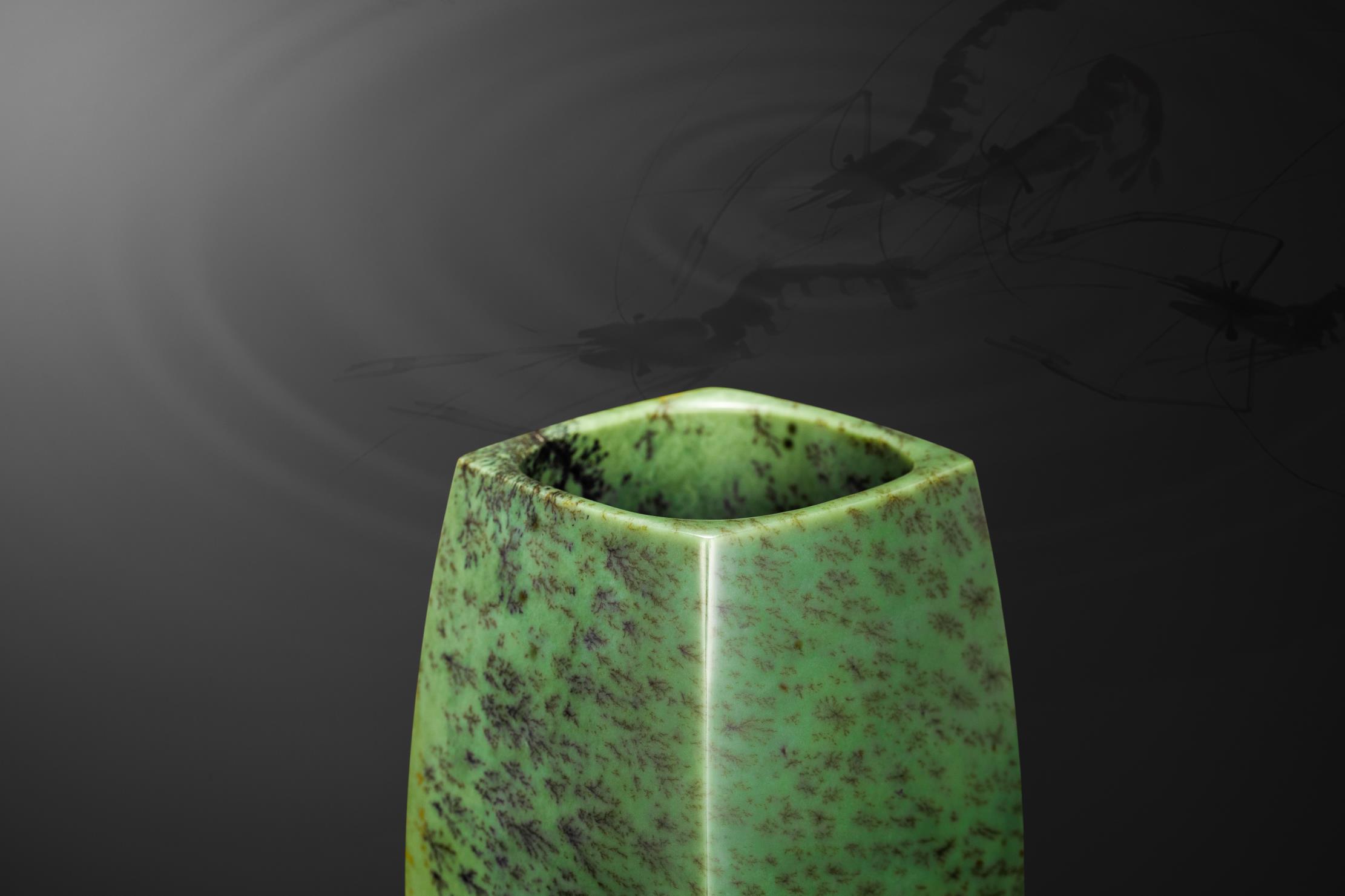中国玉石雕刻大师、有 “薄胎阿四” 美誉的茹月峰,会意于有天然水草纹的稀有析木玉原石所呈现的水墨画境,以浮雕的方式在薄胎玉器上,刻绘下自己对生活的热爱,彰显其寄情于《虾趣》的独特审美意识与快乐闲适心境。
