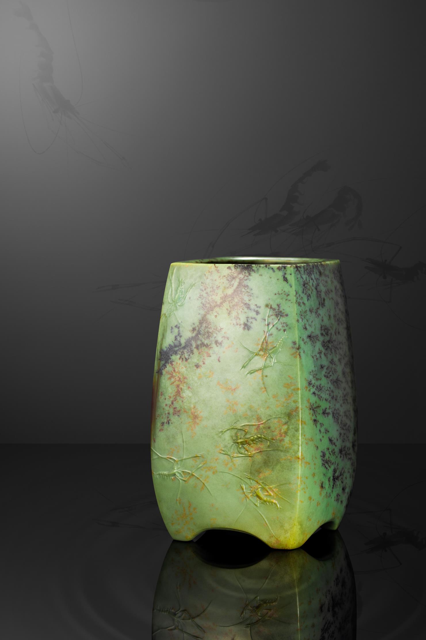 他在“初掏”后的瓶壁上,以精细工阳刻五只虚实结合的长臂大虾,兼顾其和水草纹间的关系,以及个体与整体的和谐互动关系。