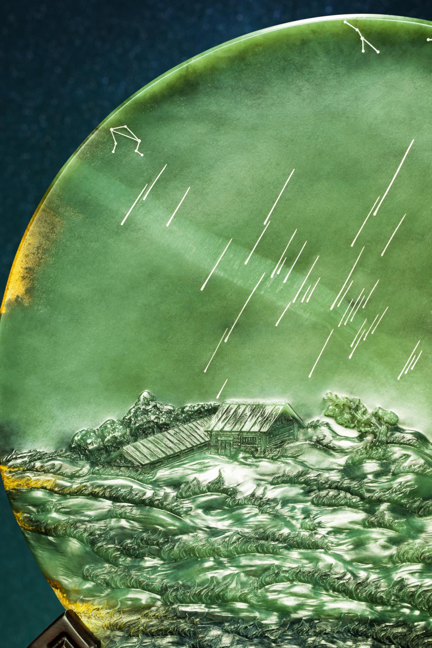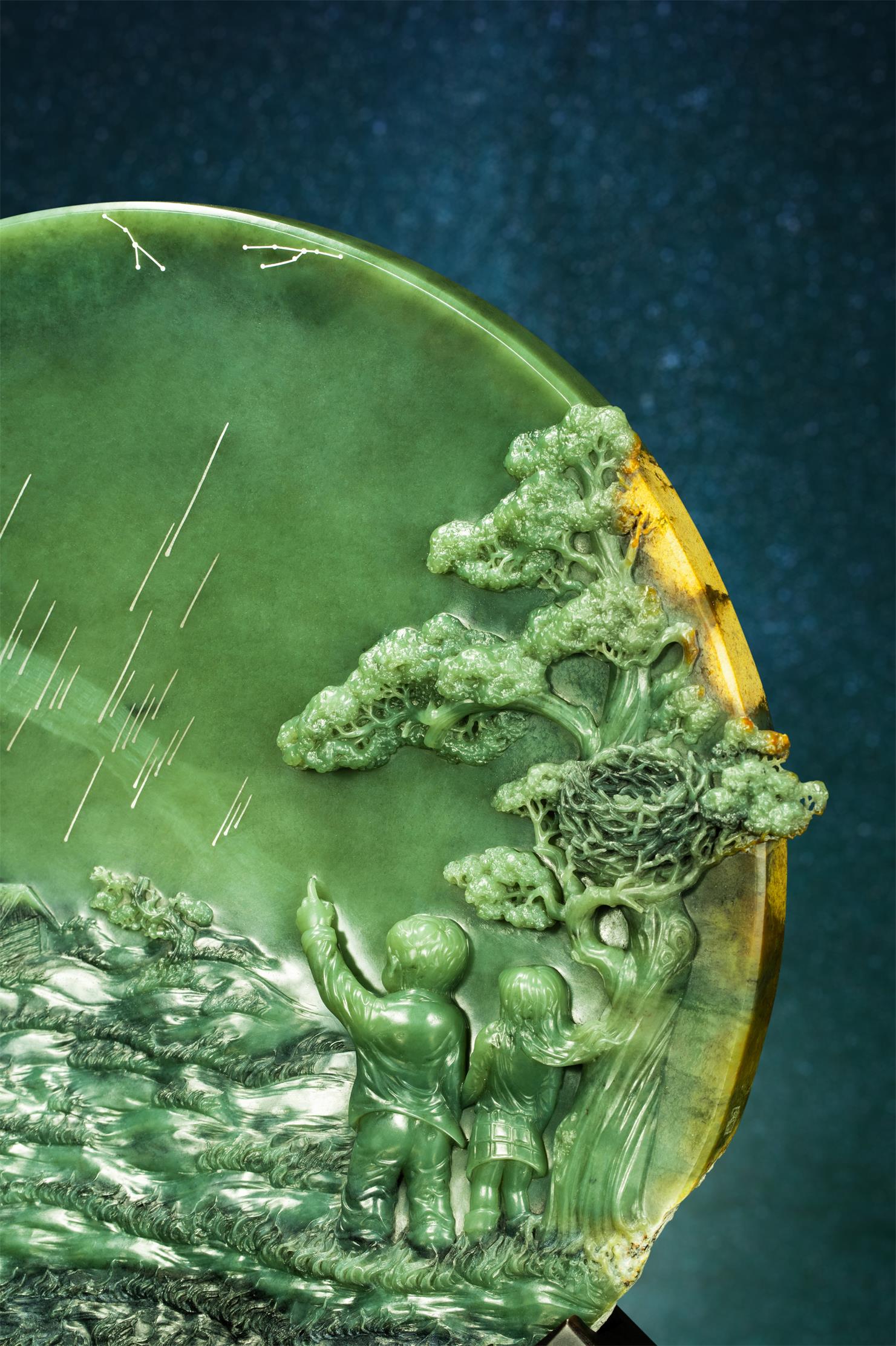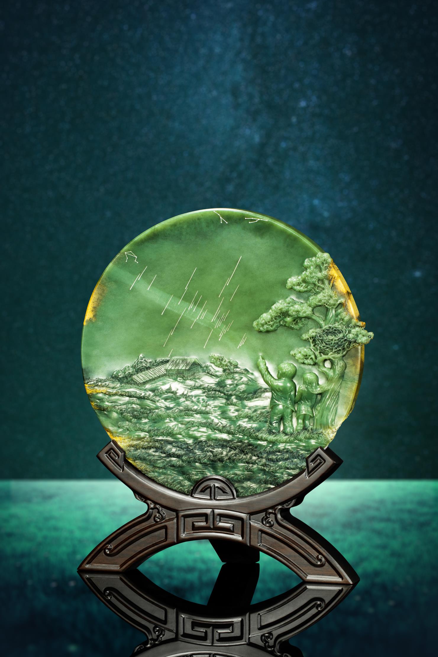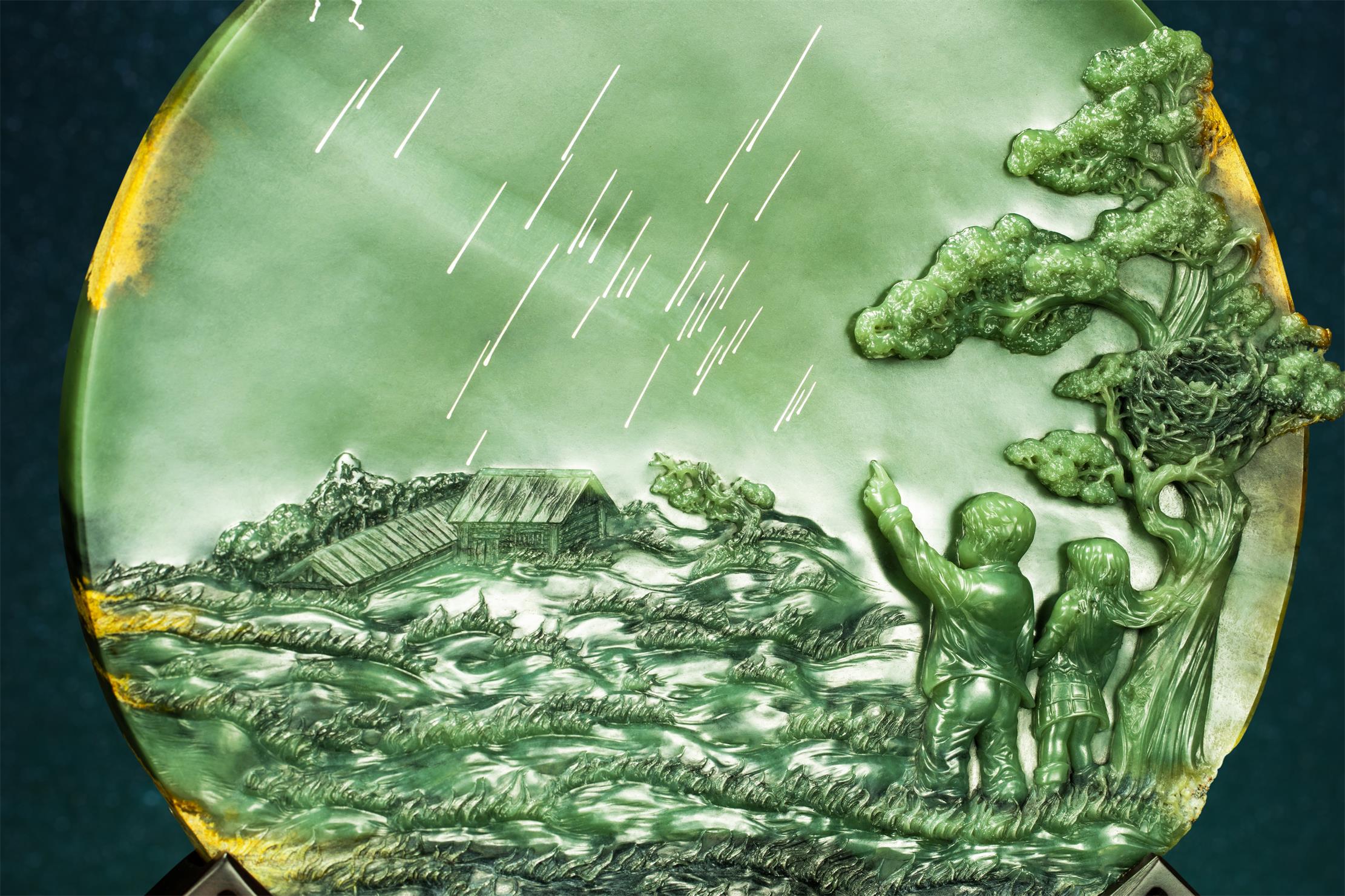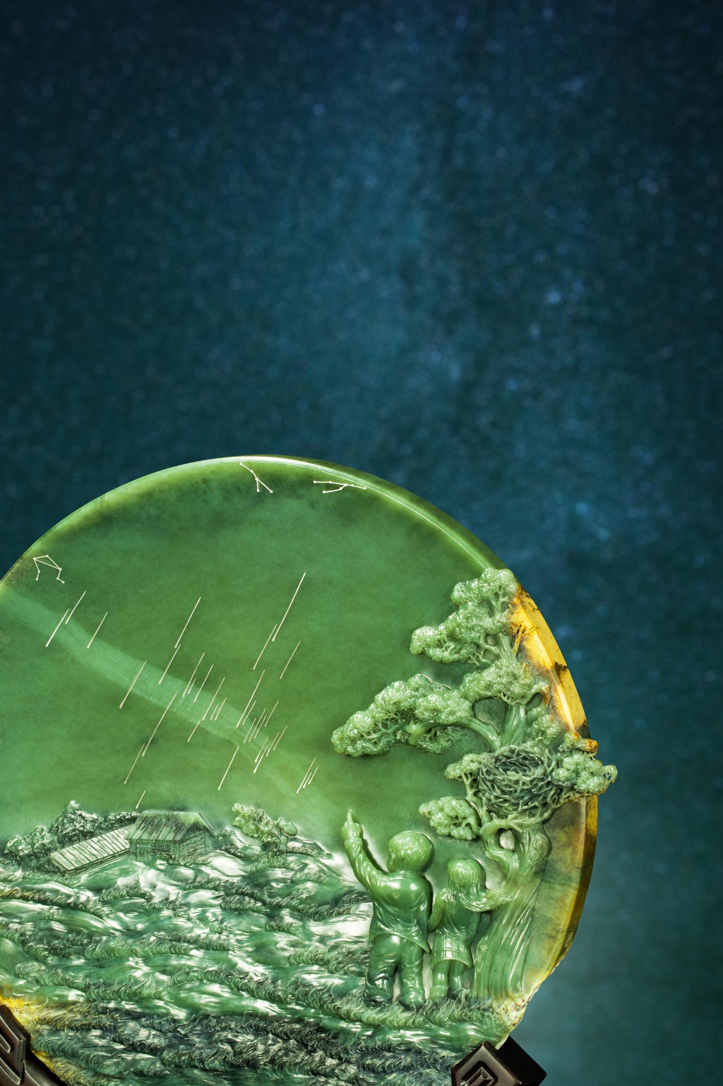中国玉石雕刻大师于杰,以“我”生命真意的体察和观照,将少时“我们”第一次一起去看流星璀璨的内心震撼与波澜起伏,定格成析木玉上的丹青画卷——《童年》。
