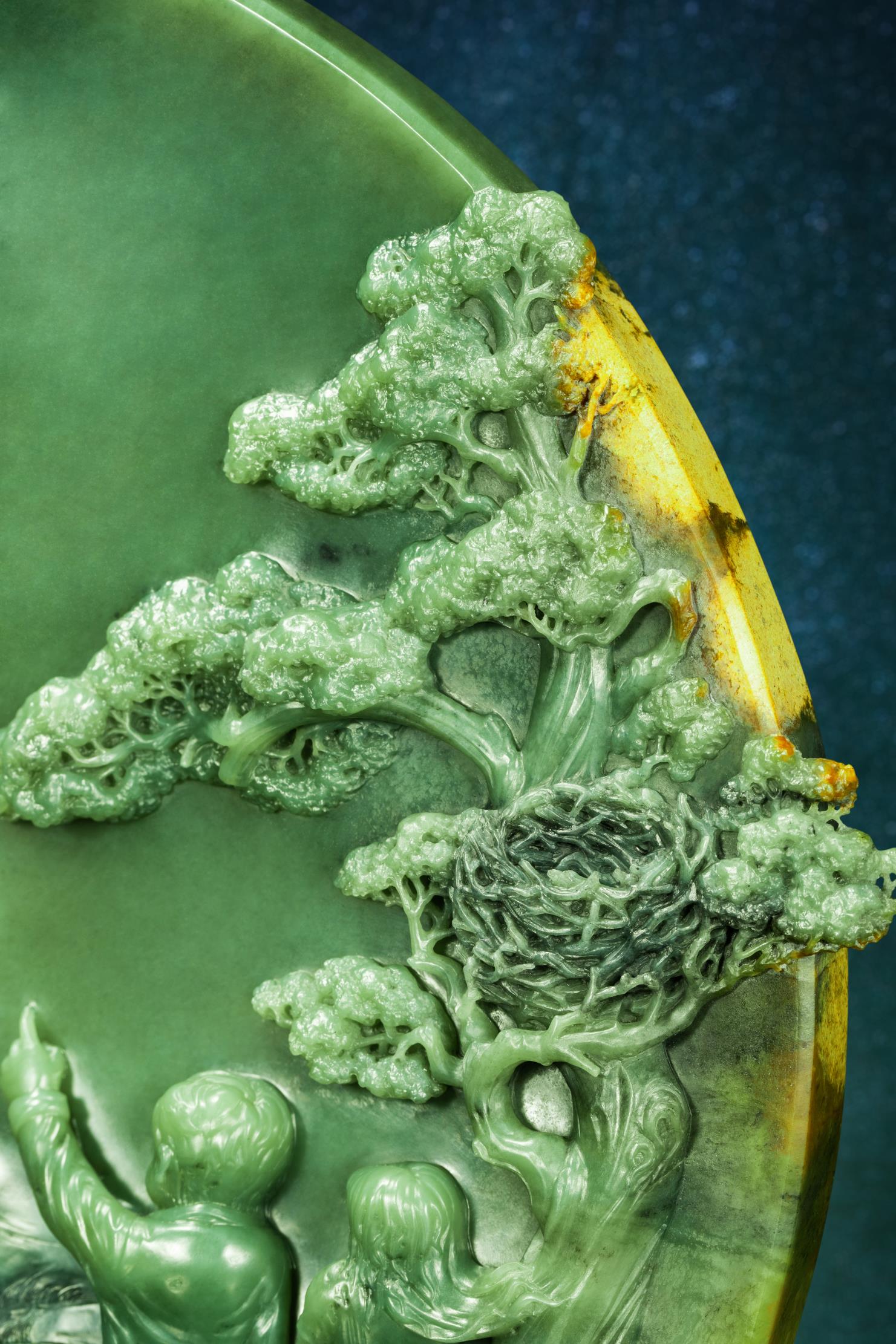 温润、和雅、沉静的玉肉,一半静谧成夜的神秘与空寥,一半涌动着绿色的激流与远阔,动静相宜地彰显着玉料品质与独特气度。