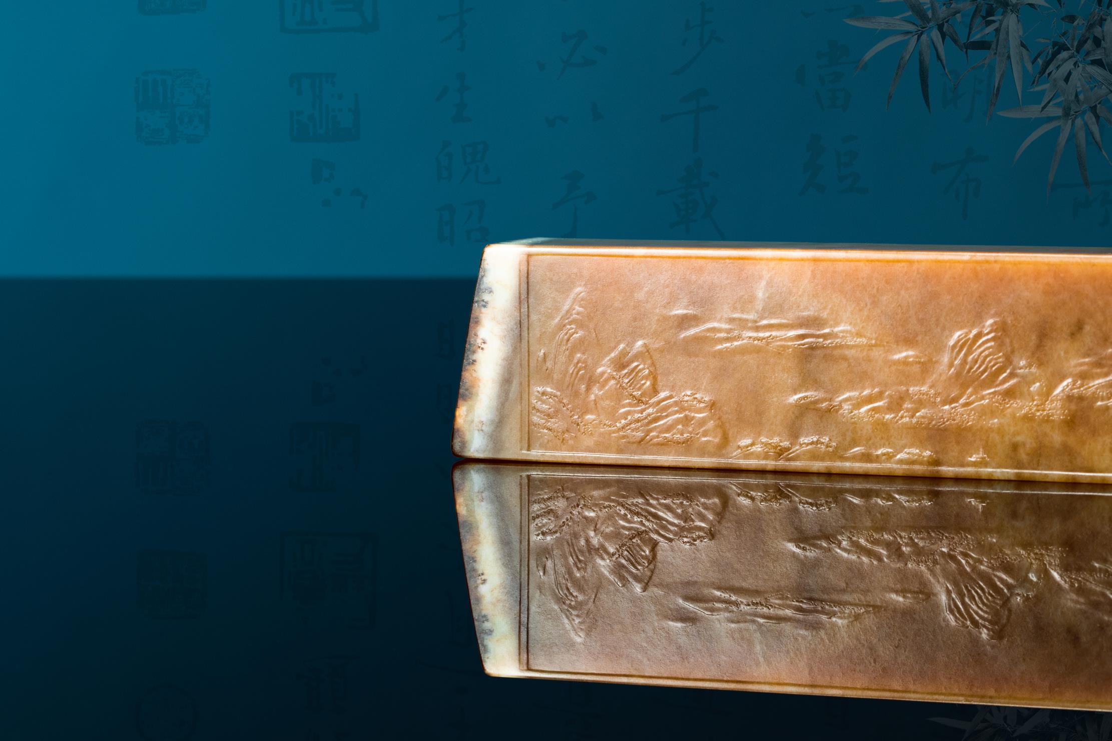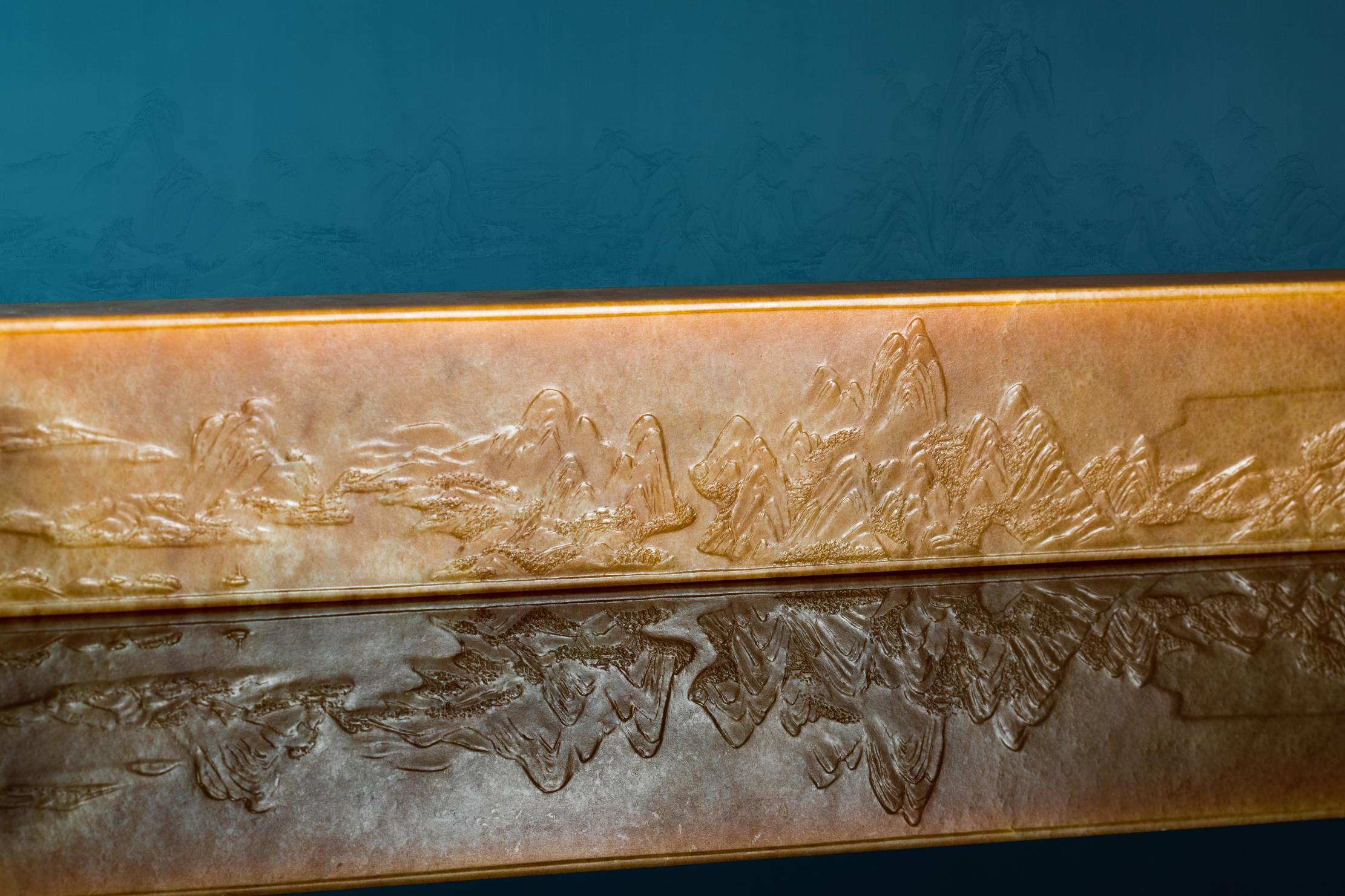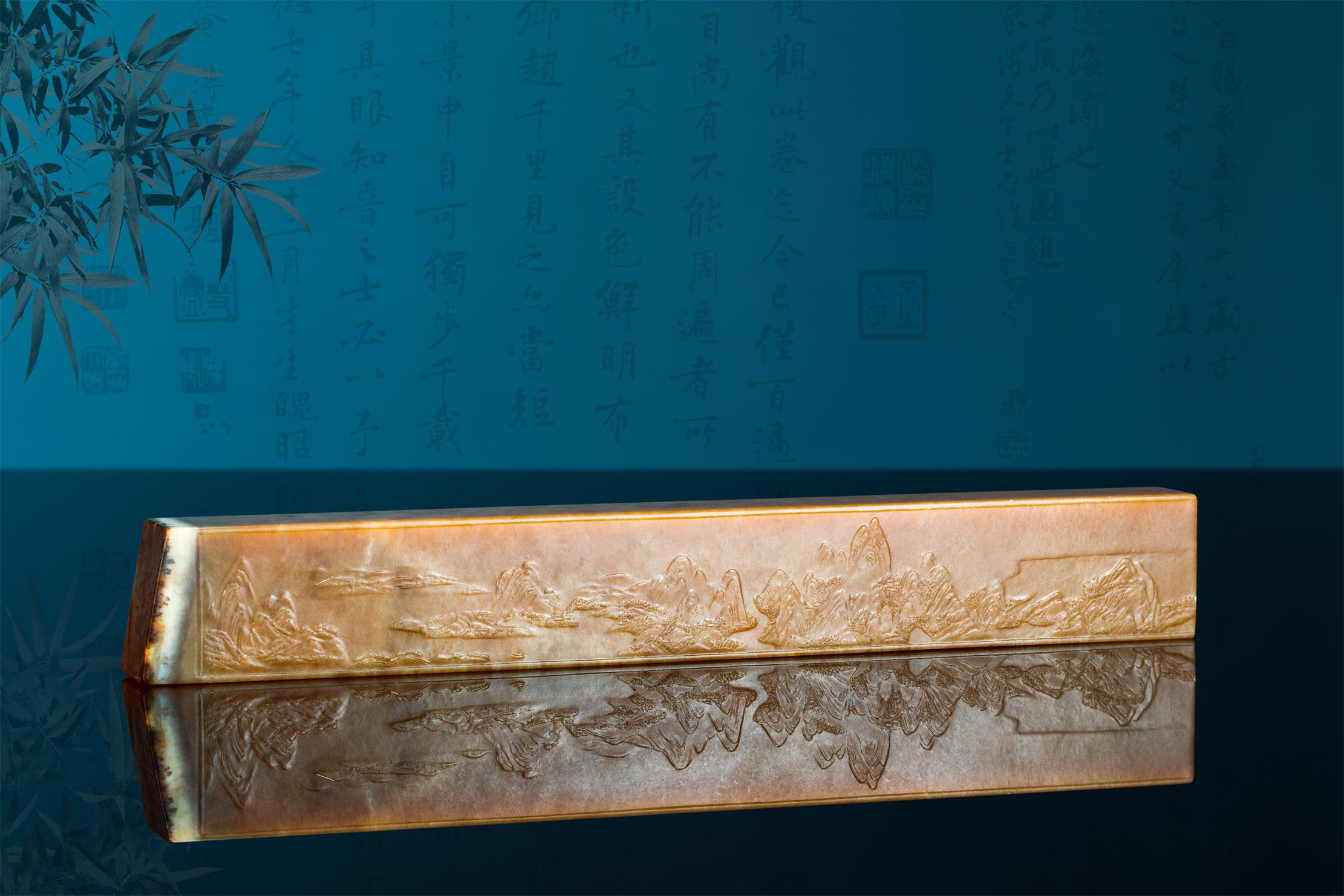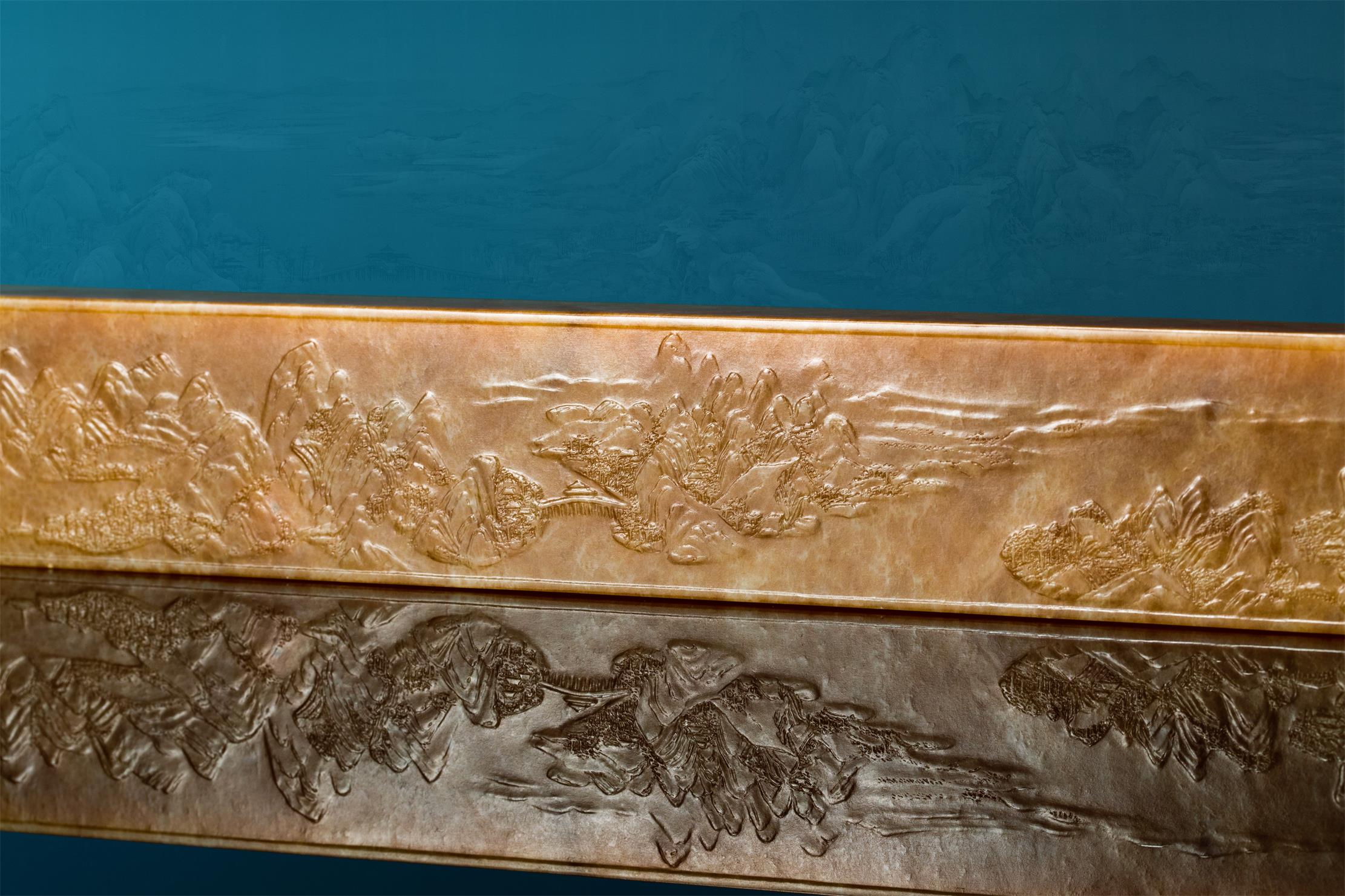 作者以刀作画,成功将原作以散点透视法绘就的六段独立又关联的青绿山水画,诗意般地精彩呈现,令人惊叹细腻润泽的析木玉红糖料所散发的金碧辉煌、宁静致远之独特气度,竟与作者刻画的恢宏山水如此浑然一体!不由重新审思玉雕创作新的灵感与创意的诗行。