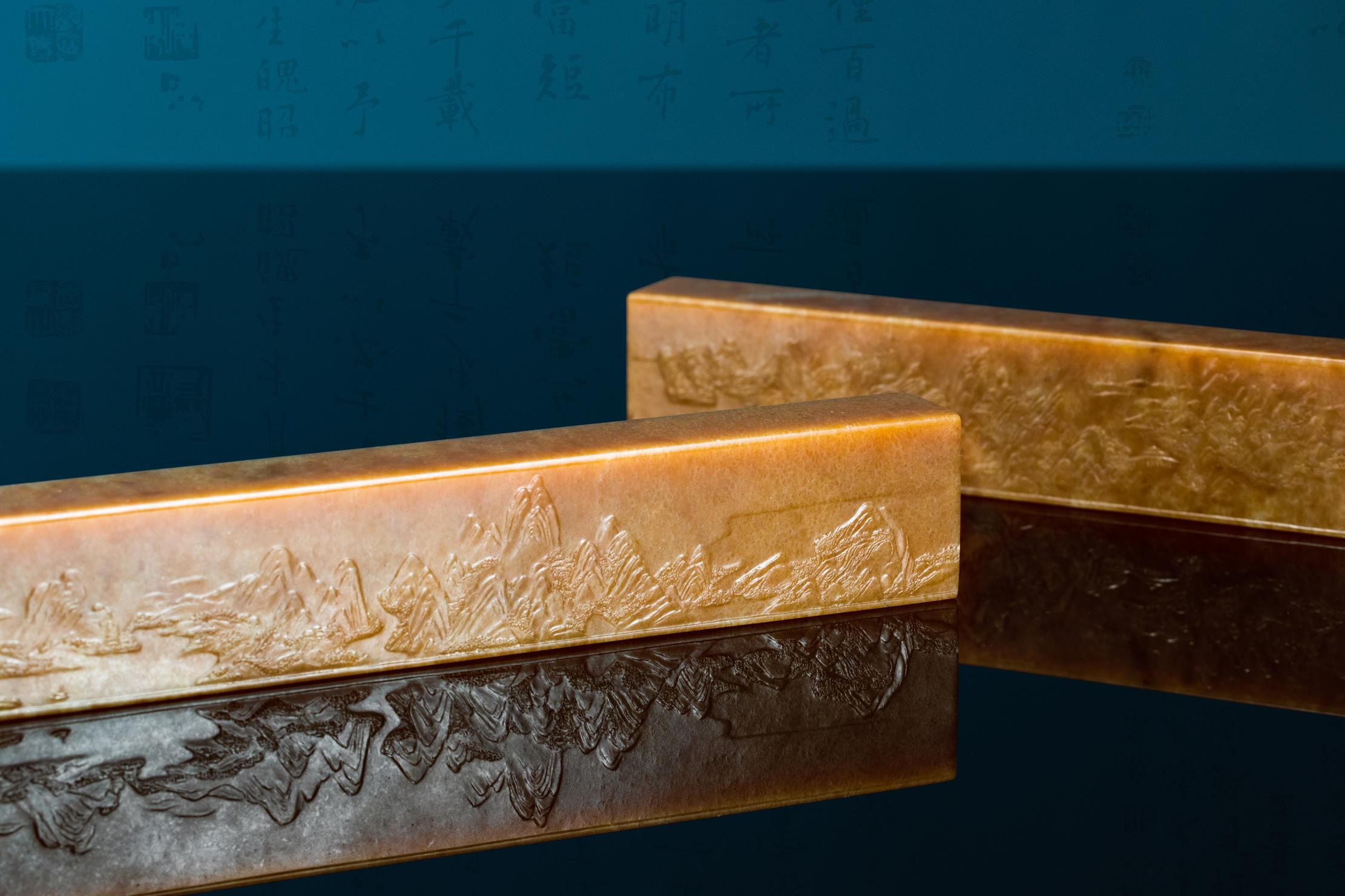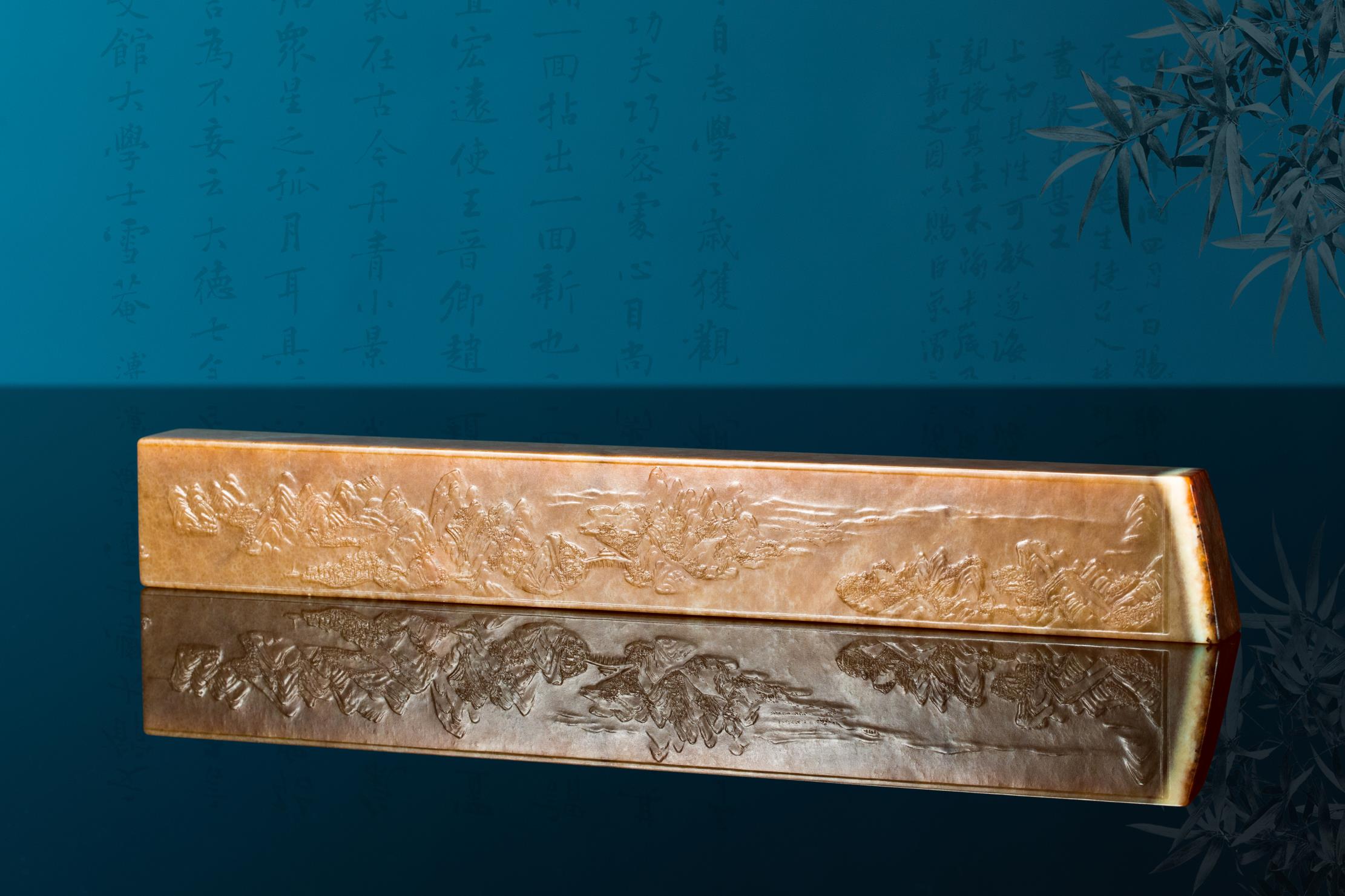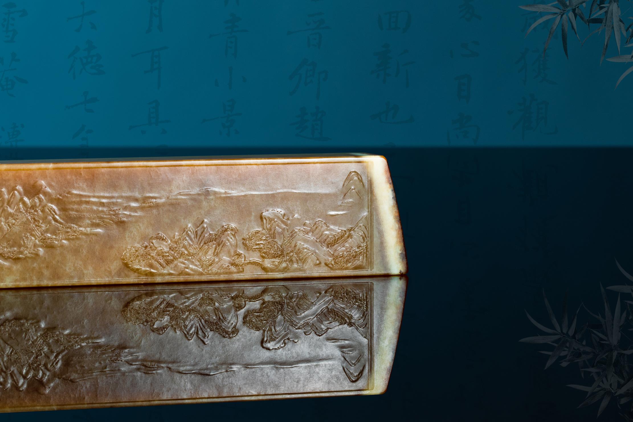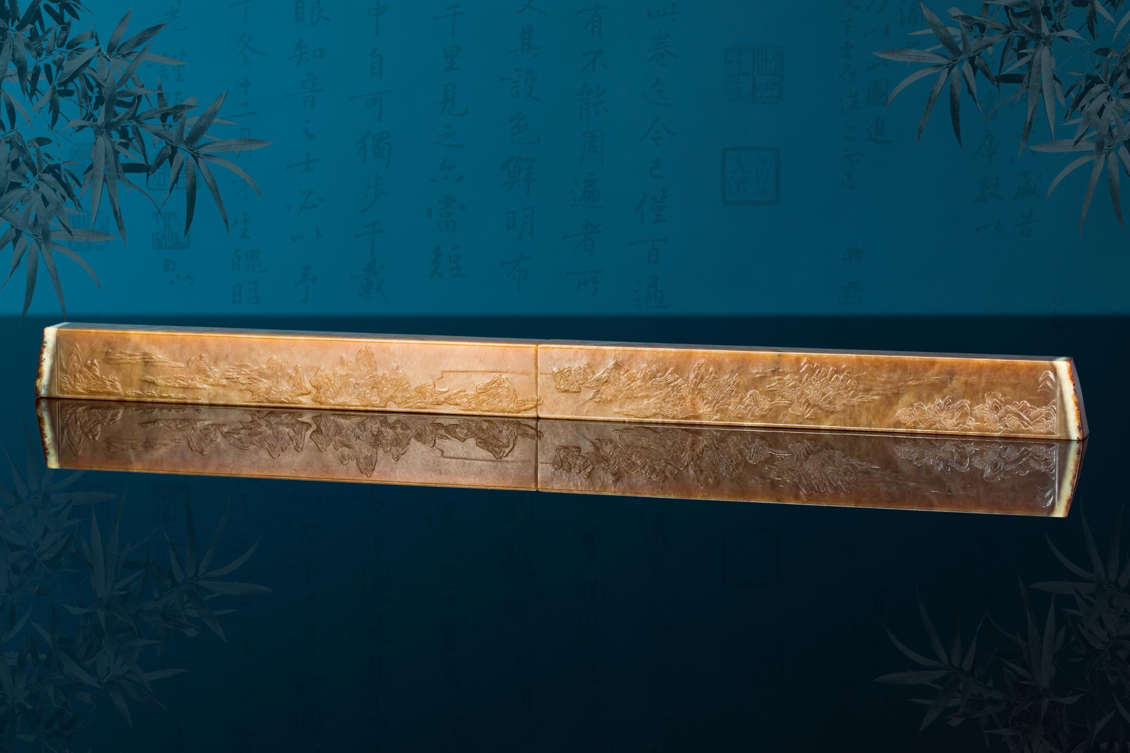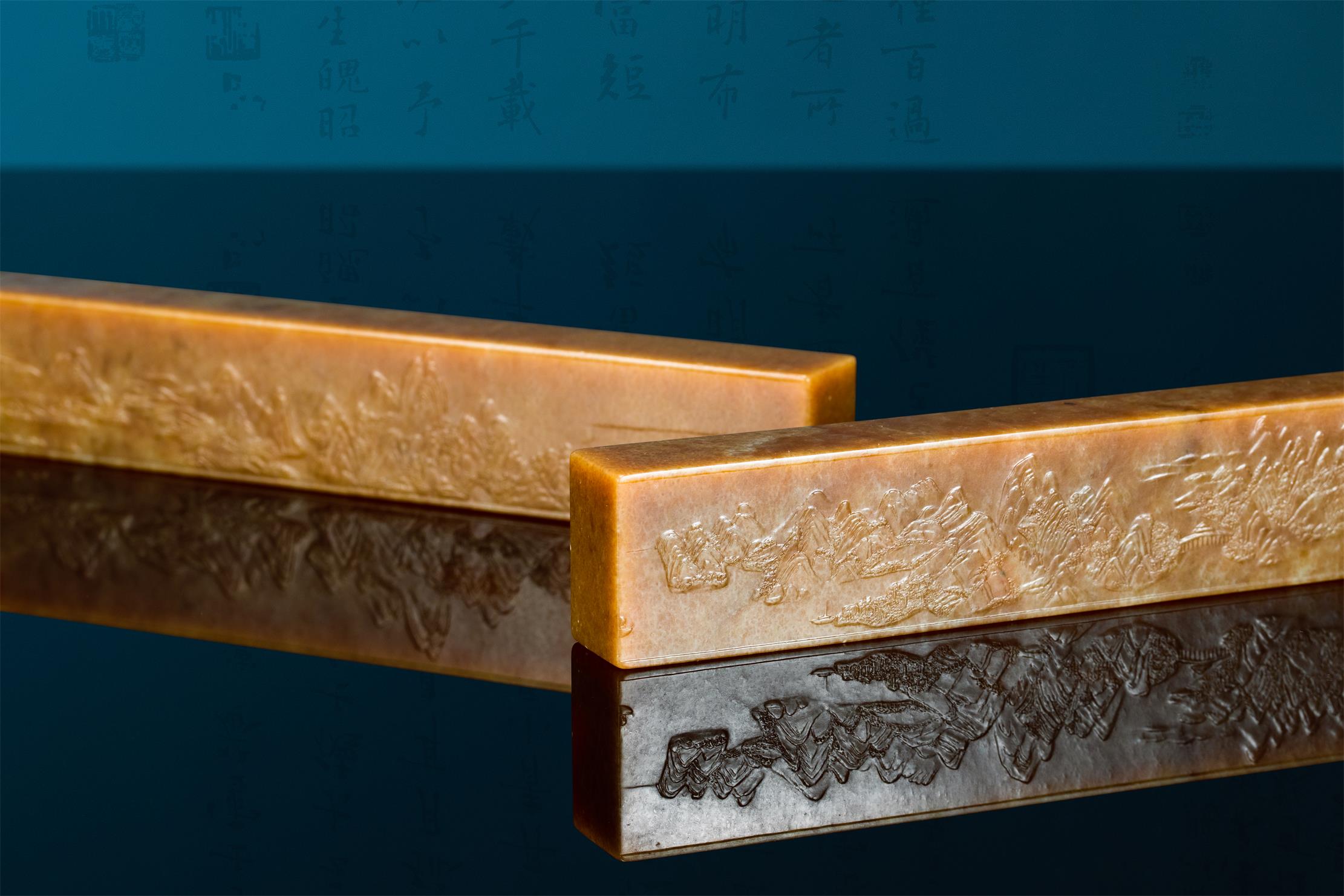 作者以刀作画,成功将原作以散点透视法绘就的六段独立又关联的青绿山水画,诗意般地精彩呈现,令人惊叹细腻润泽的析木玉红糖料所散发的金碧辉煌、宁静致远之独特气度,竟与作者刻画的恢宏山水如此浑然一体!不由重新审思玉雕创作新的灵感与创意的诗行。