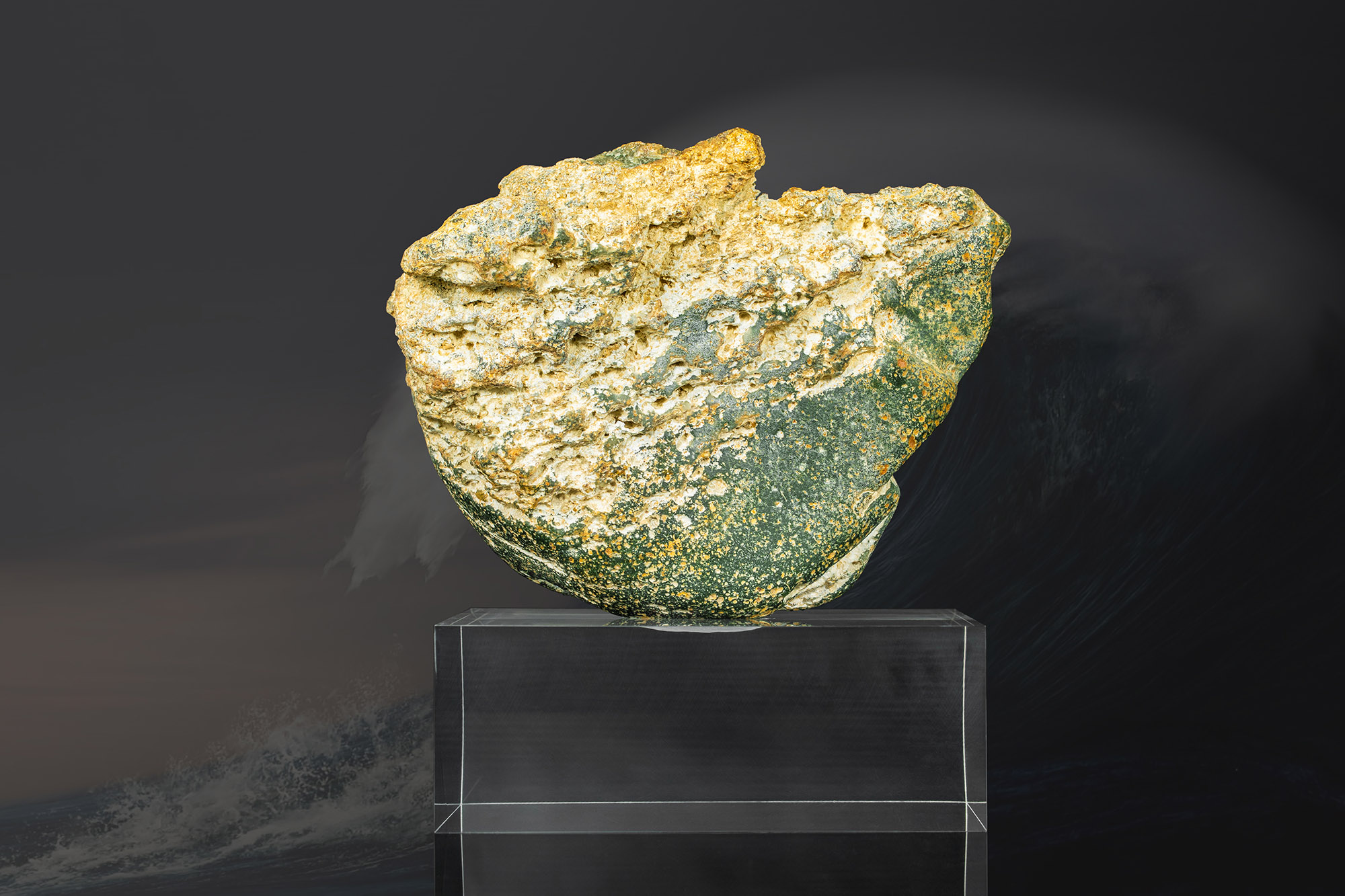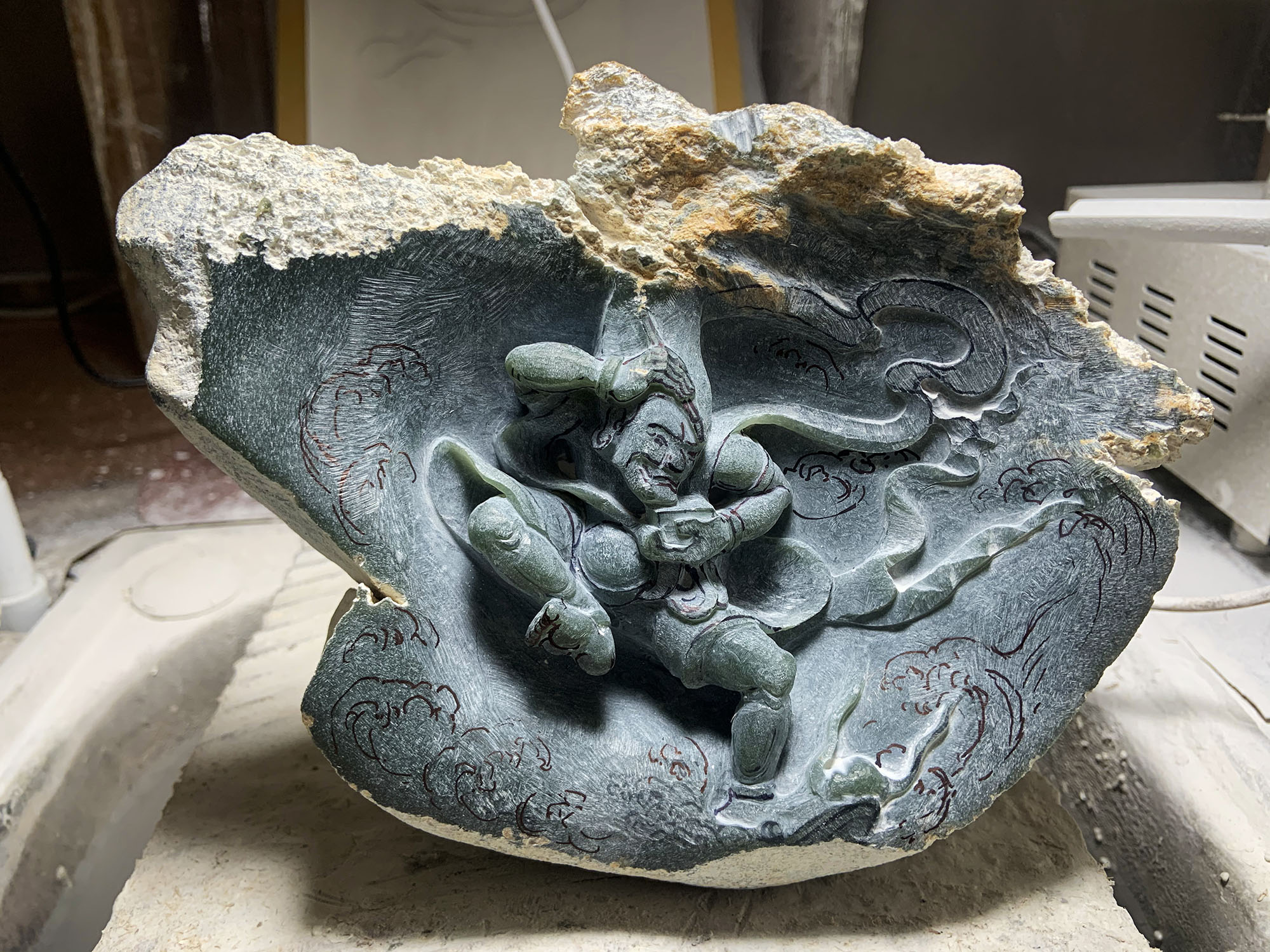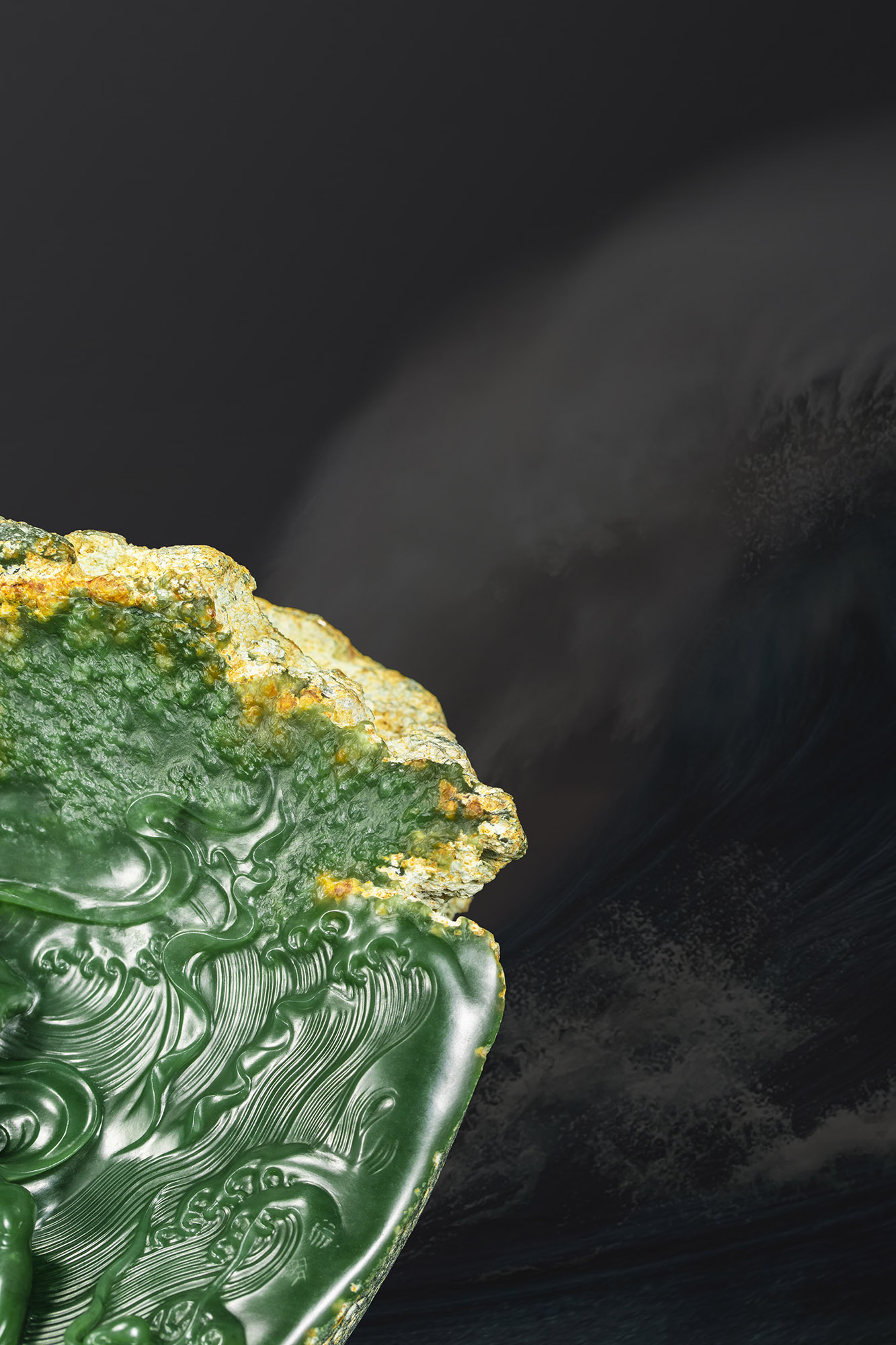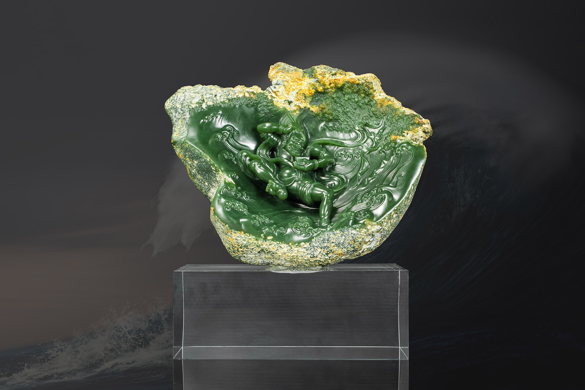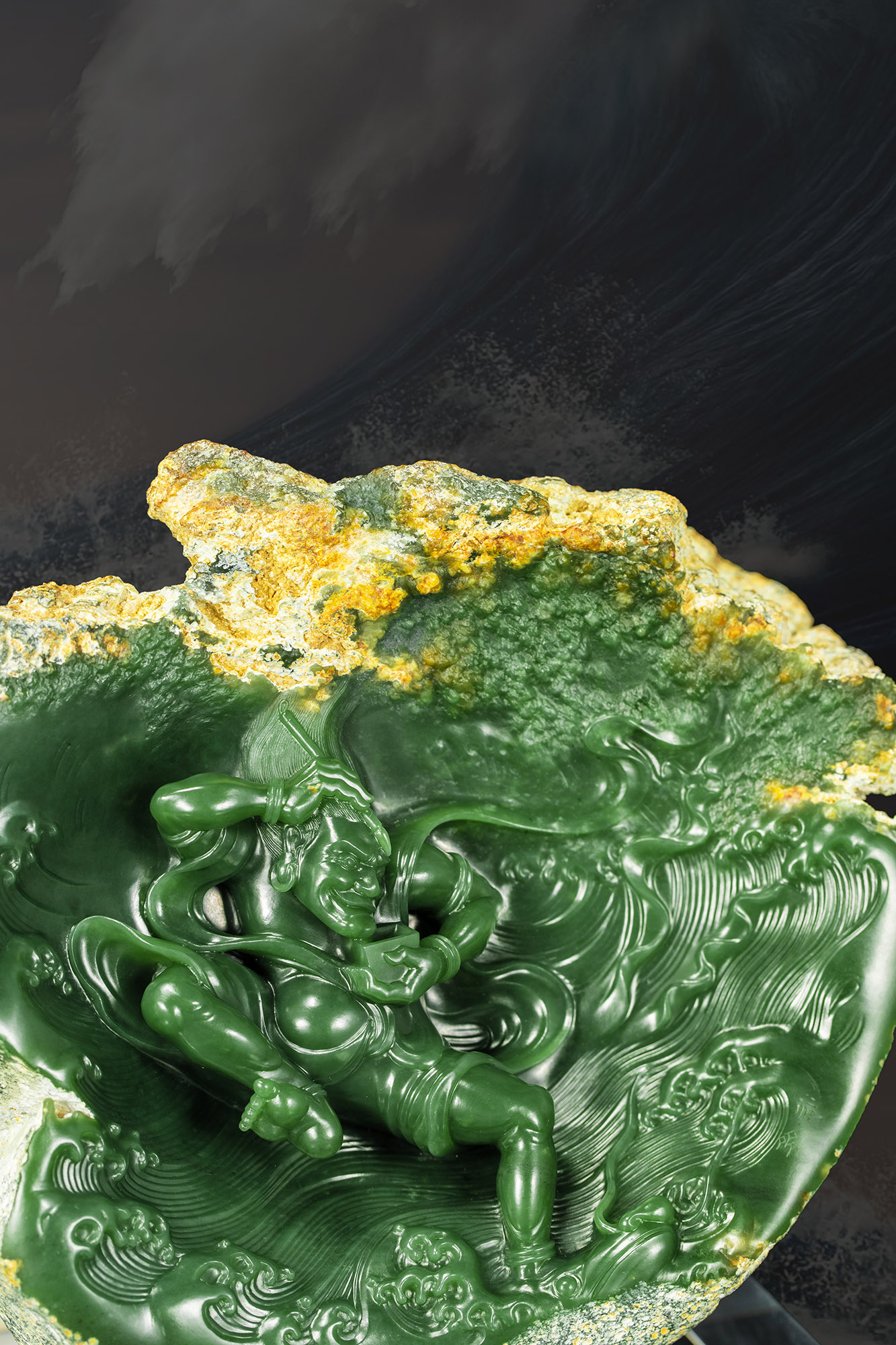 作者将一面天然皮色与不规则的自然形态予以保留,在另一面上进行开皮、设计与雕琢,通过镂雕和阳刻等技法,展现出浪花层层卷涌的磅礴之势,突出画面上举足单立于鳌头之魁星执笔点斗的生动之姿。