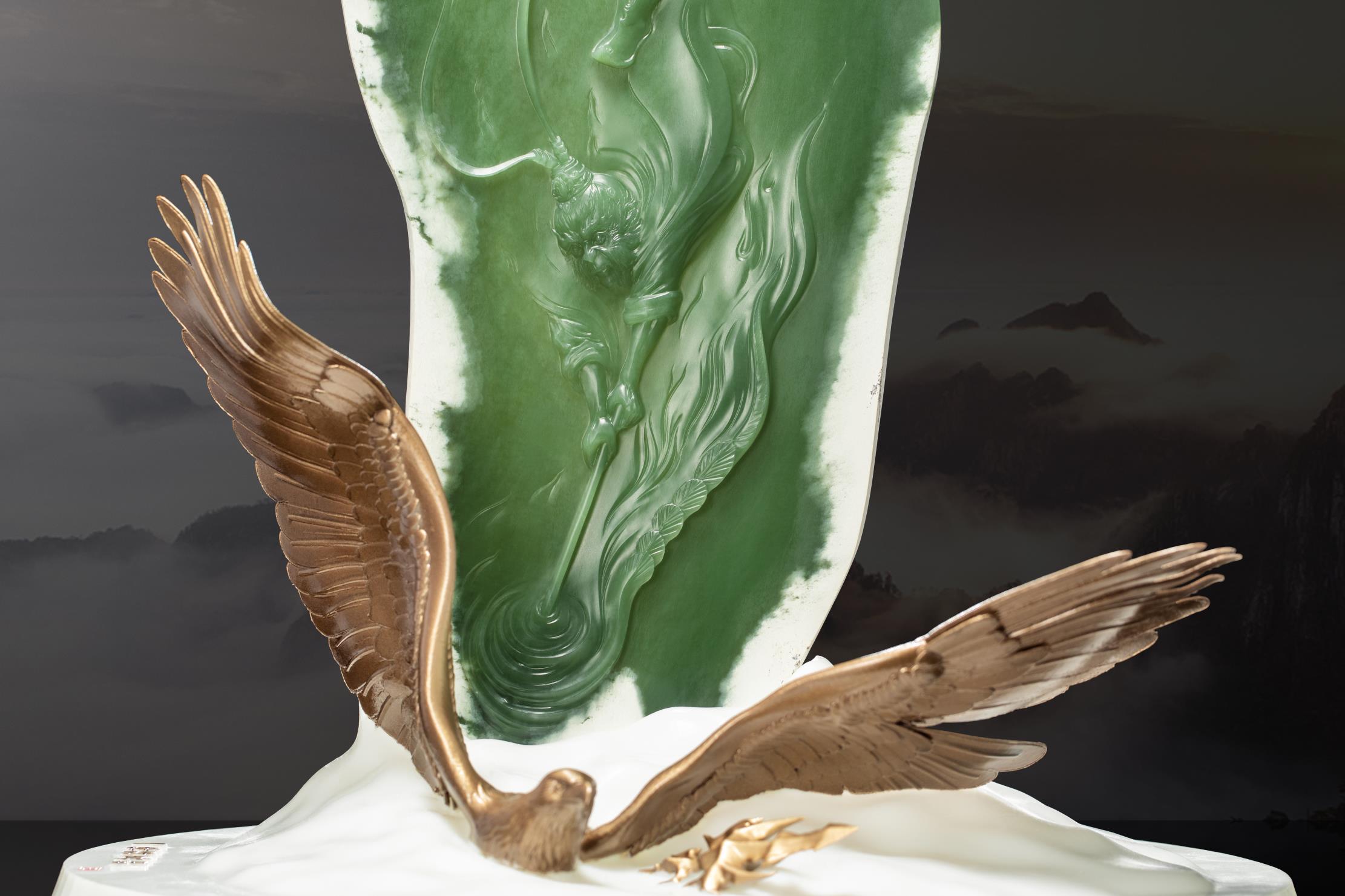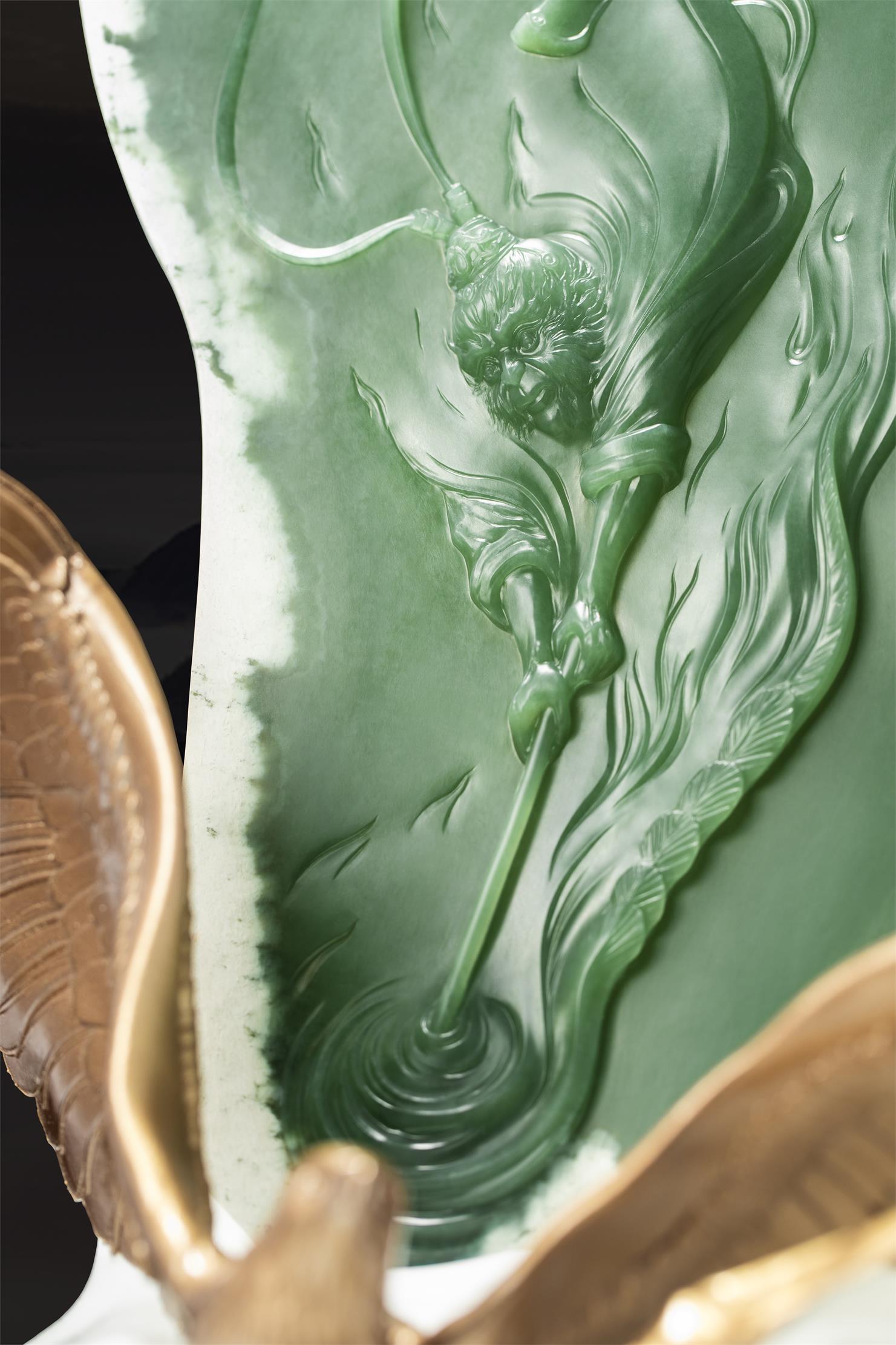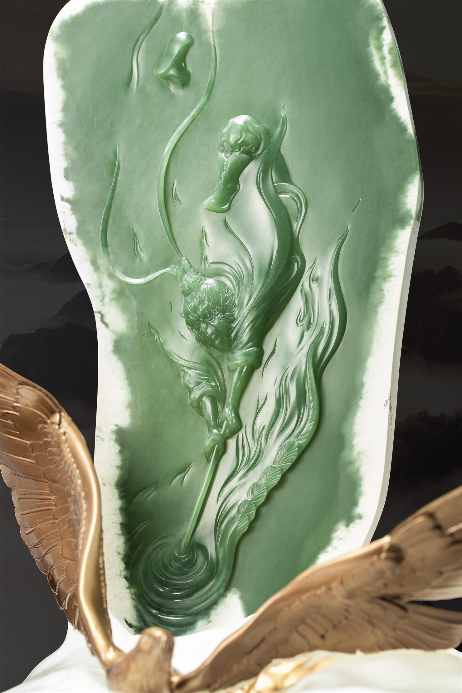 大鹏金翅雕惊险地躲过孙悟空奋力砸来的金箍棒,舒展翅膀,击穿白云,冲出玉面,凝固在底座上。