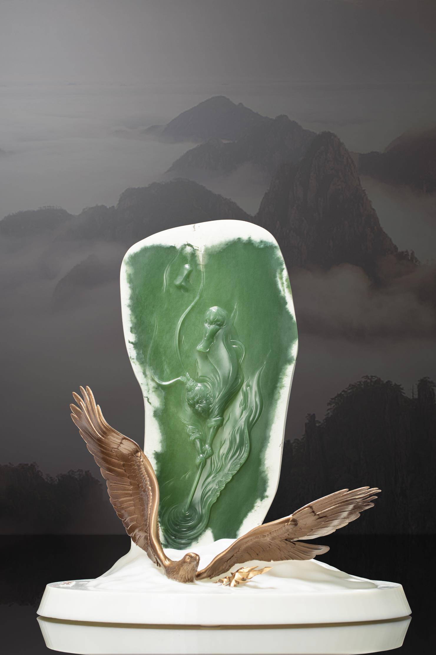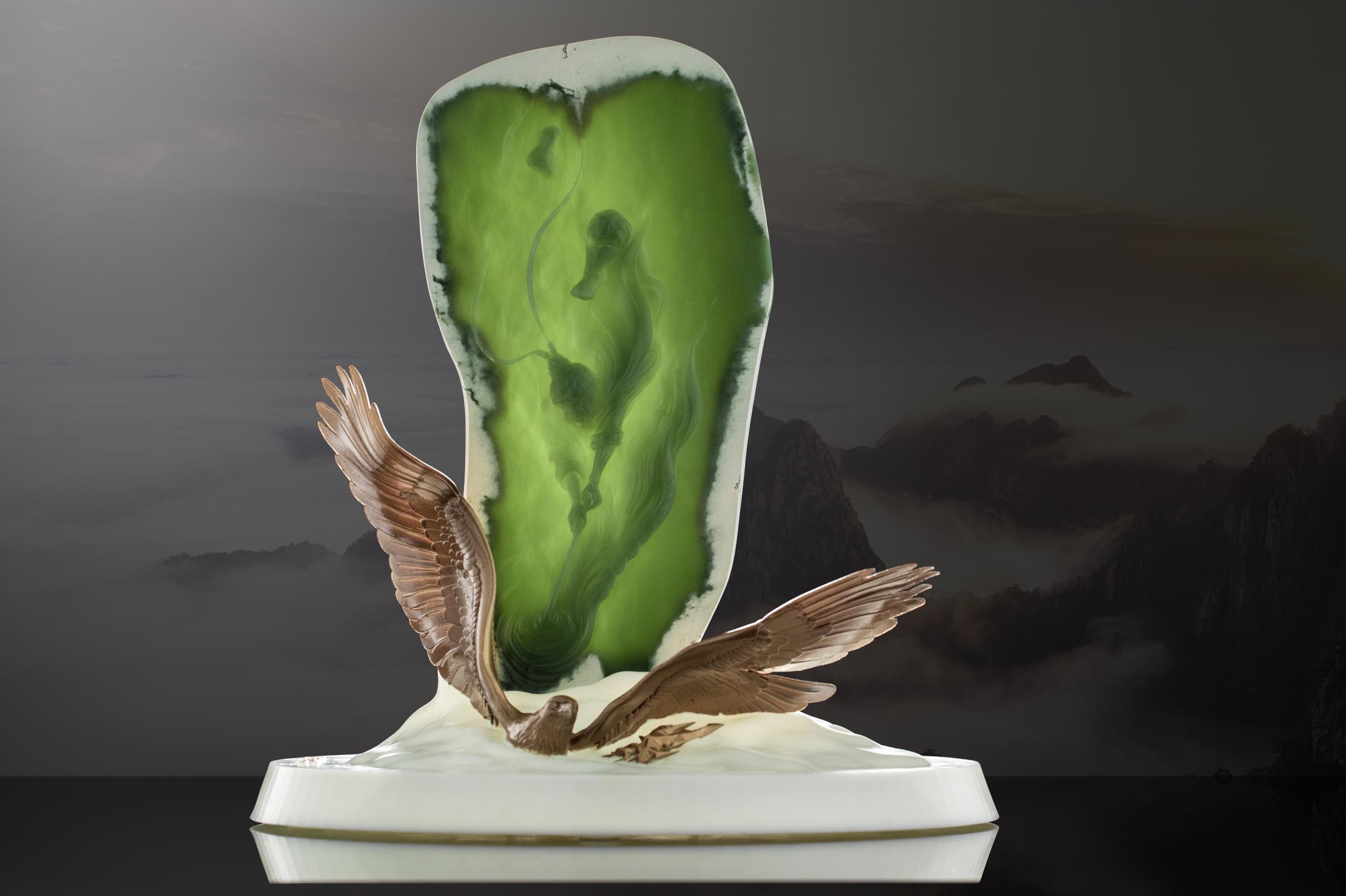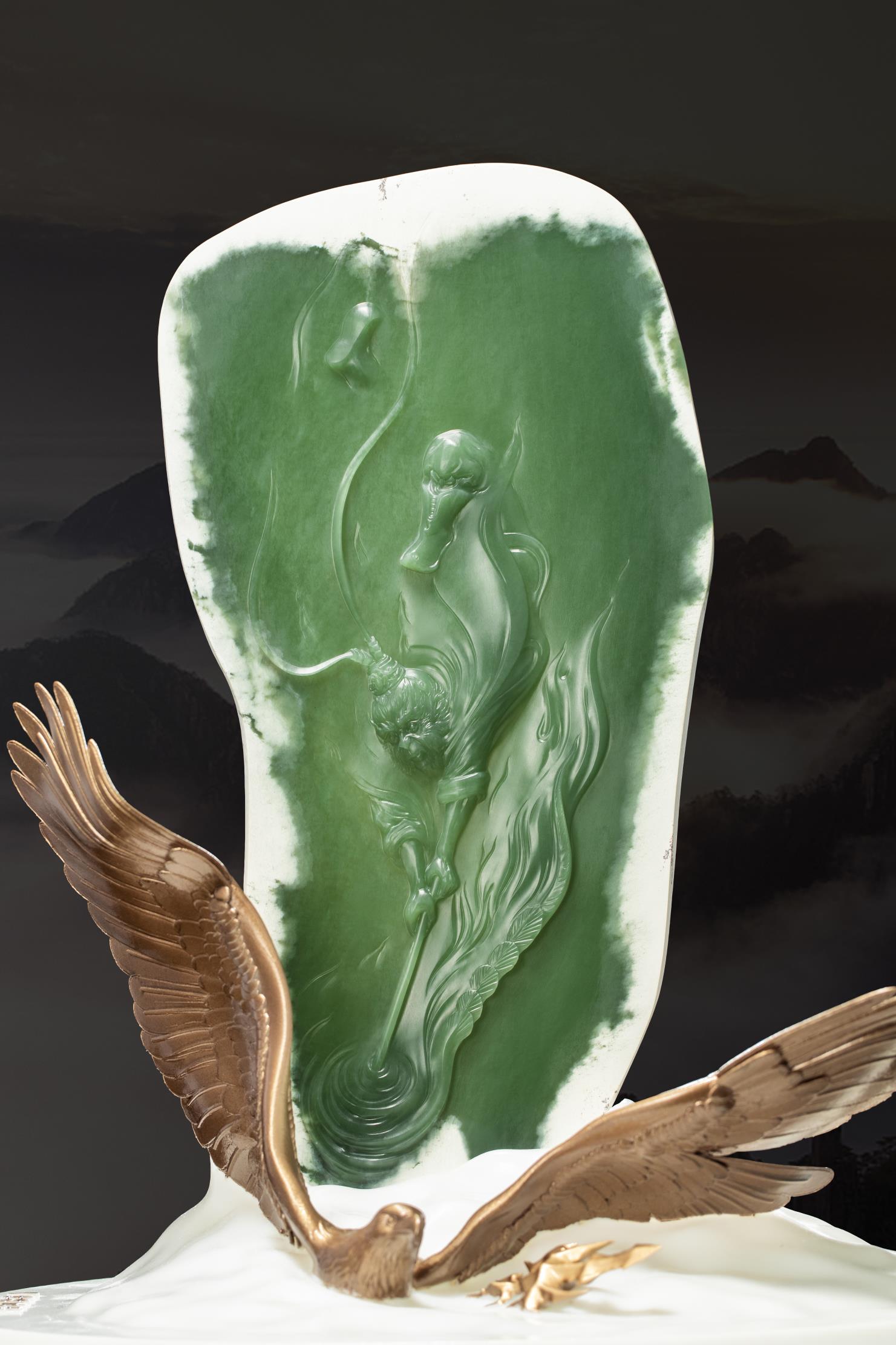 大鹏金翅雕惊险地躲过孙悟空奋力砸来的金箍棒,舒展翅膀,击穿白云,冲出玉面,凝固在底座上。