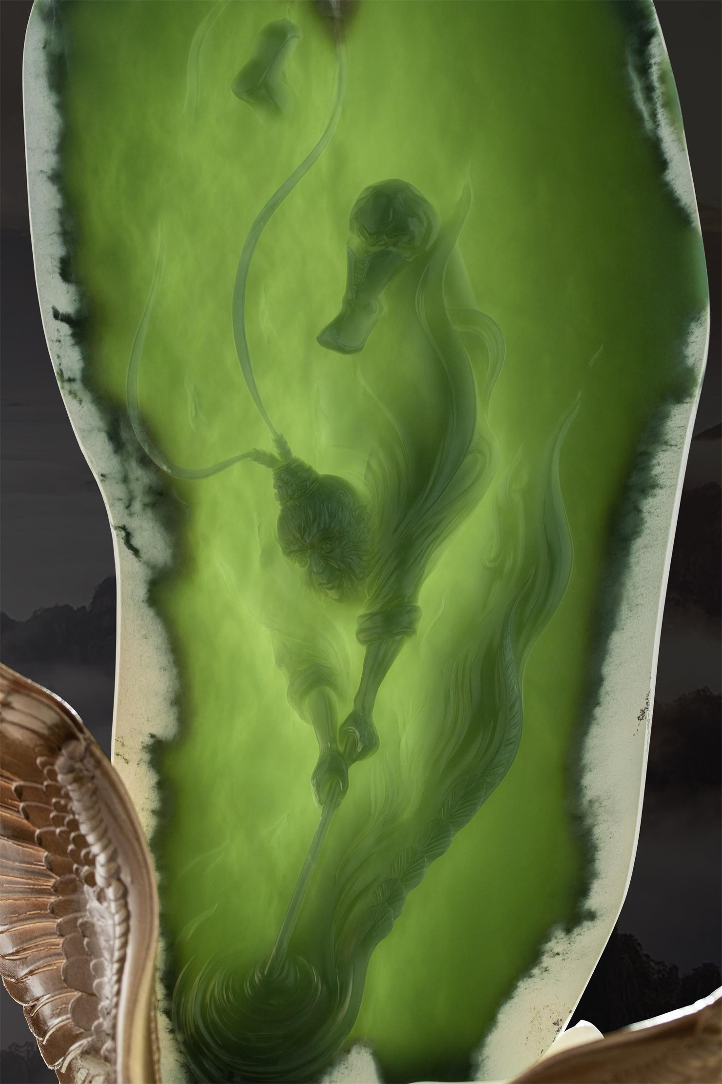 中国玉石雕刻大师刘忠山,在不规则的方形白皮析木玉料上,再琢齐天大圣玉书系列之《一体拜真如》。