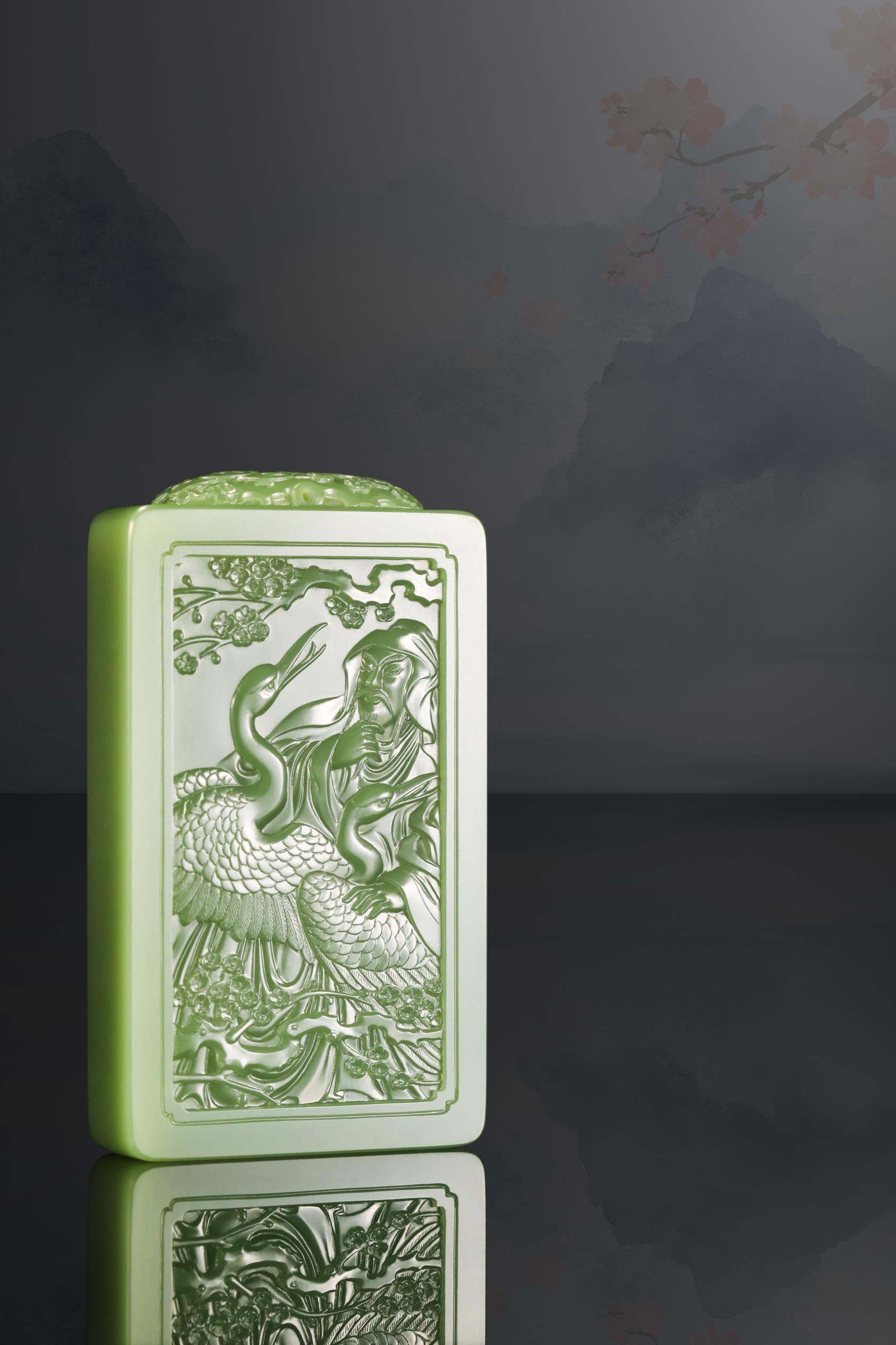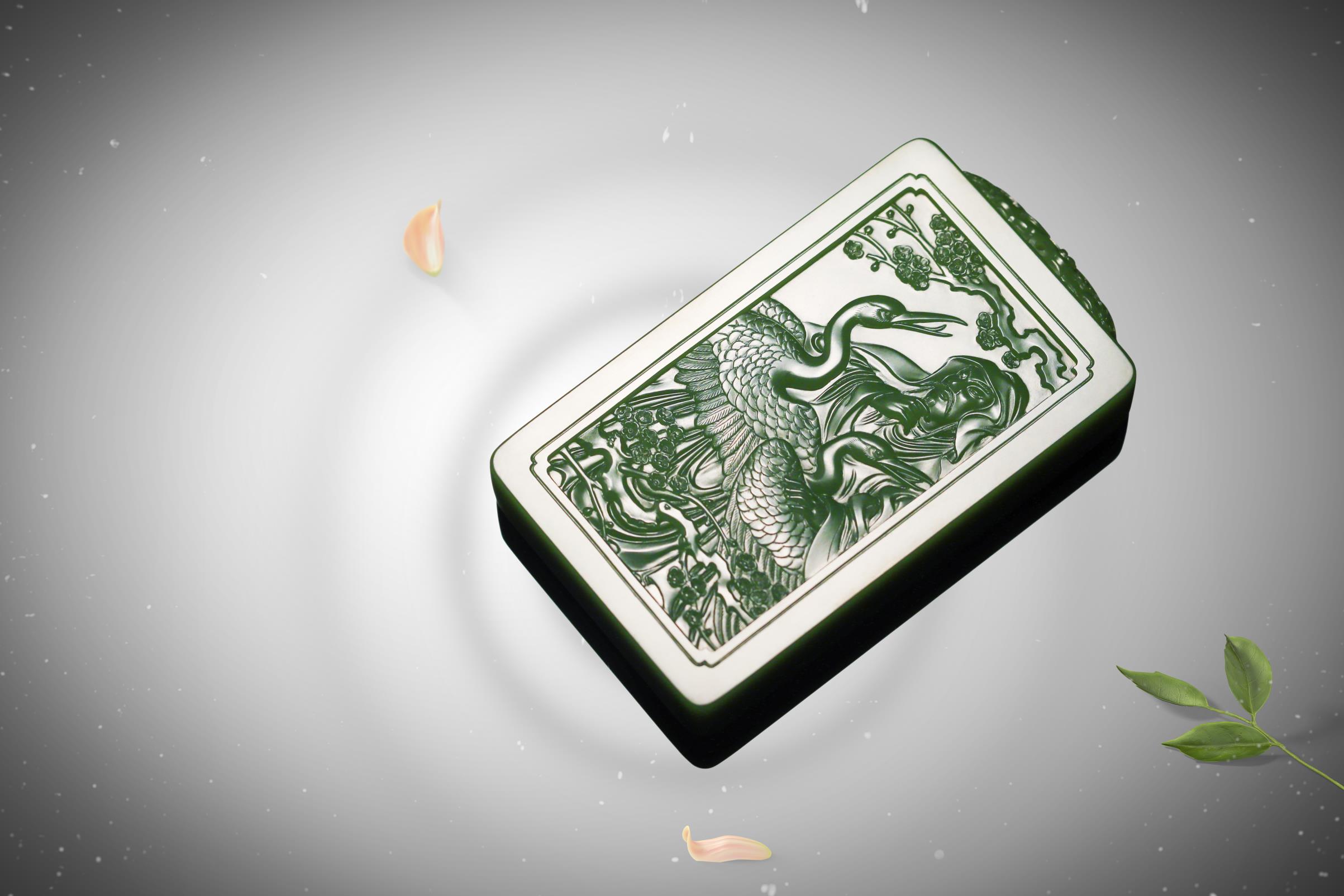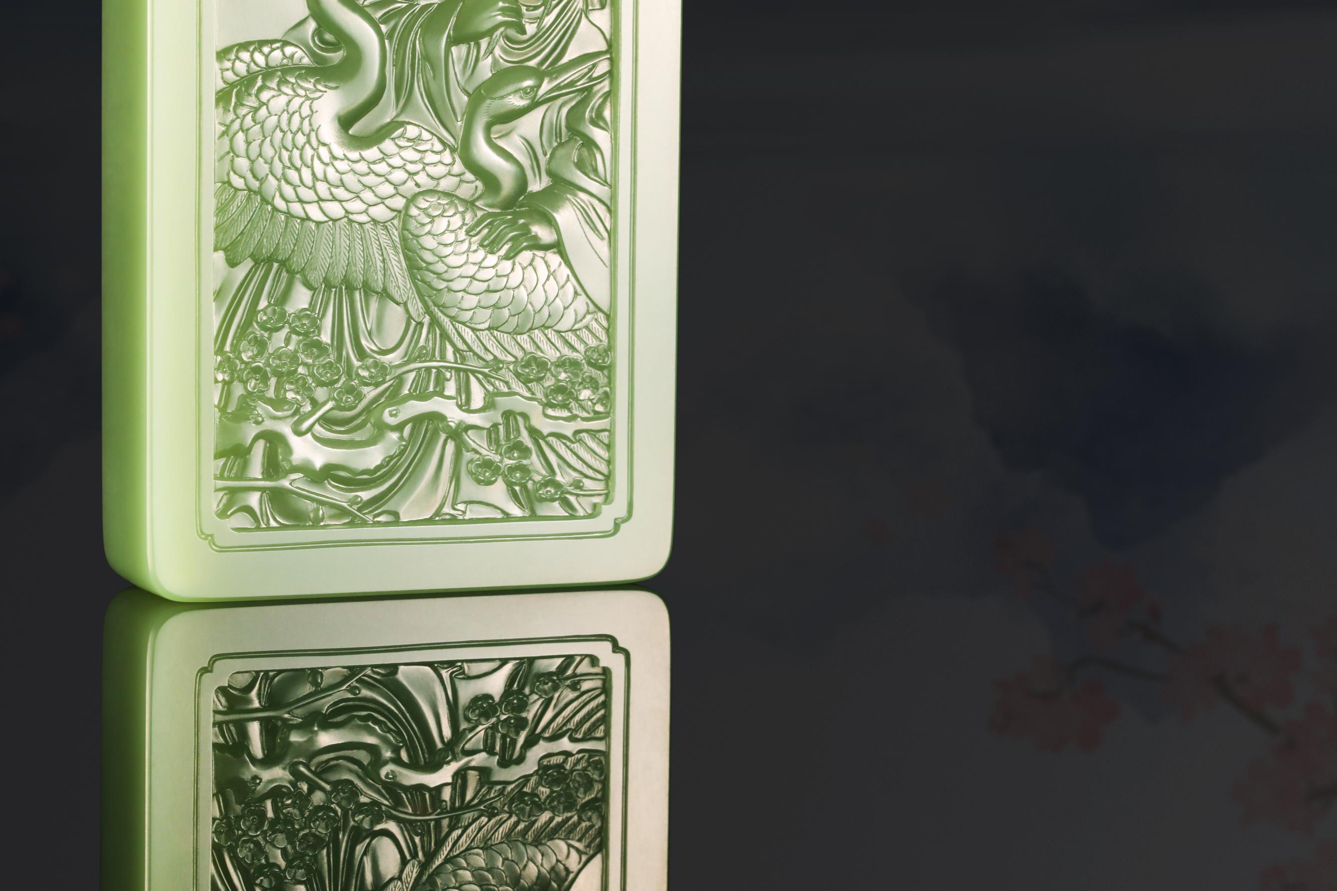 中国玉石雕刻大师、国家级非物质文化遗产(海派玉雕)代表性传承人翟倚卫,继承了文人对于诗境、格调、品位的追求,以刀为笔,书写自然之道、精神之趣。他雕刻的《暗香浮动》玉牌,彰显出林逋的仙风道骨,梅花的清妍恬淡,双鹤的亲和灵俊。