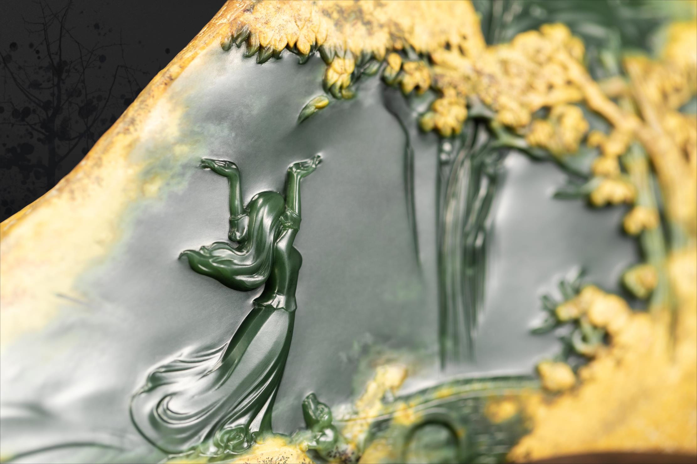 作者柔婉曲劲的刻画线条,与析木玉的细腻润净、色泽浓郁,共同成就了女子长裙的丝滑与飘垂感,修饰出人物身姿的清雅与曼妙。