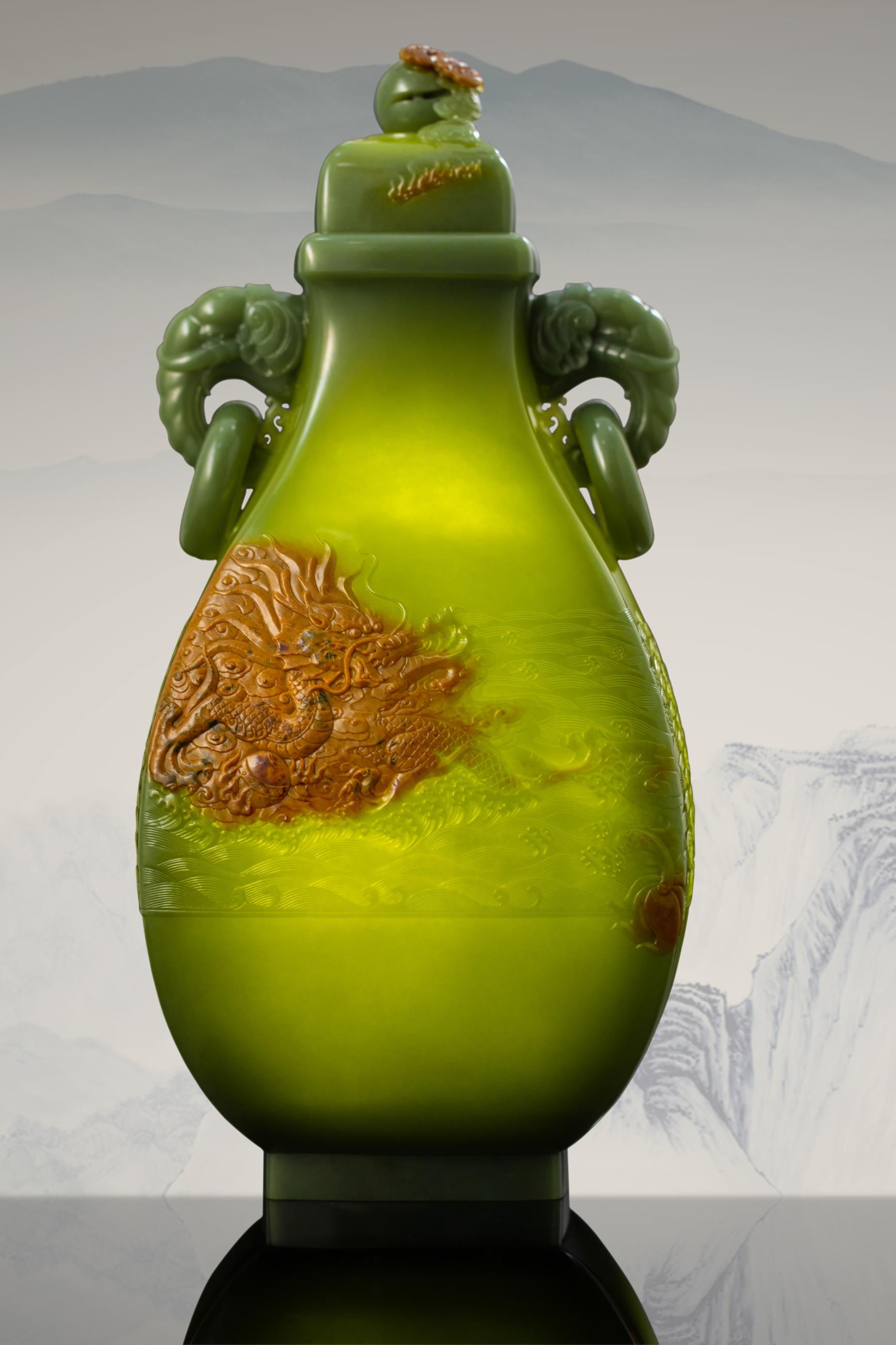 析木玉天然的几处浓艳俏色,被作者以匠心巧运成瓶身一侧的飞龙和瓶盖上的一簇红红的太阳火焰。