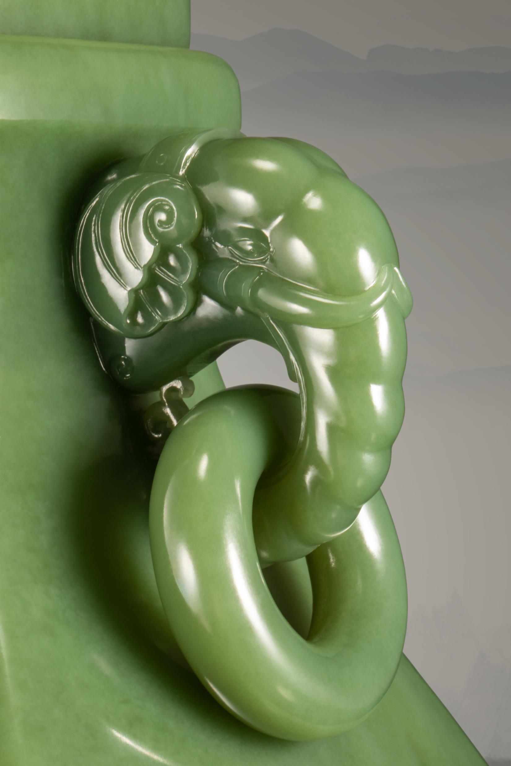 王金高大师借鉴青铜器中鼎的造型,将细腻如脂的黄绿色析木玉,打造成四边有棱、上窄下鼓、兽耳成双的瓶器。