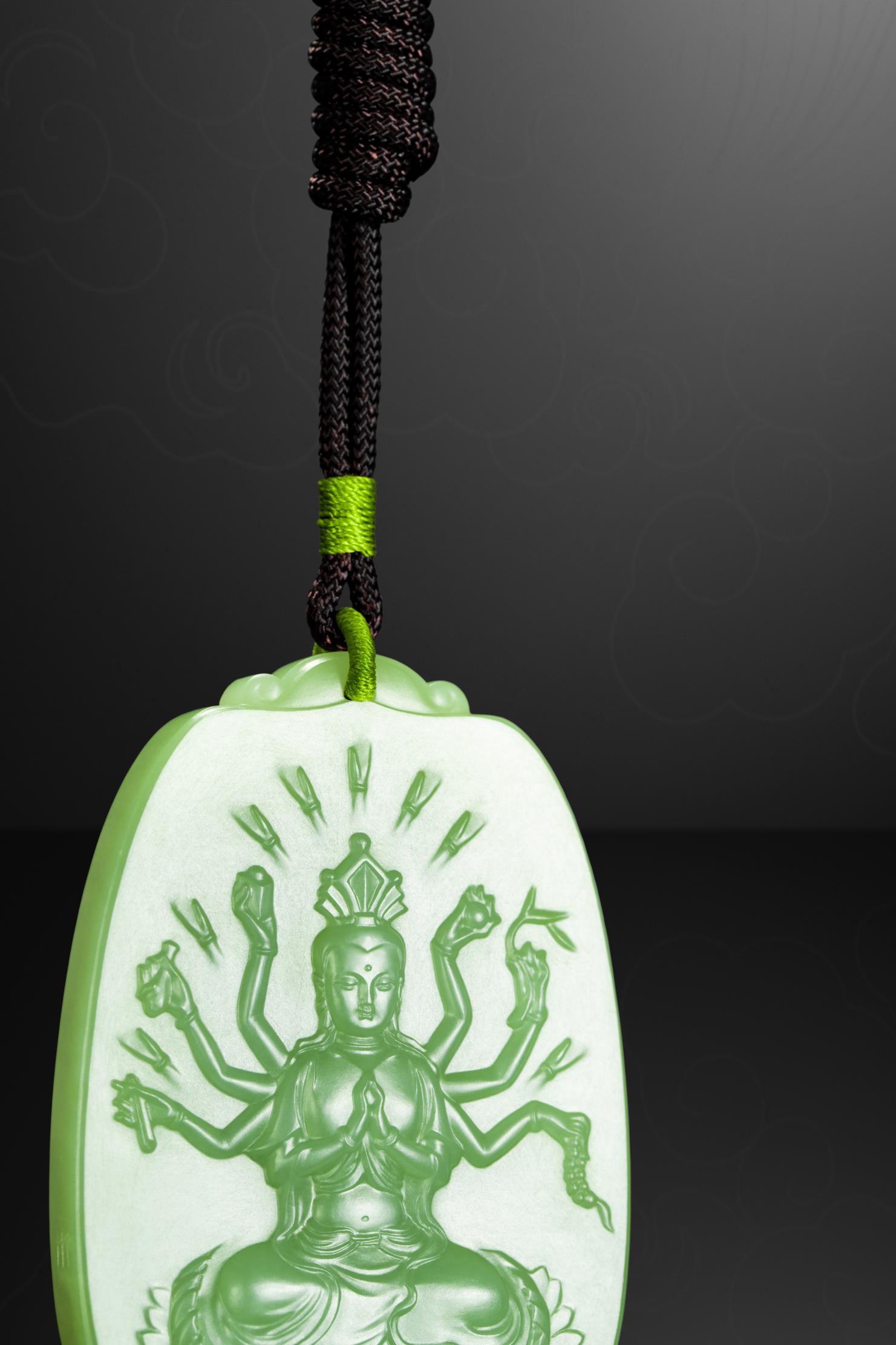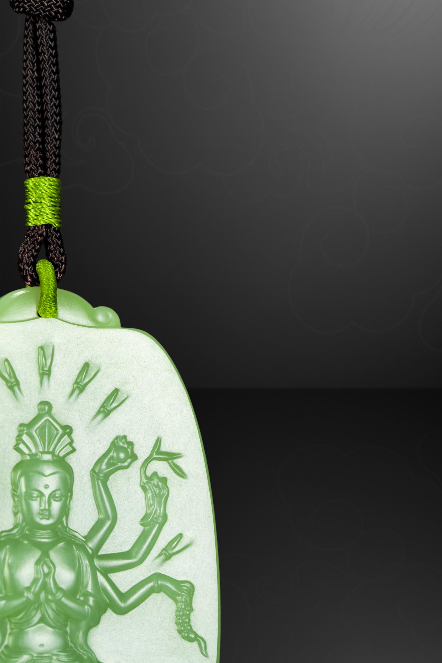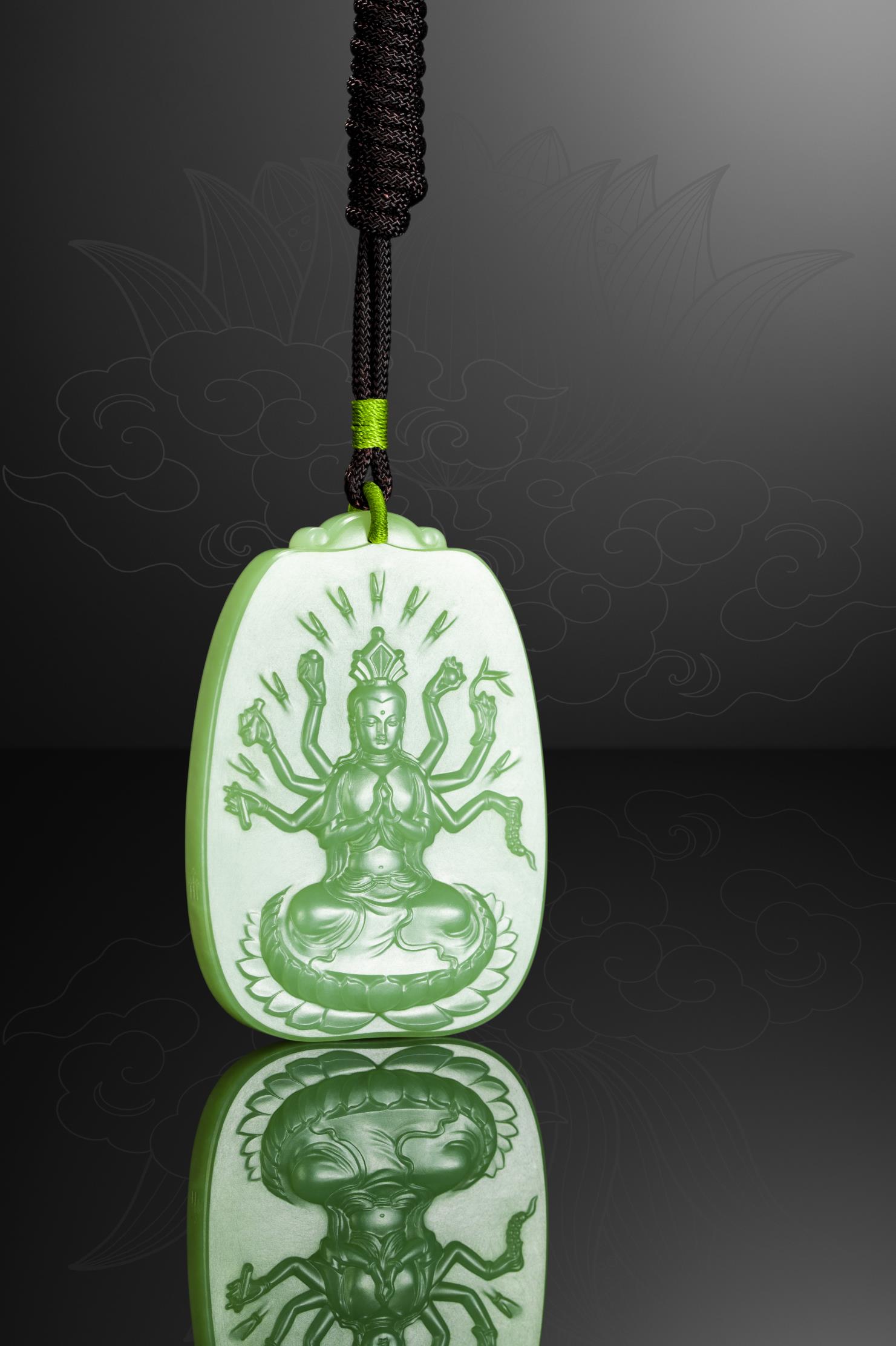 中国玉石雕刻大师赵泽民,以清净之修行心,在细腻、润泽、素净的析木玉上,创作了颇有意境与禅韵的《千手观音》玉牌,给人放下自我、烦恼尽消和慈爱众生、淡泊无争的开悟与净化。