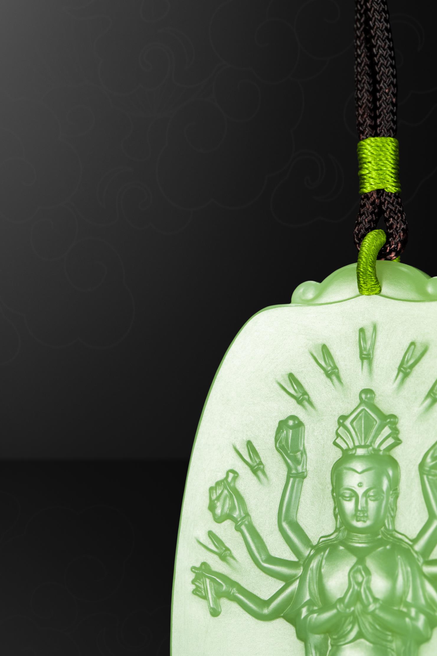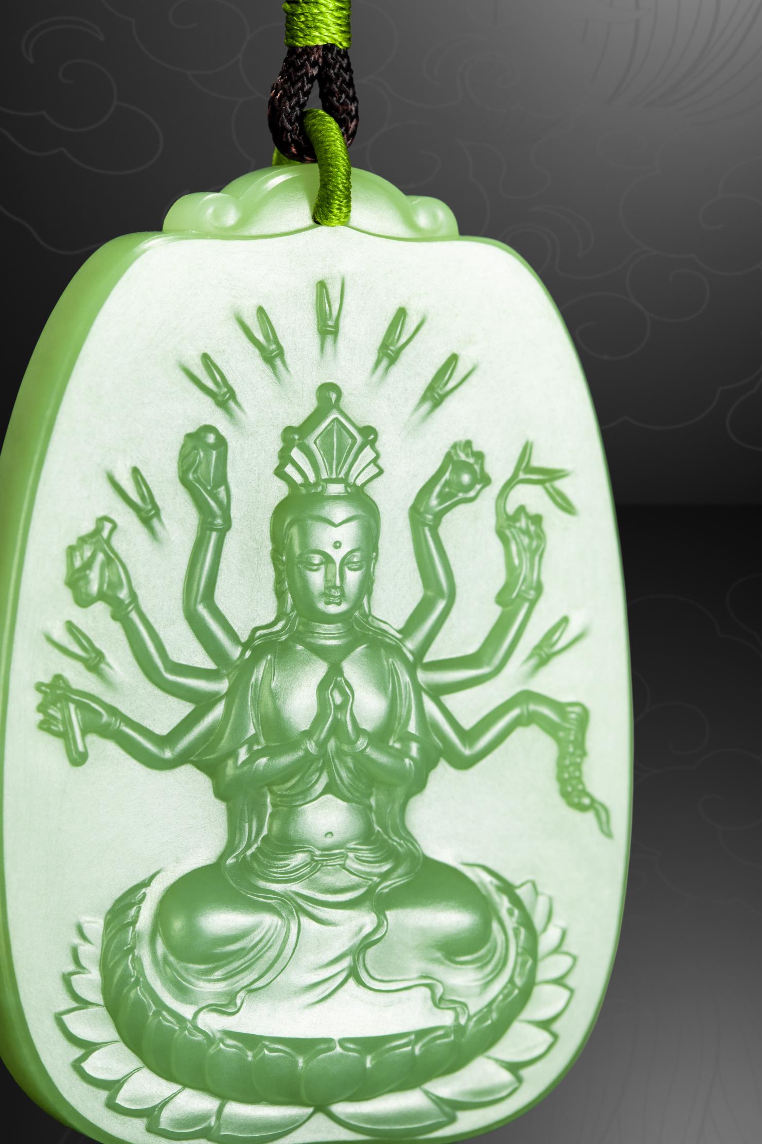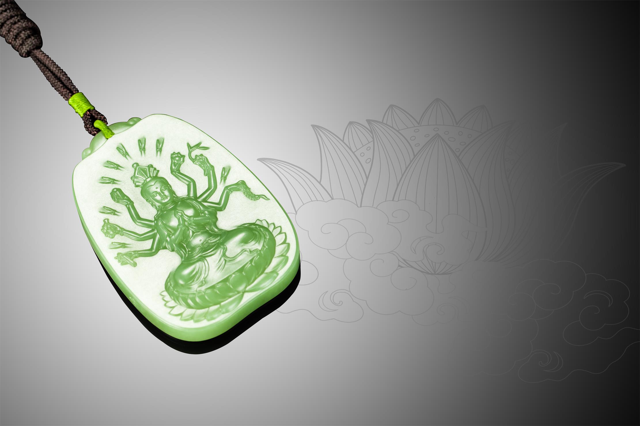 中国玉石雕刻大师赵泽民,以清净之修行心,在细腻、润泽、素净的析木玉上,创作了颇有意境与禅韵的《千手观音》玉牌,给人放下自我、烦恼尽消和慈爱众生、淡泊无争的开悟与净化。