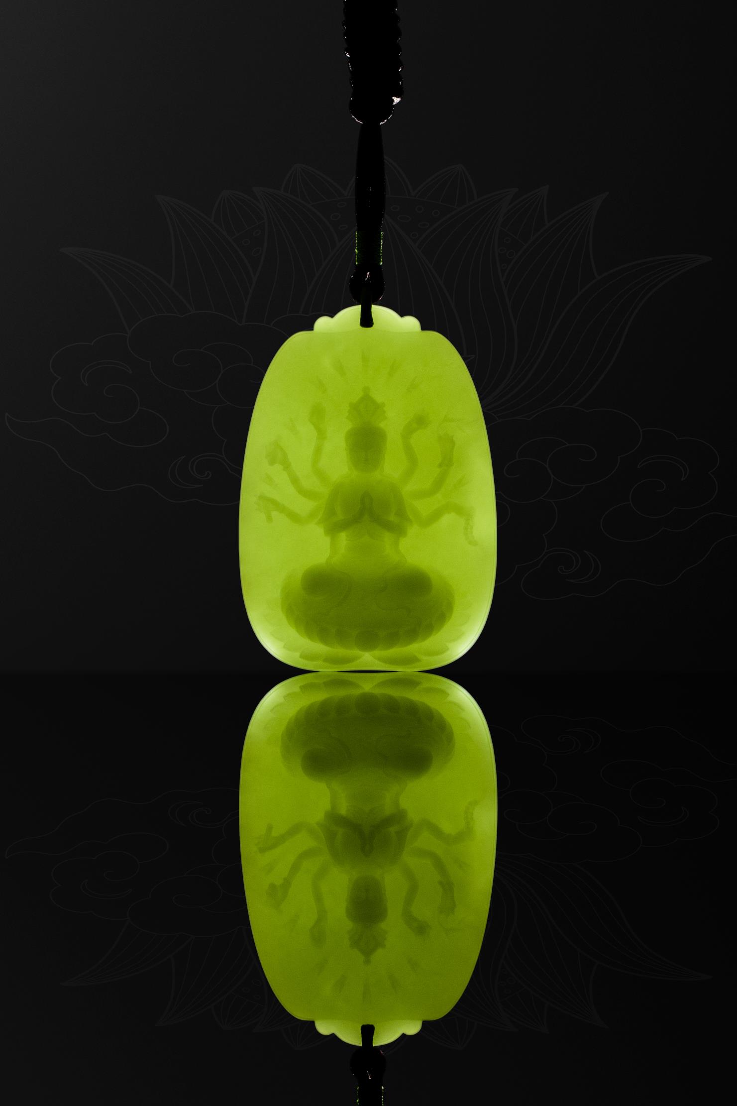 作者将千手观音之端坐莲台之像设计于玉牌正中,并将略显方形的规整玉料打磨得圆融光亮,配上秀巧的牌头,以极简工表现一种含蓄、端庄的美。